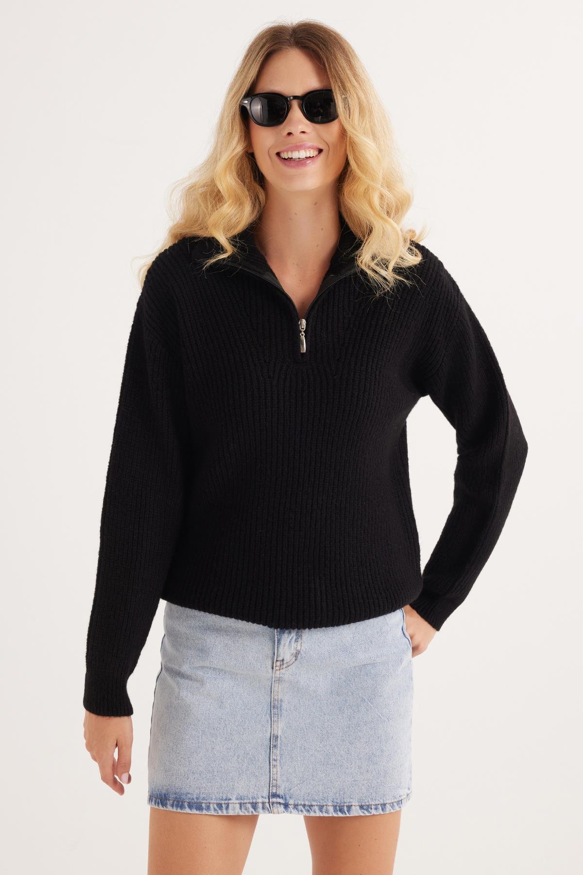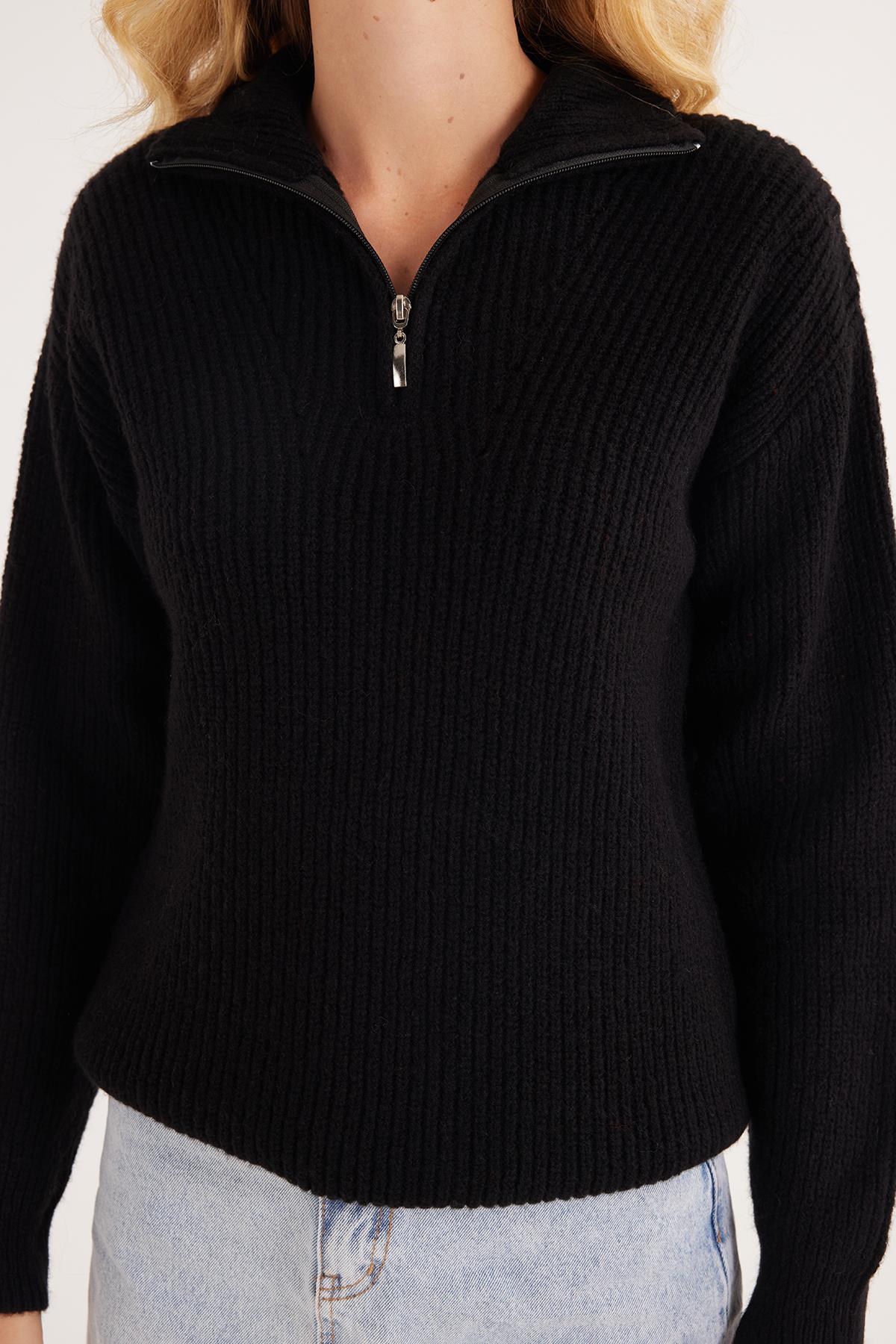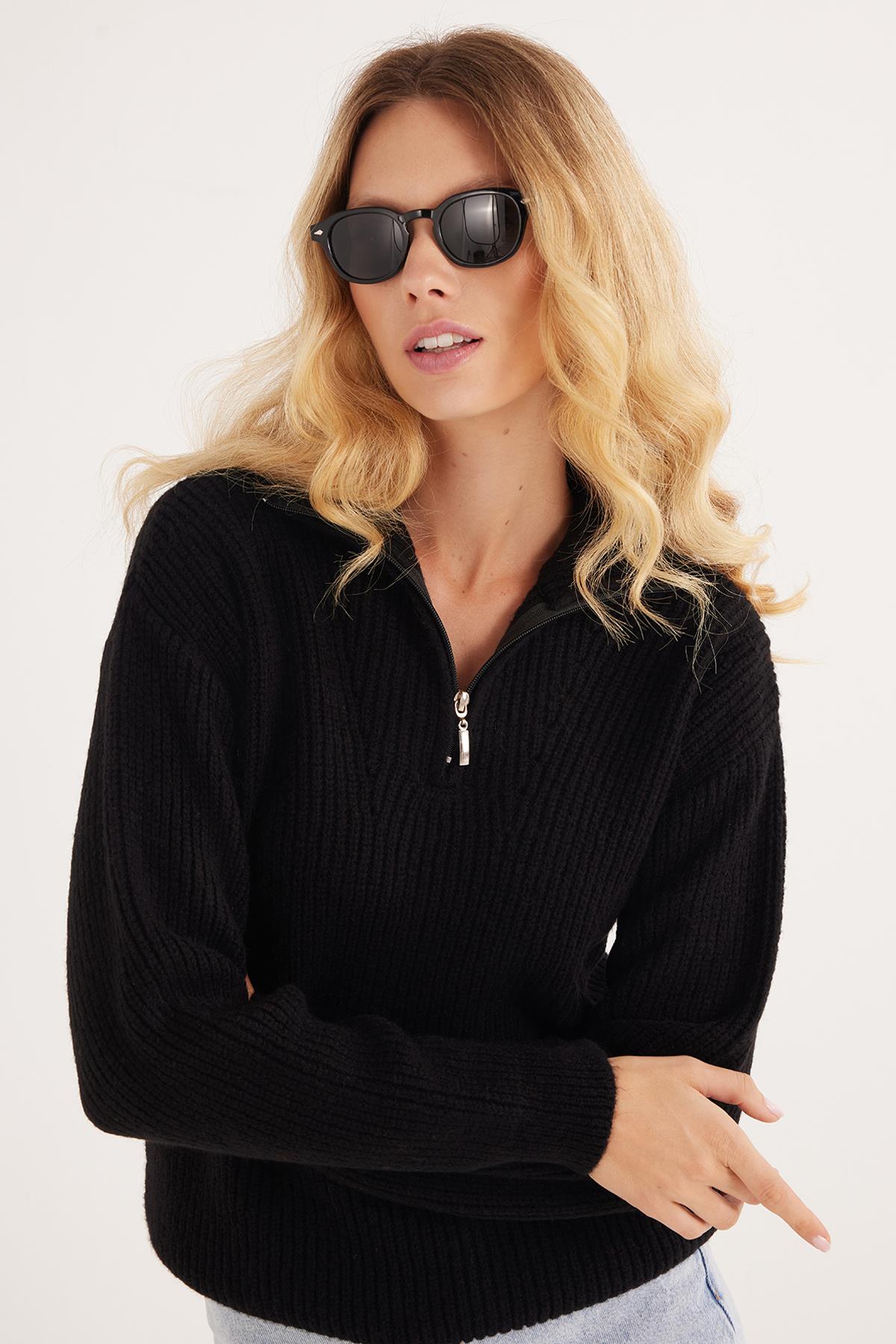 Kadın Oversize Geniş Kesim Dokumalı Fermuarlı Yaka Siyah Kazak (BYKZ2512-02)
