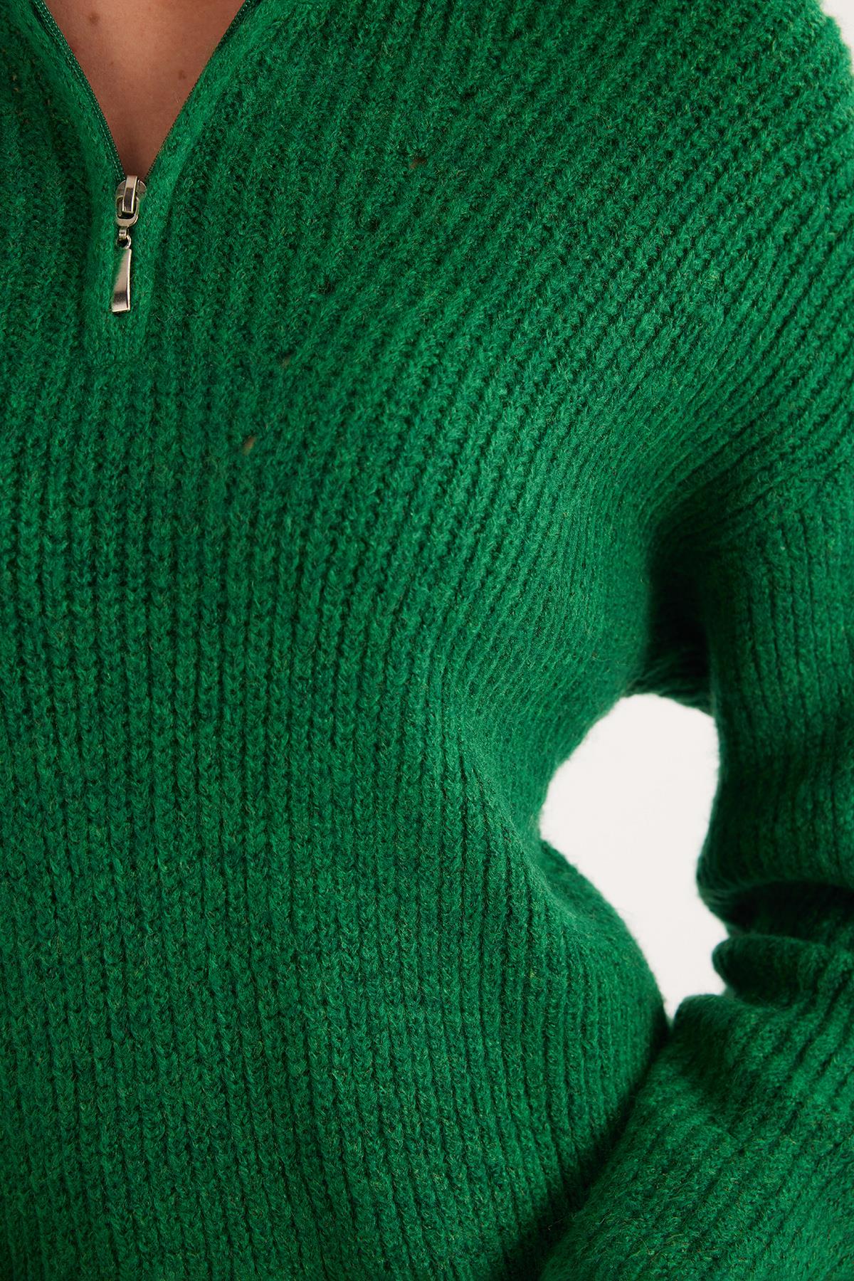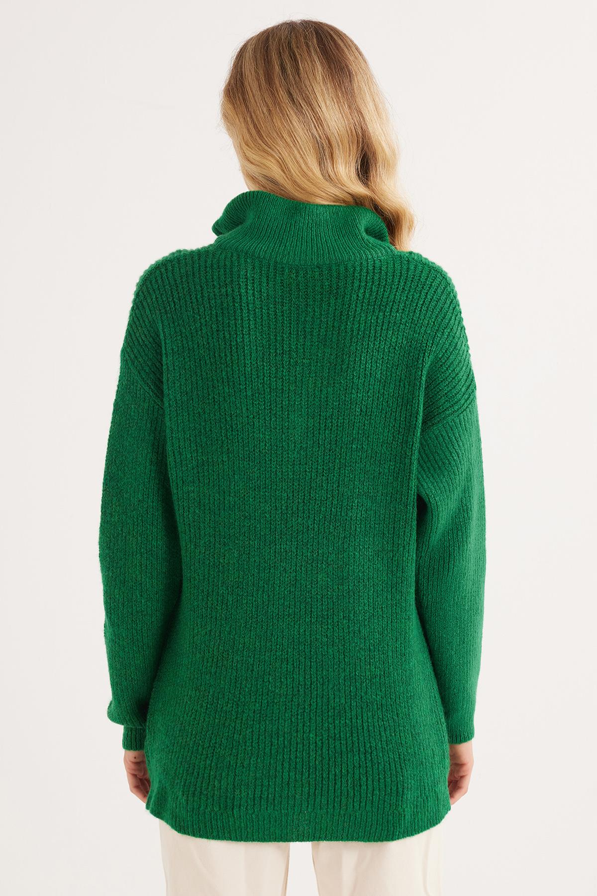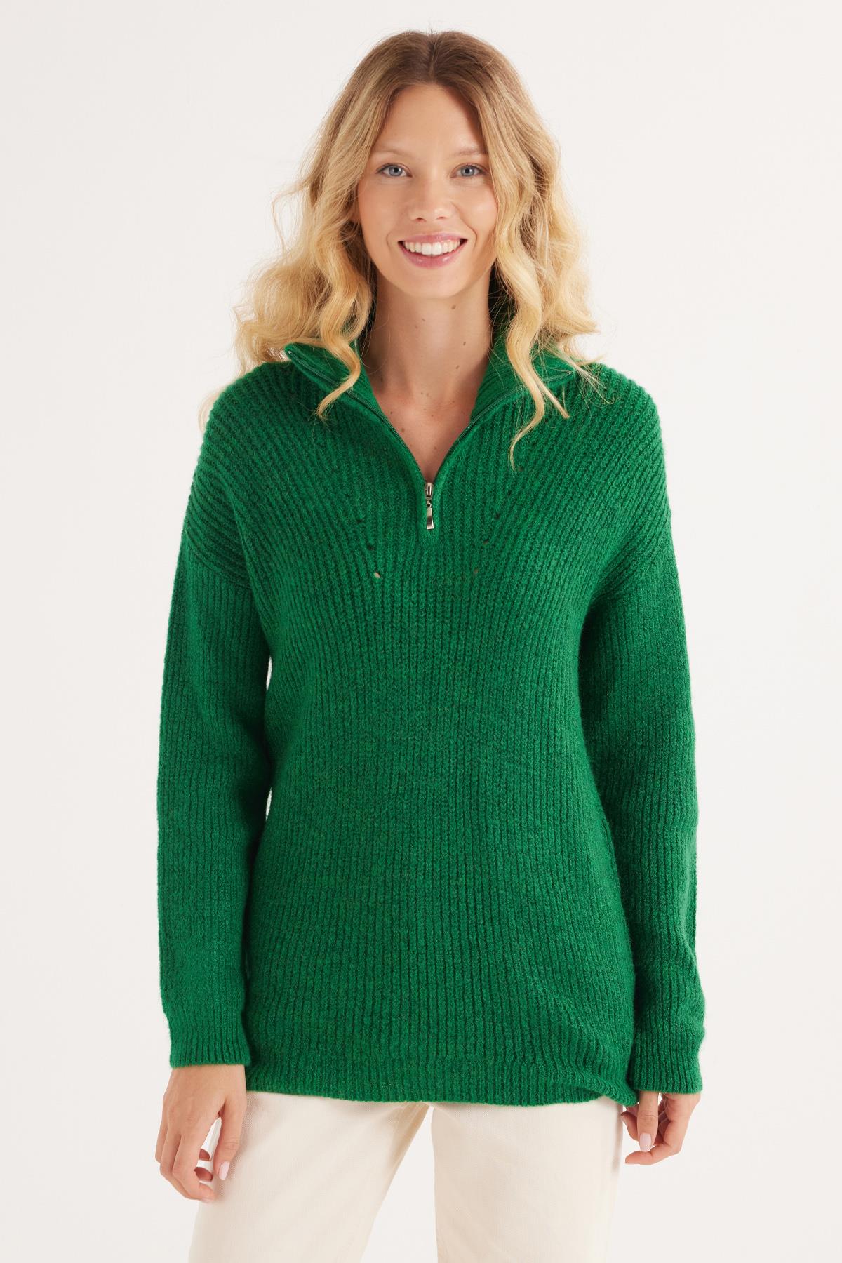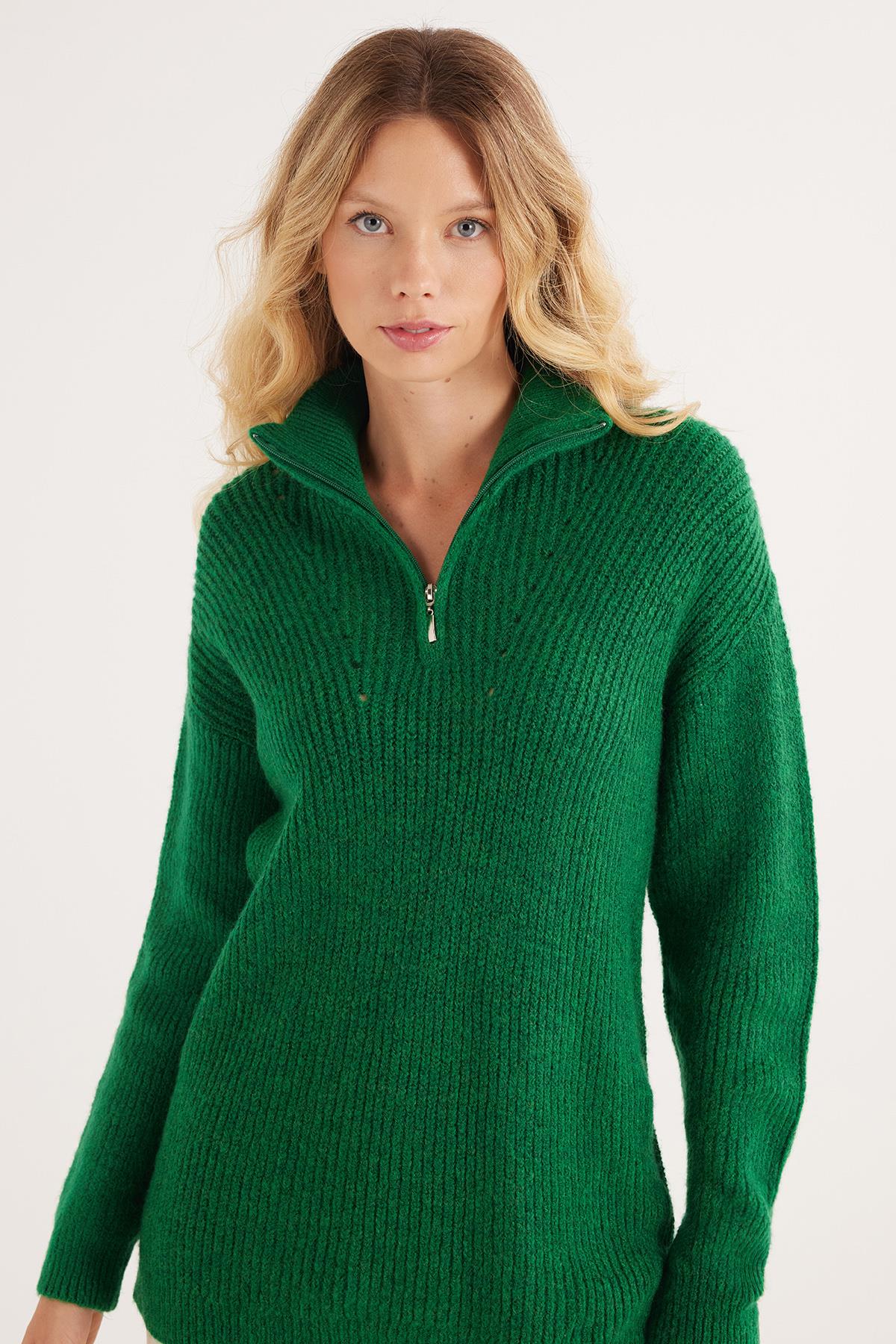 Kadın Oversize Geniş Kesim Dokumalı Fermuarlı Yaka Yeşil Kazak