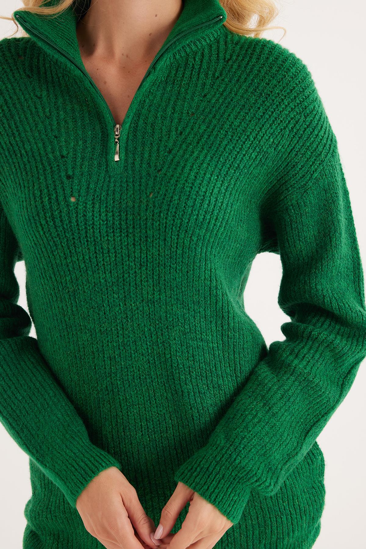 Kadın Oversize Geniş Kesim Dokumalı Fermuarlı Yaka Yeşil Kazak (BYKZ2512-04)