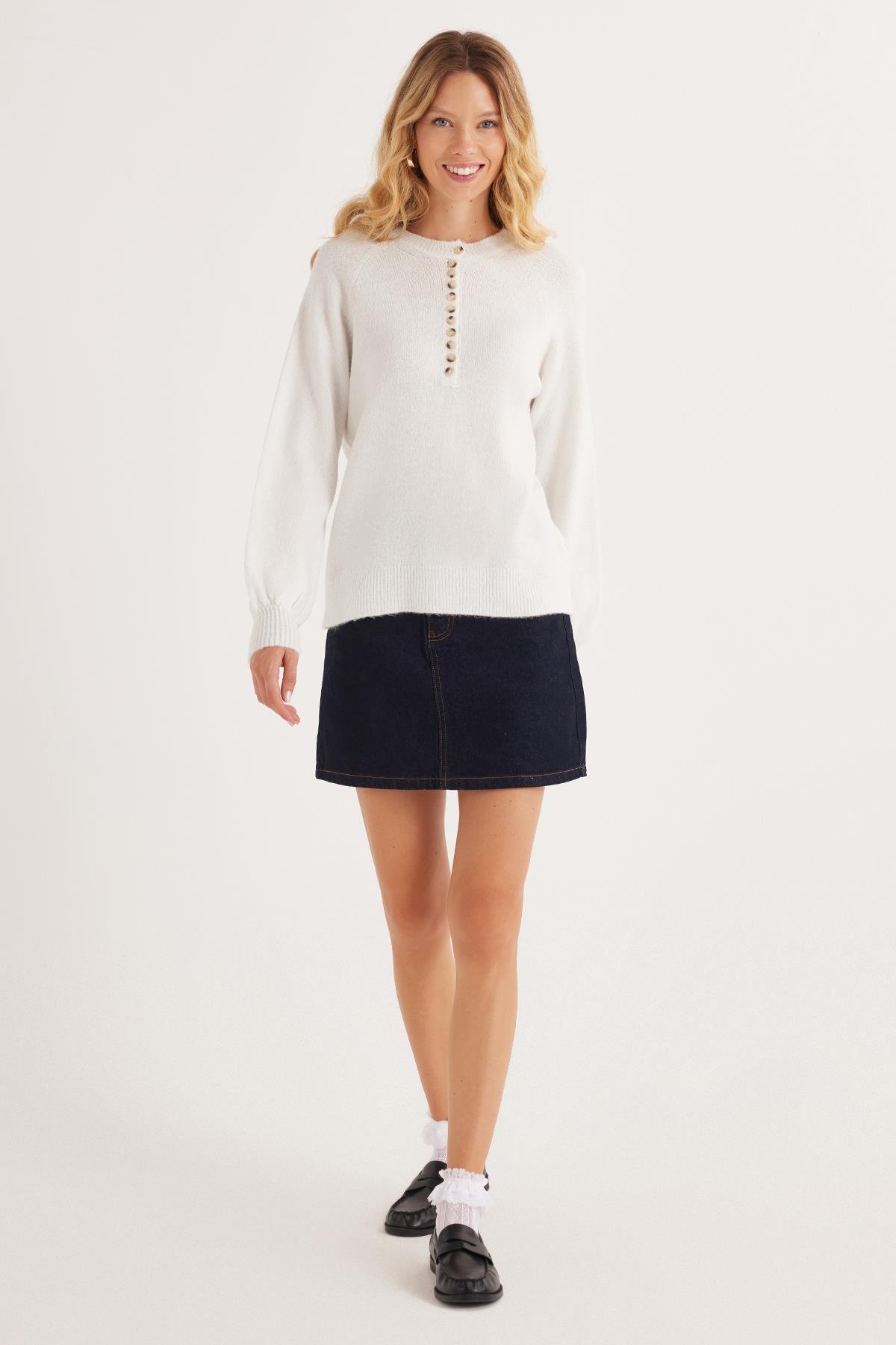 Kadın Oversize Geniş Kesim Düğmeli Yaka Beyaz Kazak