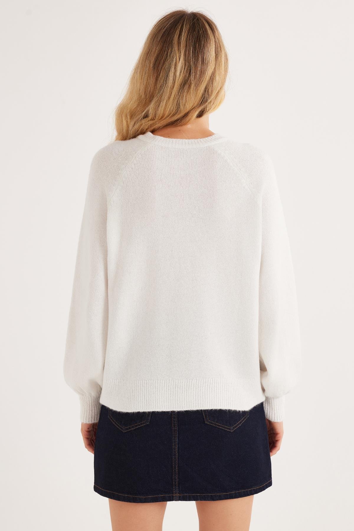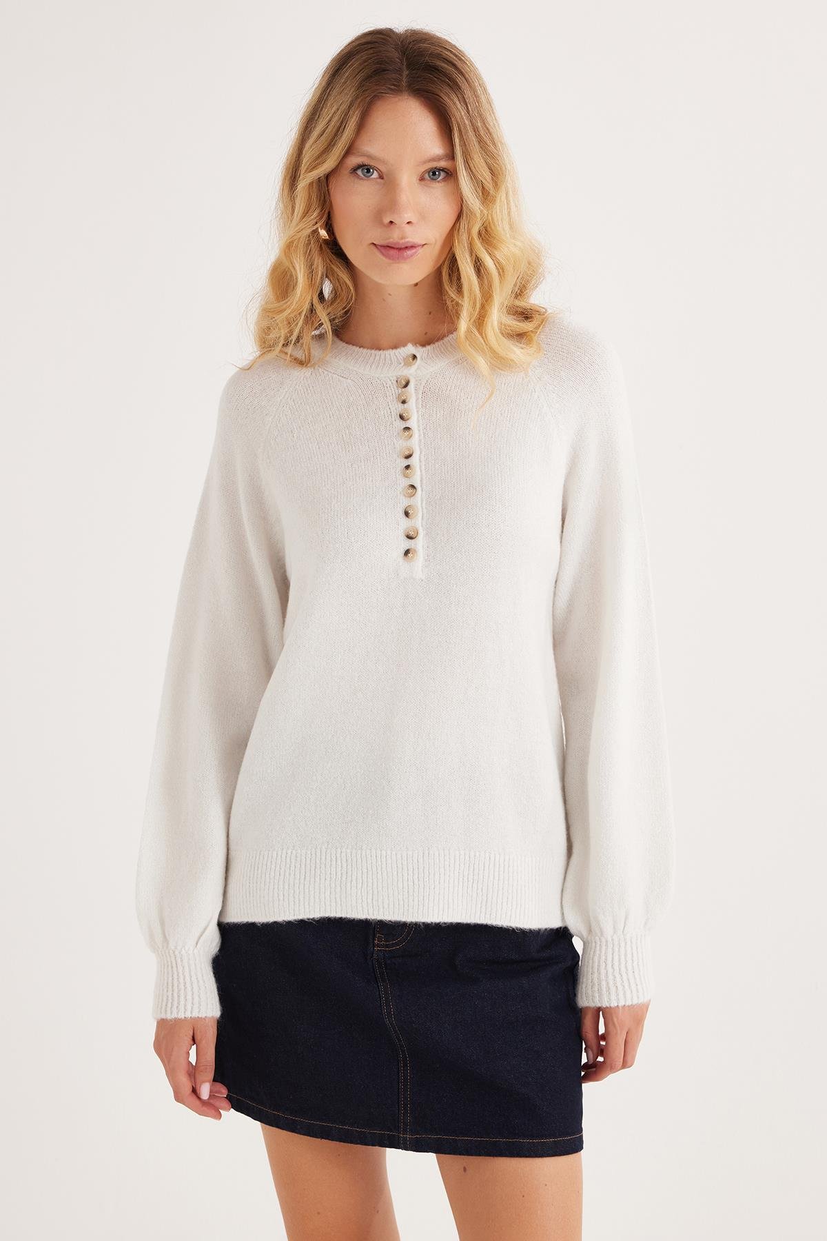 Kadın Oversize Geniş Kesim Düğmeli Yaka Beyaz Kazak (BYKZ2505-01)