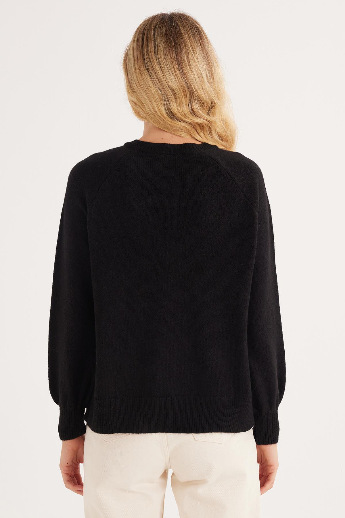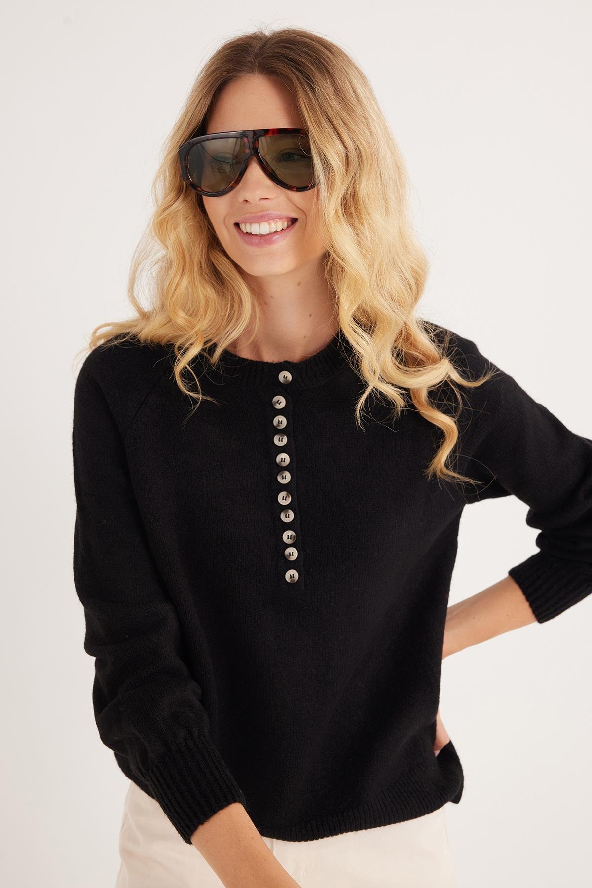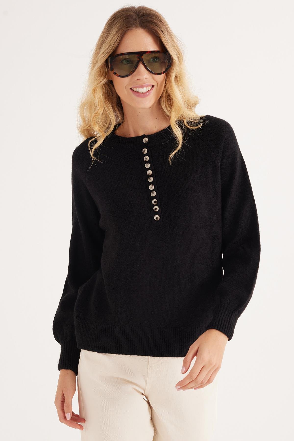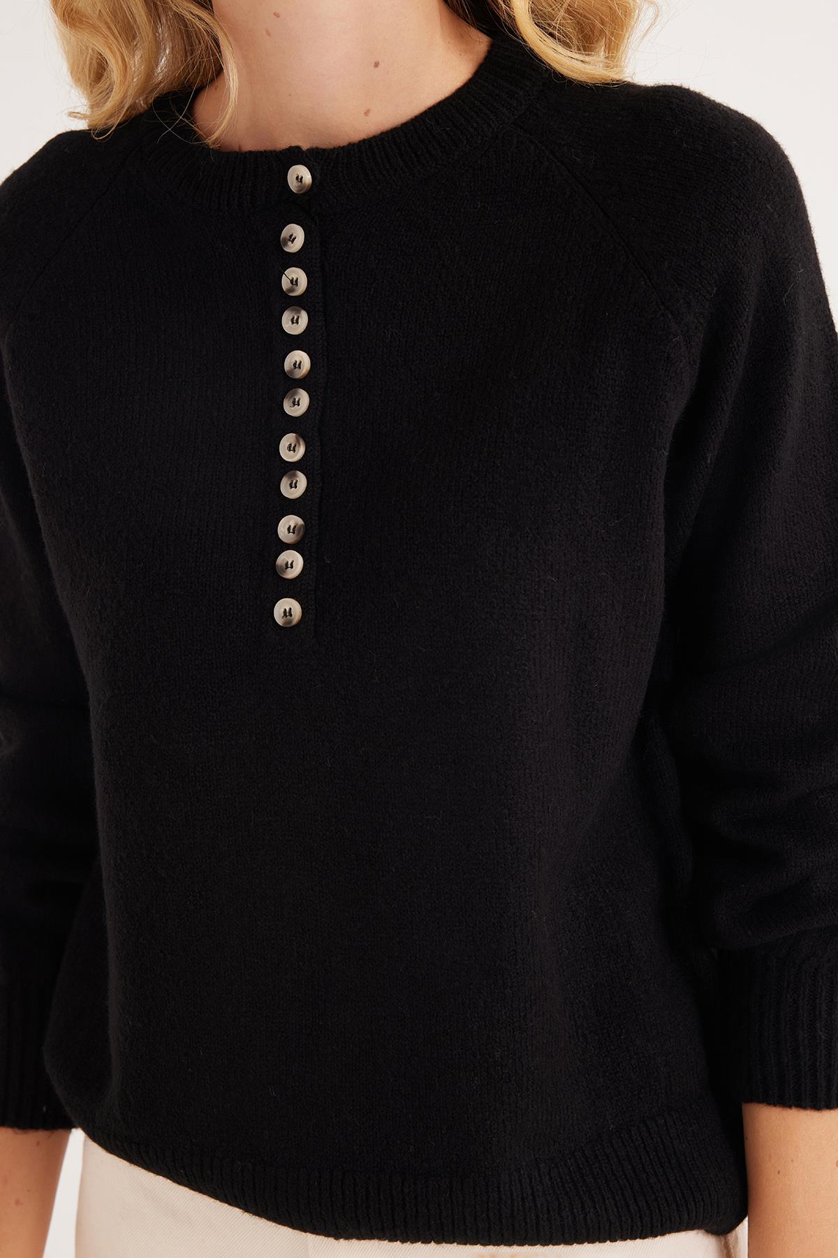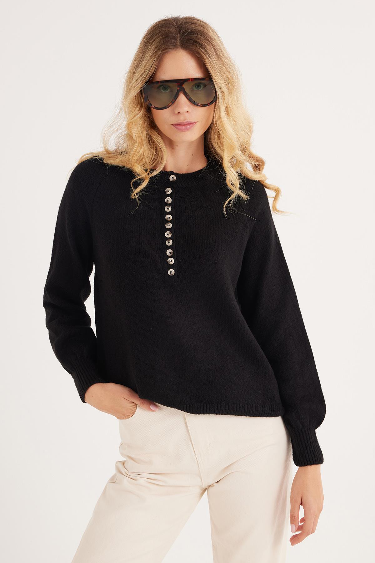 Kadın Oversize Geniş Kesim Düğmeli Yaka Siyah Kazak (BYKZ2505-02)