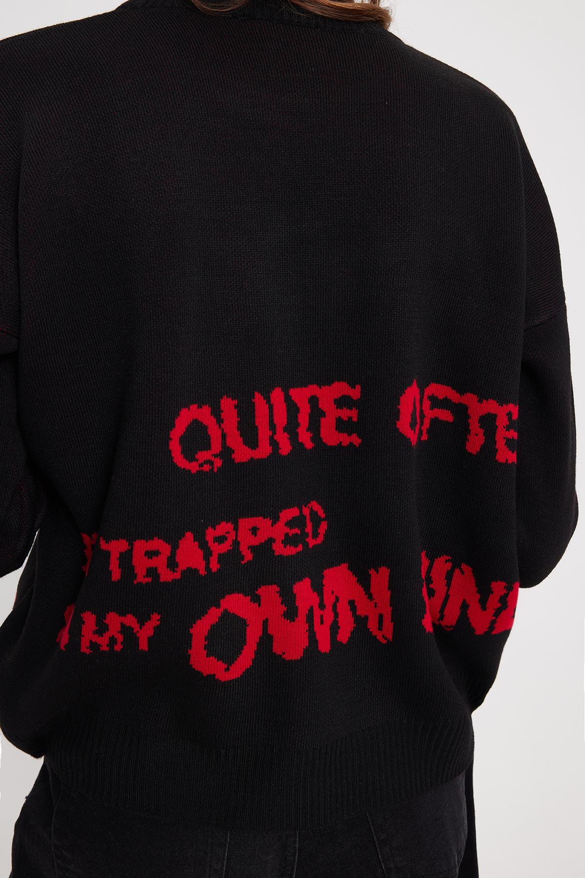 Kadın Oversize Geniş Kesim Örme Detaylı Baskılı Bisiklet Yaka Siyah Kazak (BYKZ2535-02)