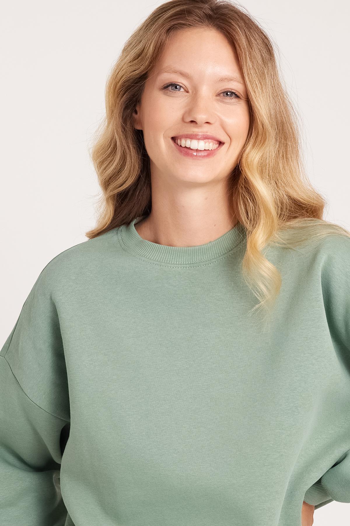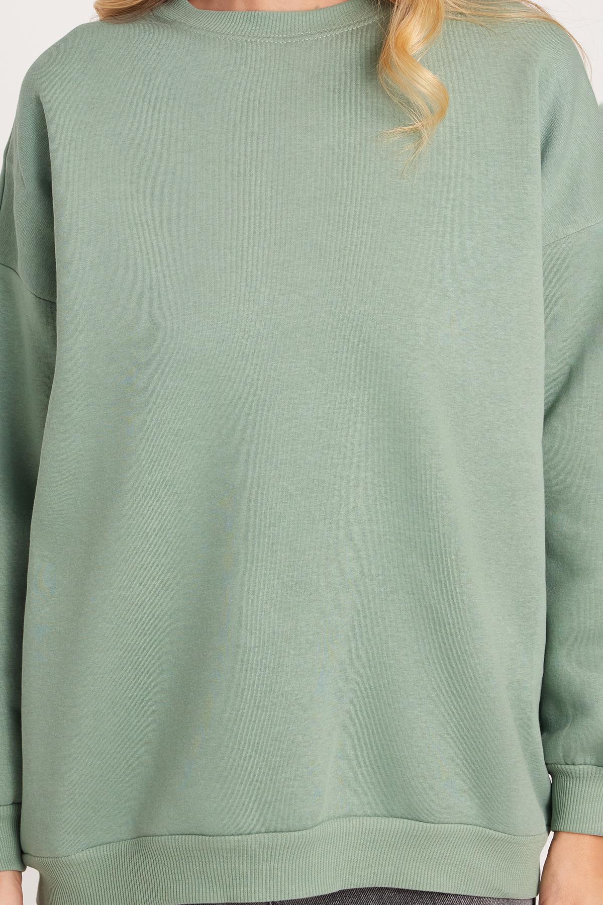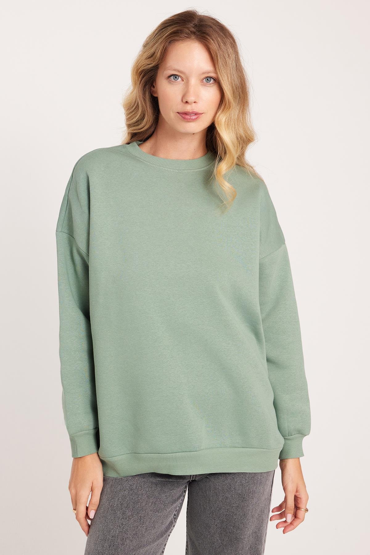 Kadın Oversize Geniş Kesim Pamuklu 3 İplik Bisiklet Yaka Haki Sweatshirt (SW250034-48)