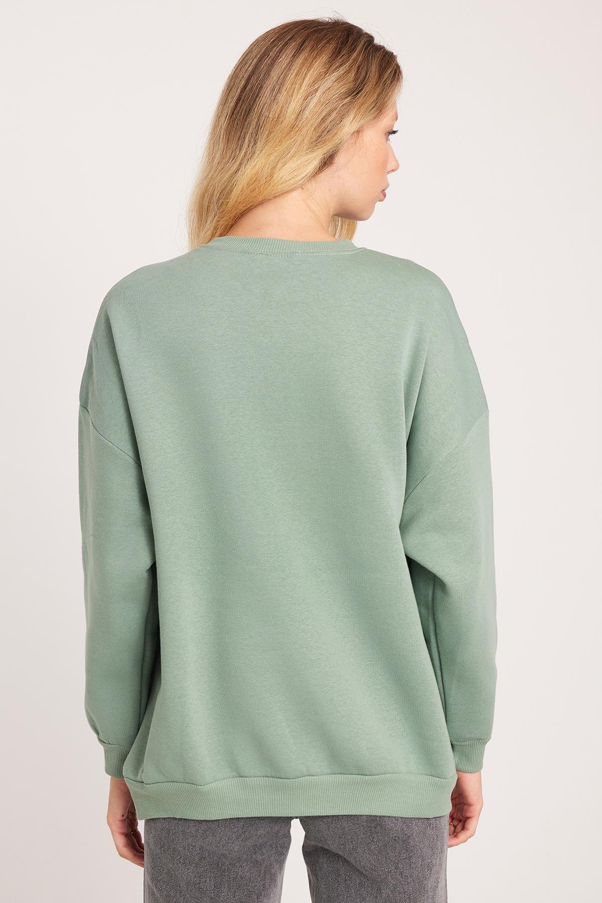 Kadın Oversize Geniş Kesim Pamuklu 3 İplik Bisiklet Yaka Haki Sweatshirt