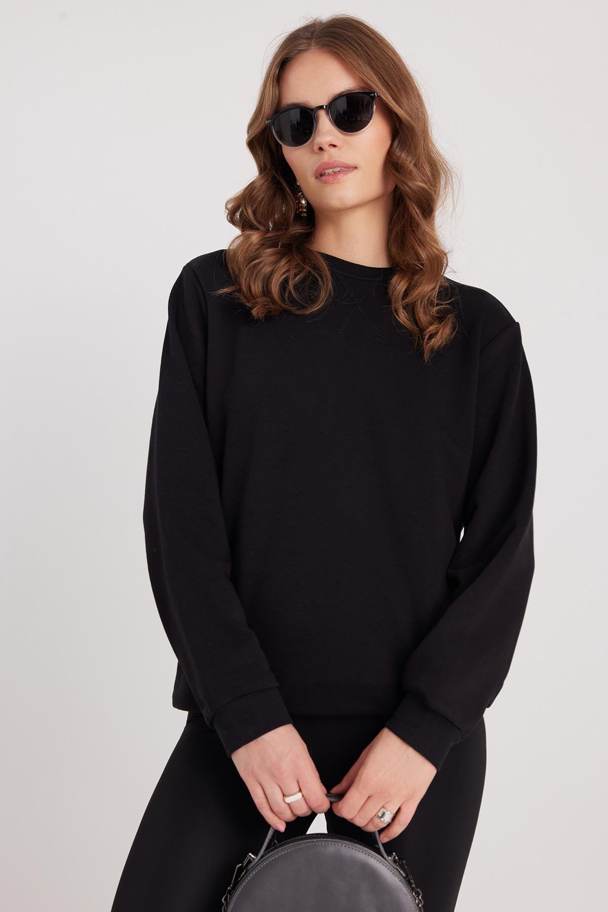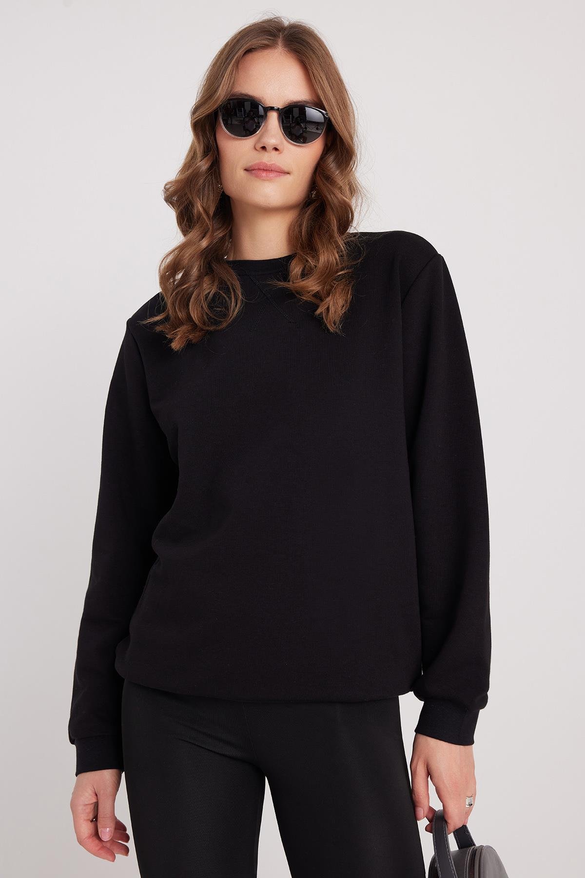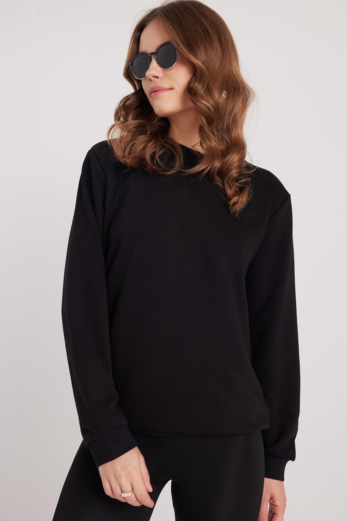 Kadın Oversize Geniş Kesim Pamuklu Basic Siyah Bisiklet Yaka Sweatshirt (SW250030-02)