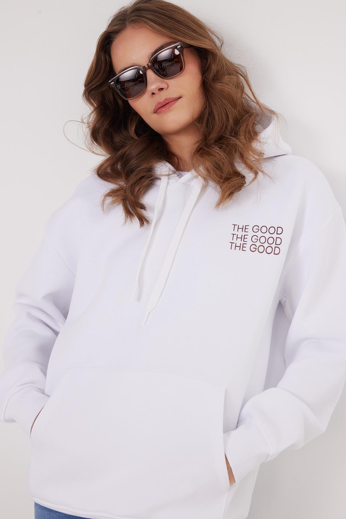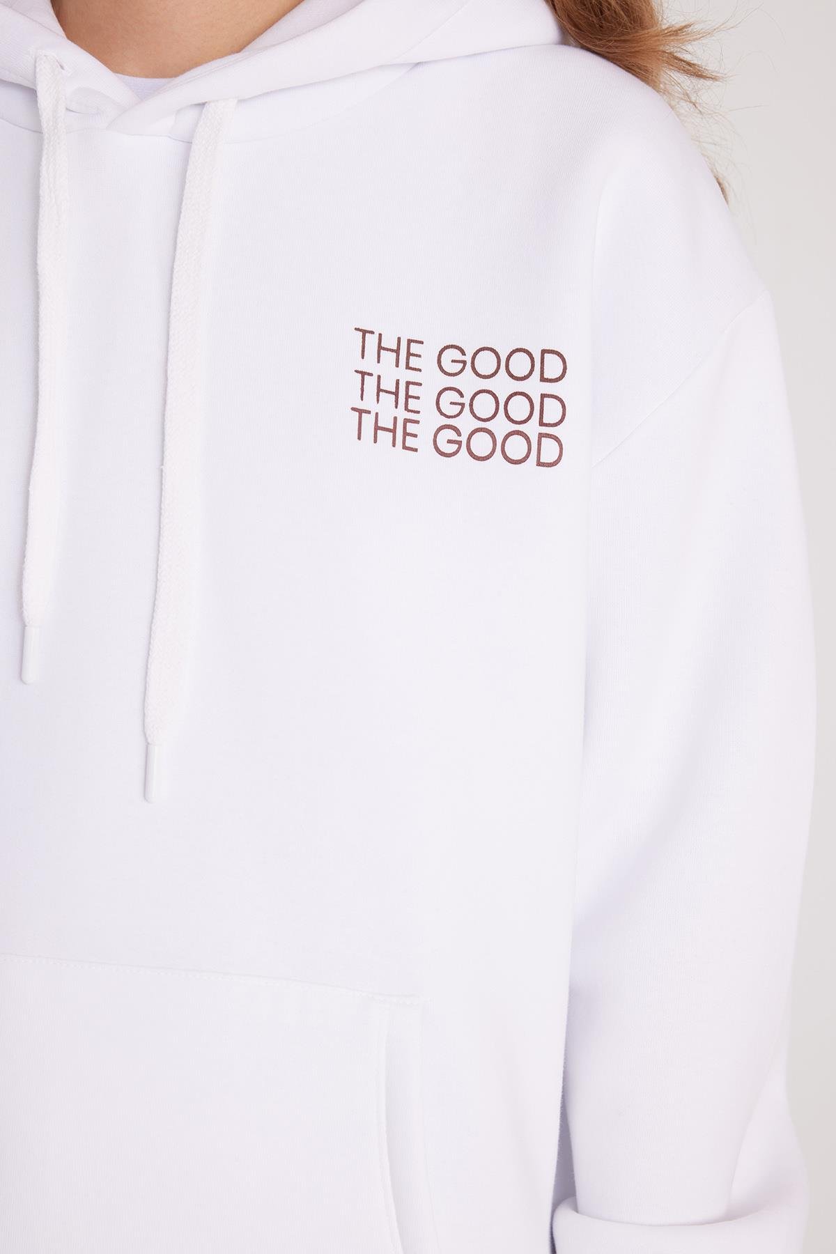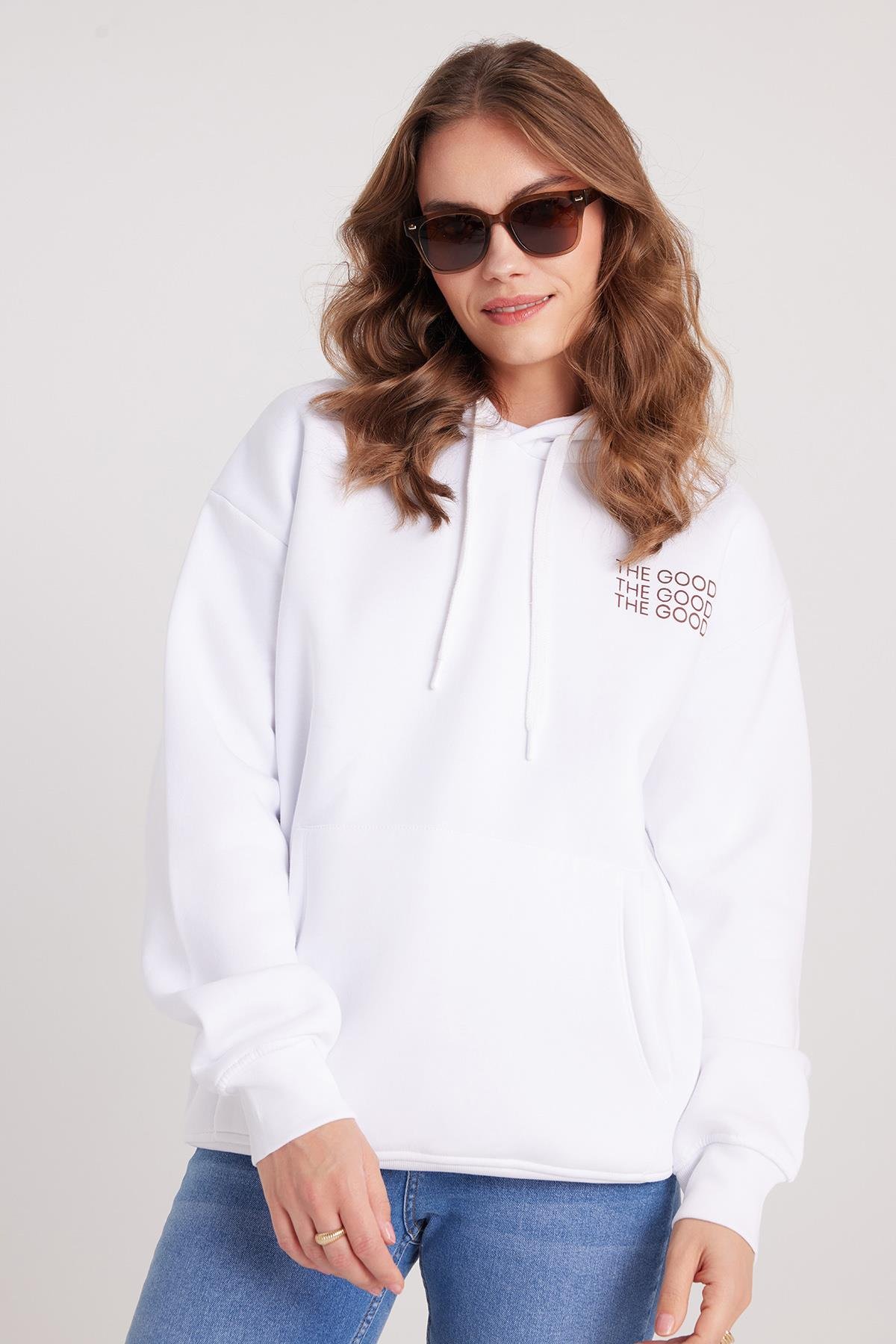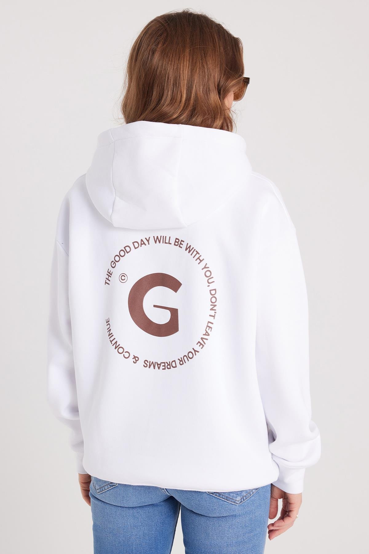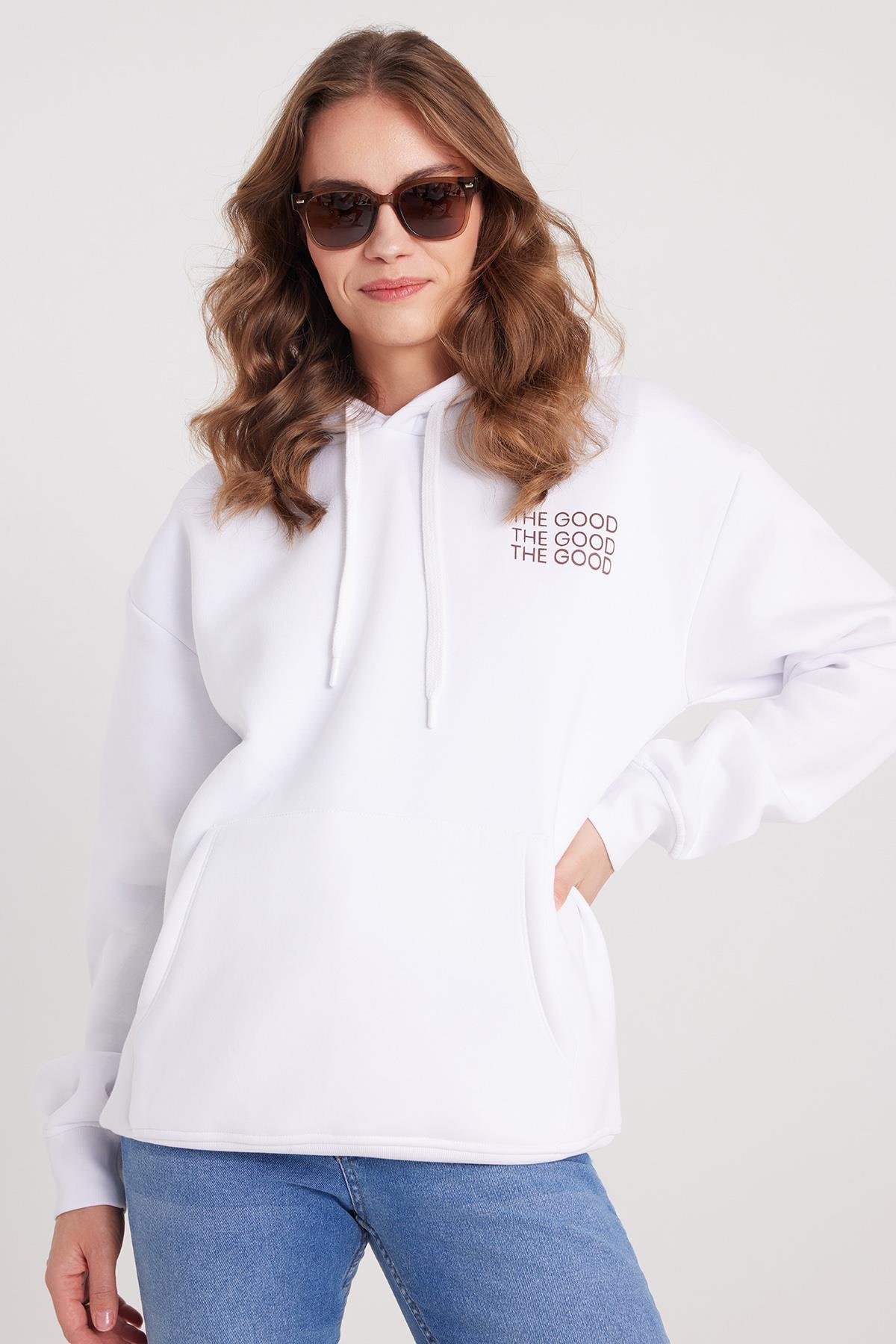 Kadın Oversize Geniş Kesim Pamuklu Yumuşak Dokulu İçi Polarlı Baskılı Beyaz Kapüşonlu Sweatshirt