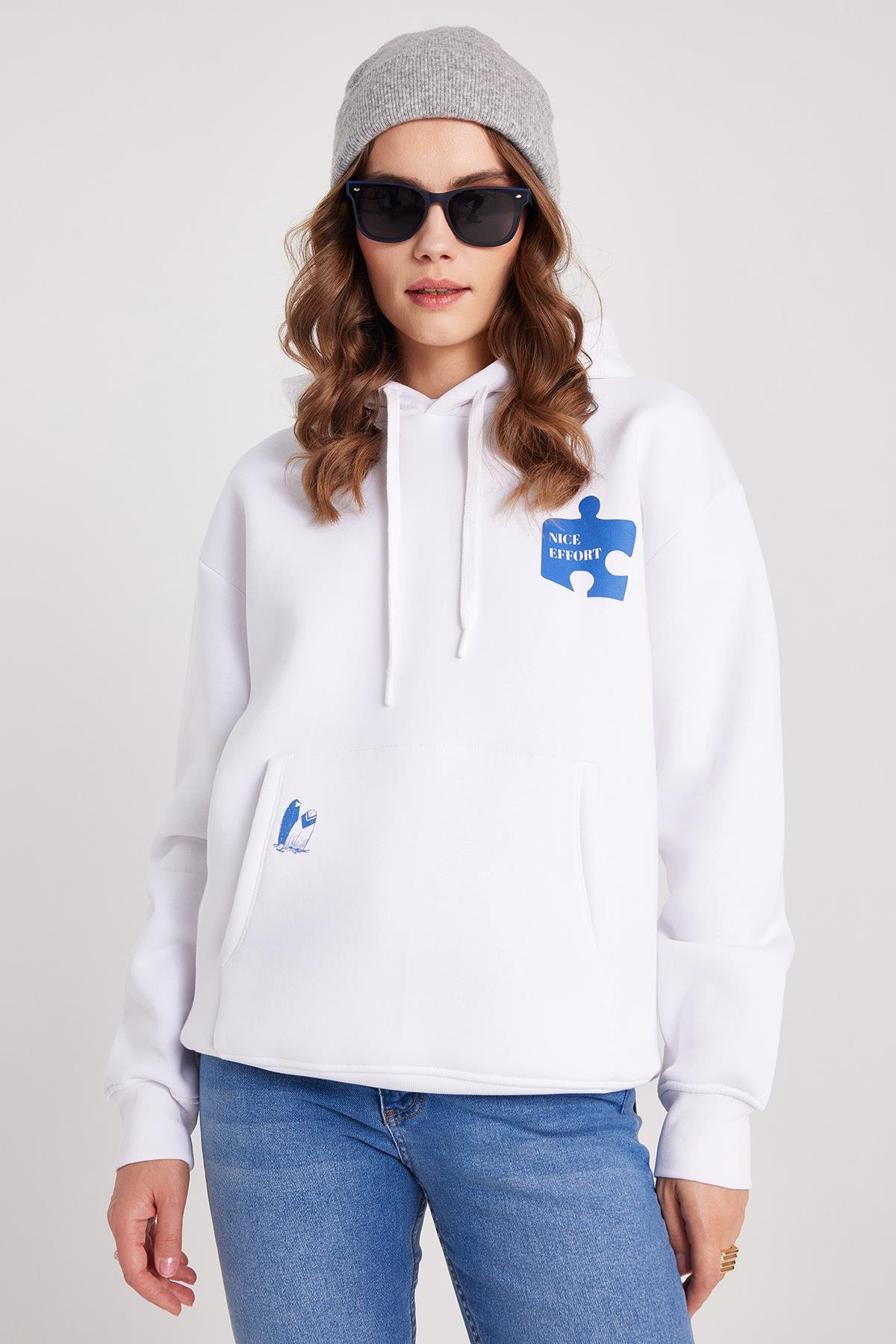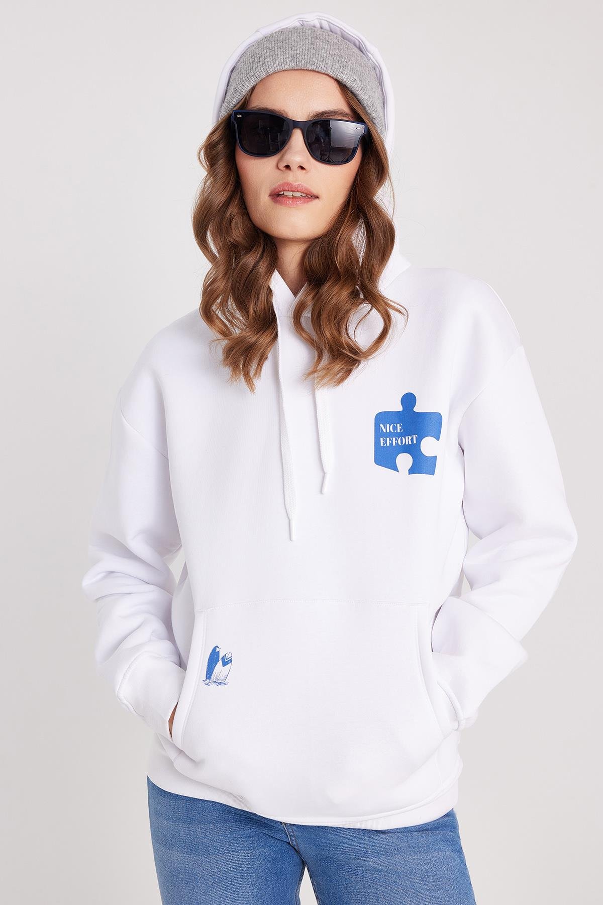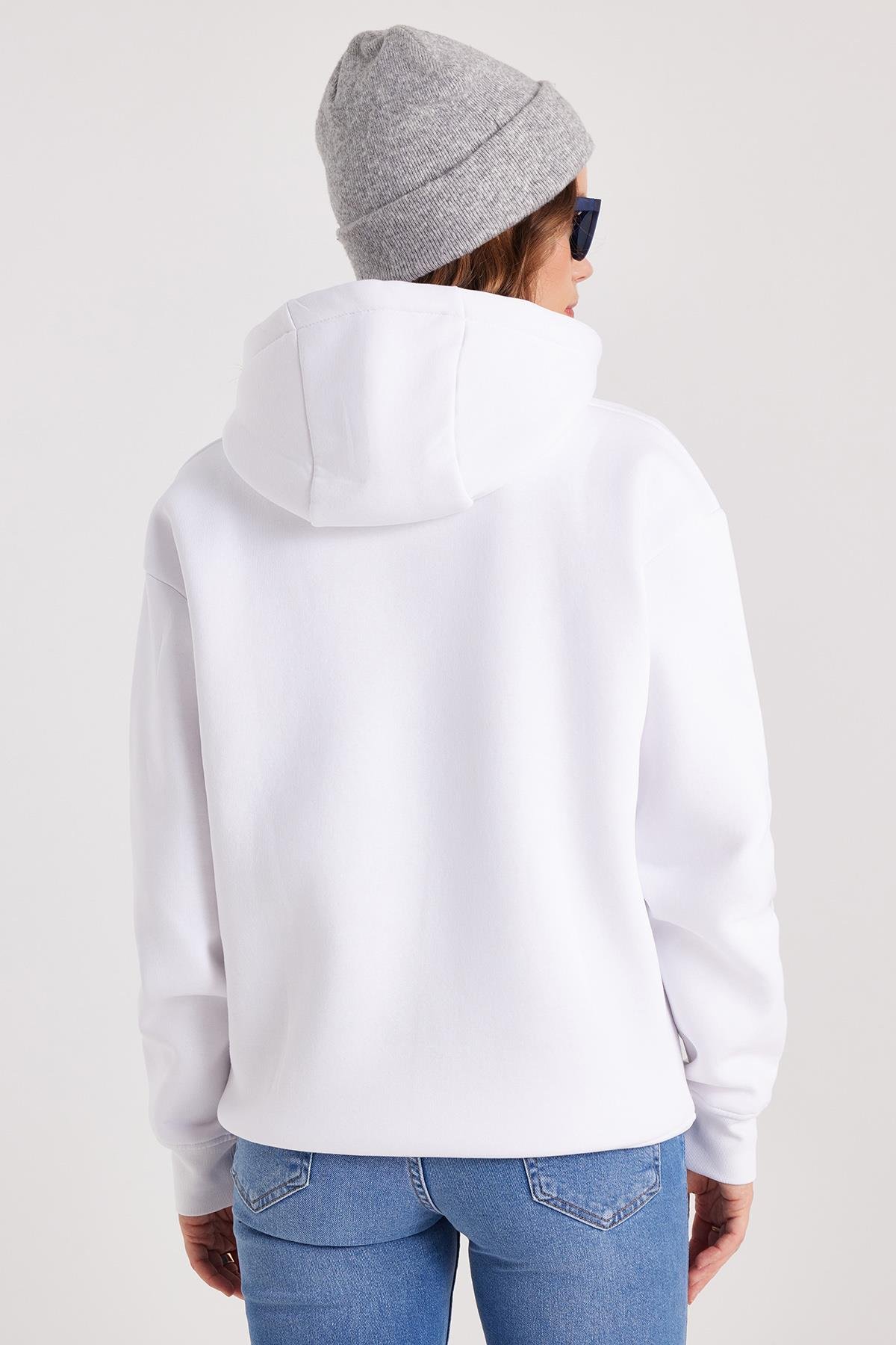 Kadın Oversize Geniş Kesim Pamuklu Yumuşak Dokulu İçi Polarlı Baskılı Beyaz Kapüşonlu Sweatshirt
