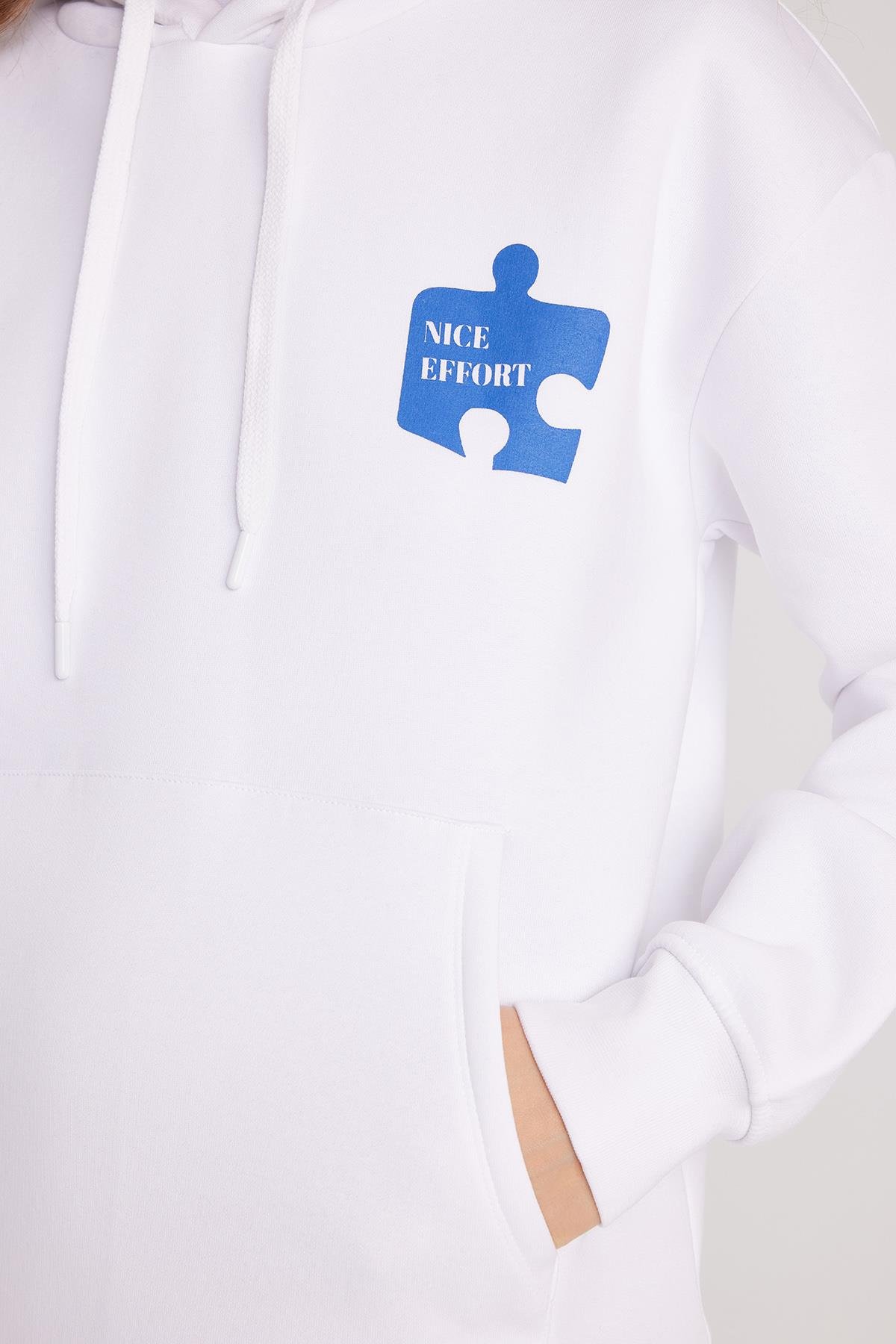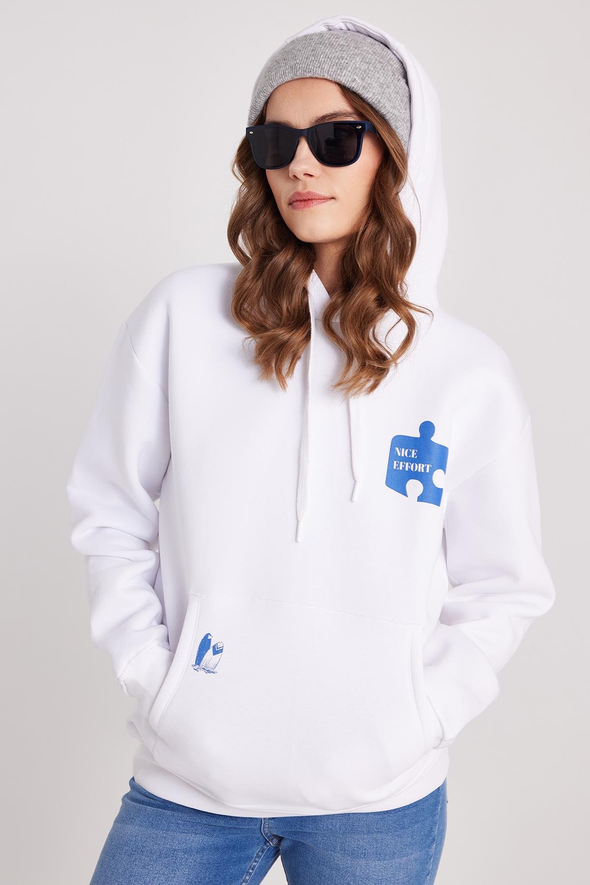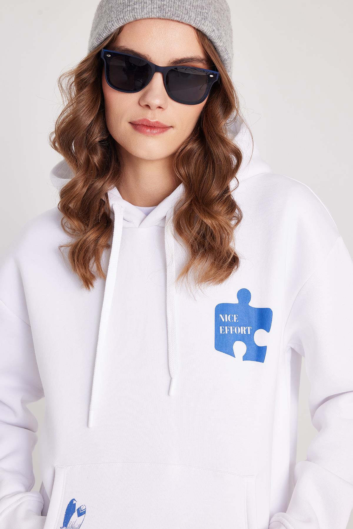 Kadın Oversize Geniş Kesim Pamuklu Yumuşak Dokulu İçi Polarlı Baskılı Beyaz Kapüşonlu Sweatshirt