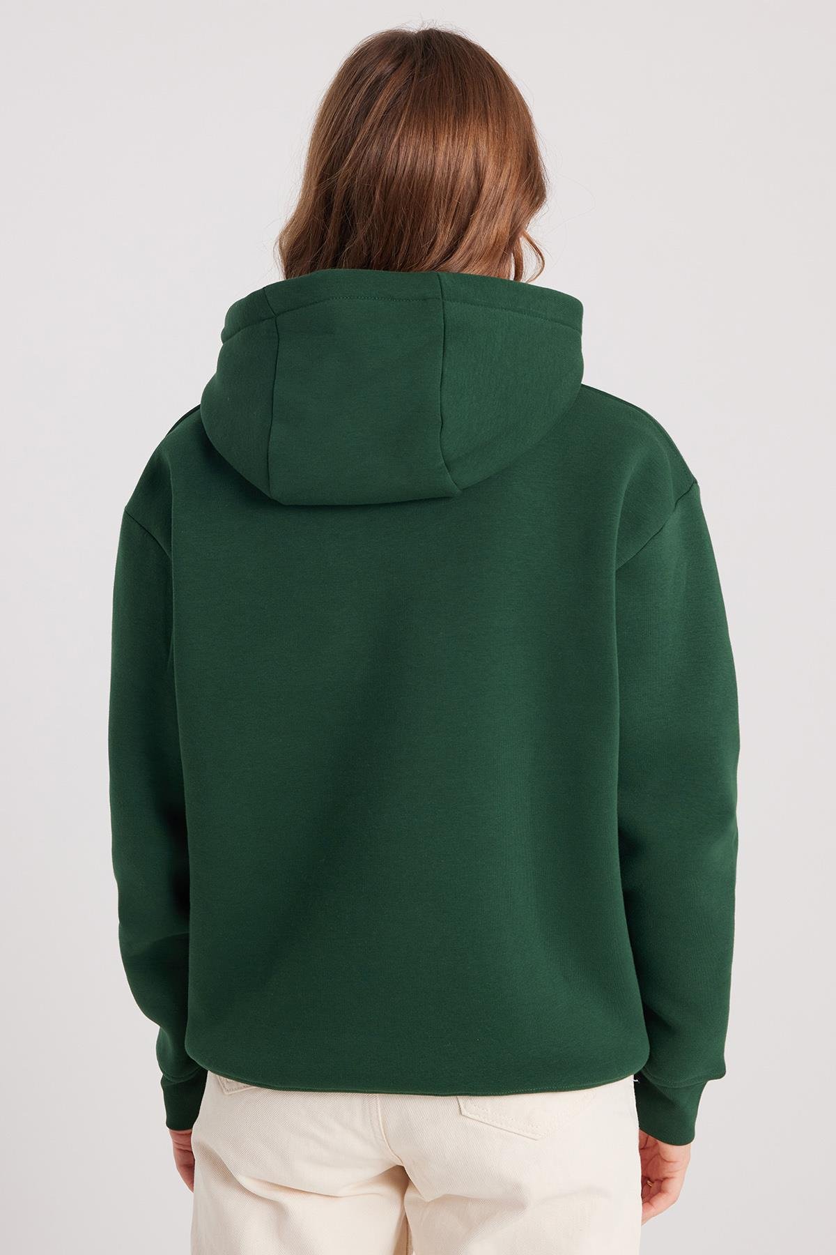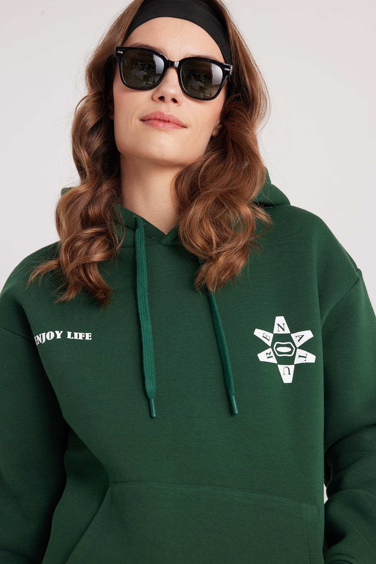 Kadın Oversize Geniş Kesim Pamuklu Yumuşak Dokulu İçi Polarlı Baskılı Yeşil Kapüşonlu Sweatshirt