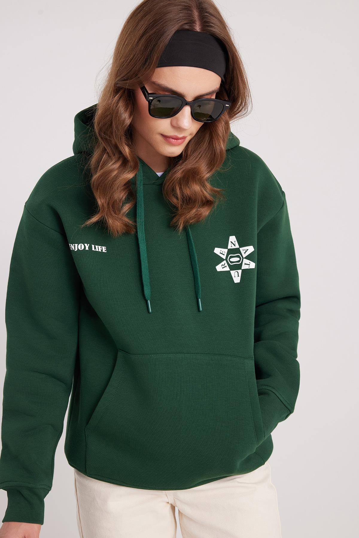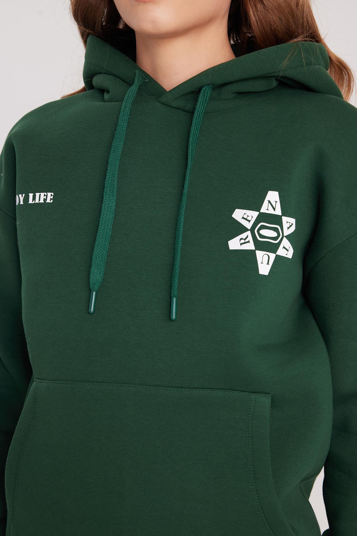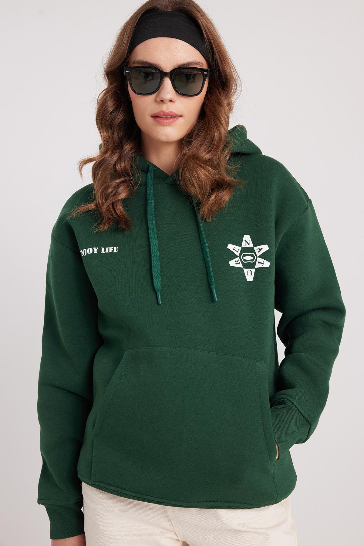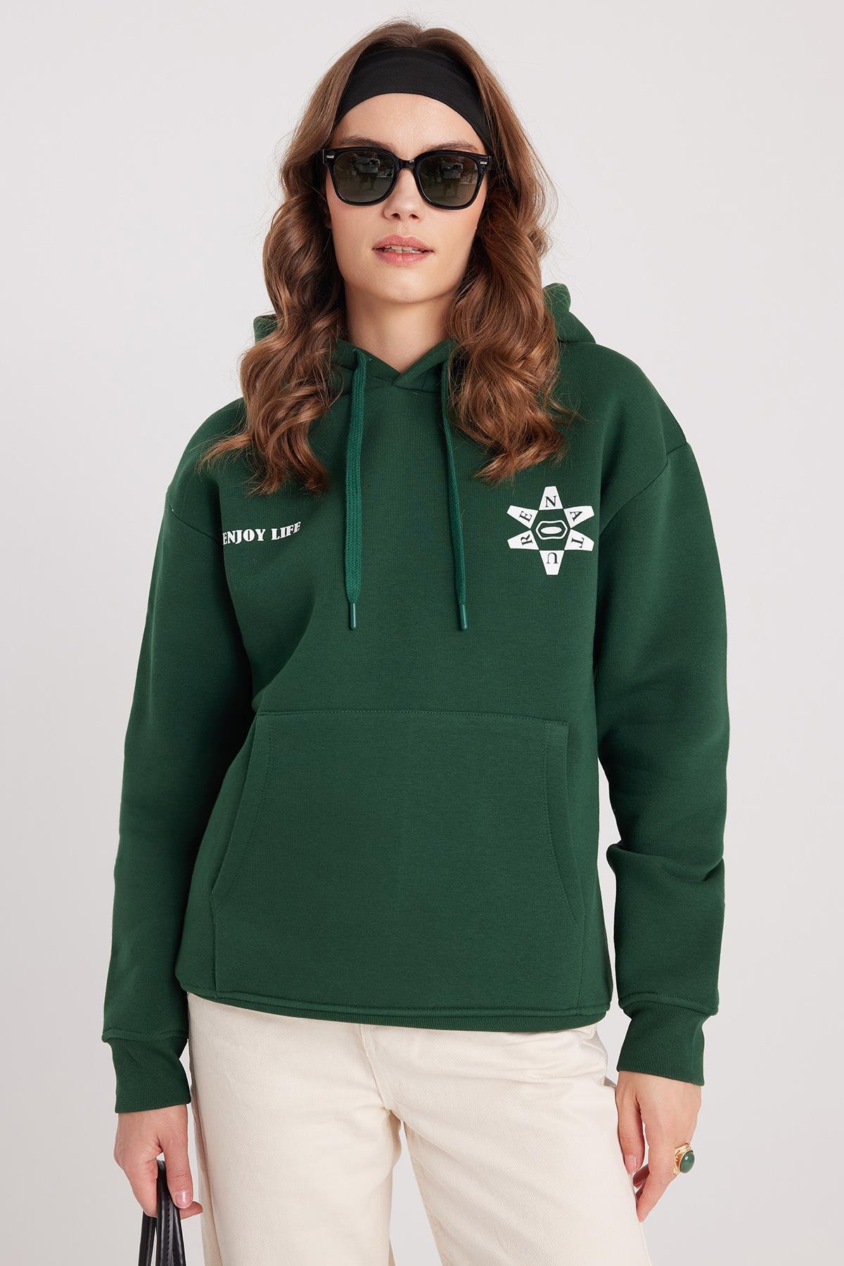 Kadın Oversize Geniş Kesim Pamuklu Yumuşak Dokulu İçi Polarlı Baskılı Yeşil Kapüşonlu Sweatshirt (SW250027-7470)