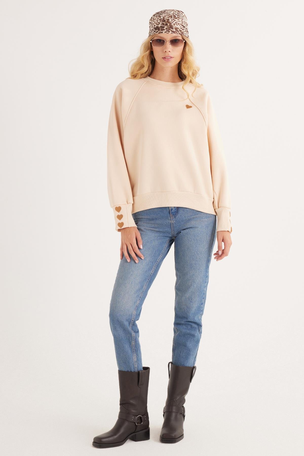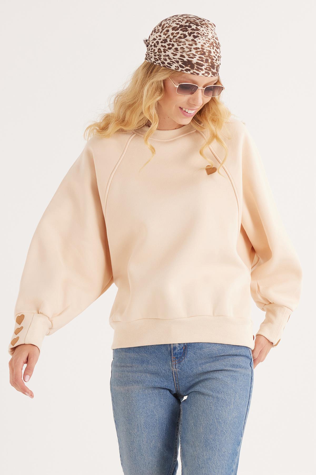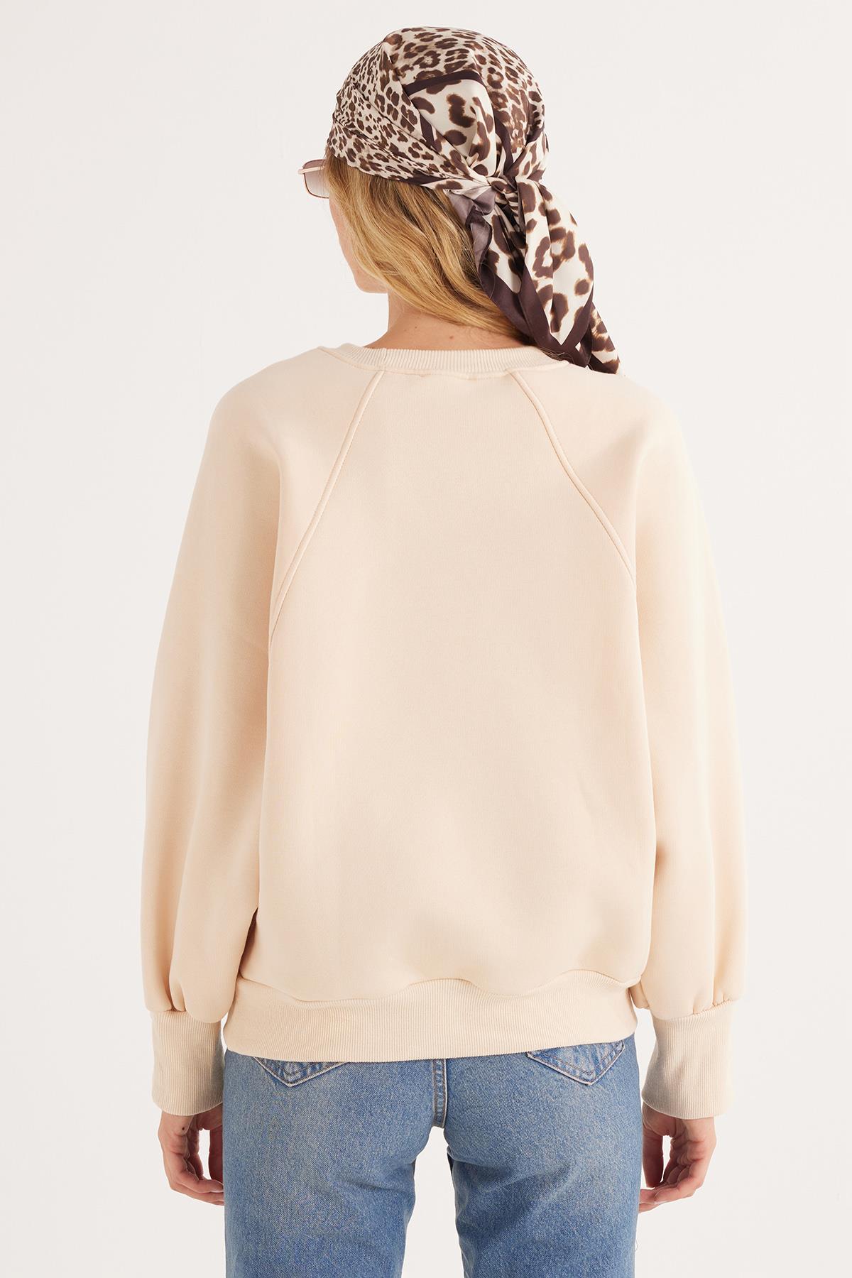 Kadın Regular Fit Klasik Kesim %100 Pamuk Baskılı Bisiklet Yaka Bej Sweatshirt (SW250012-71)