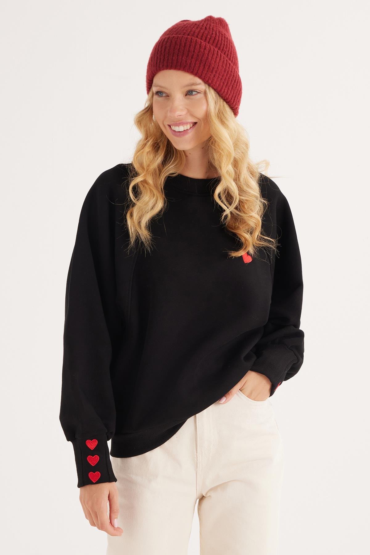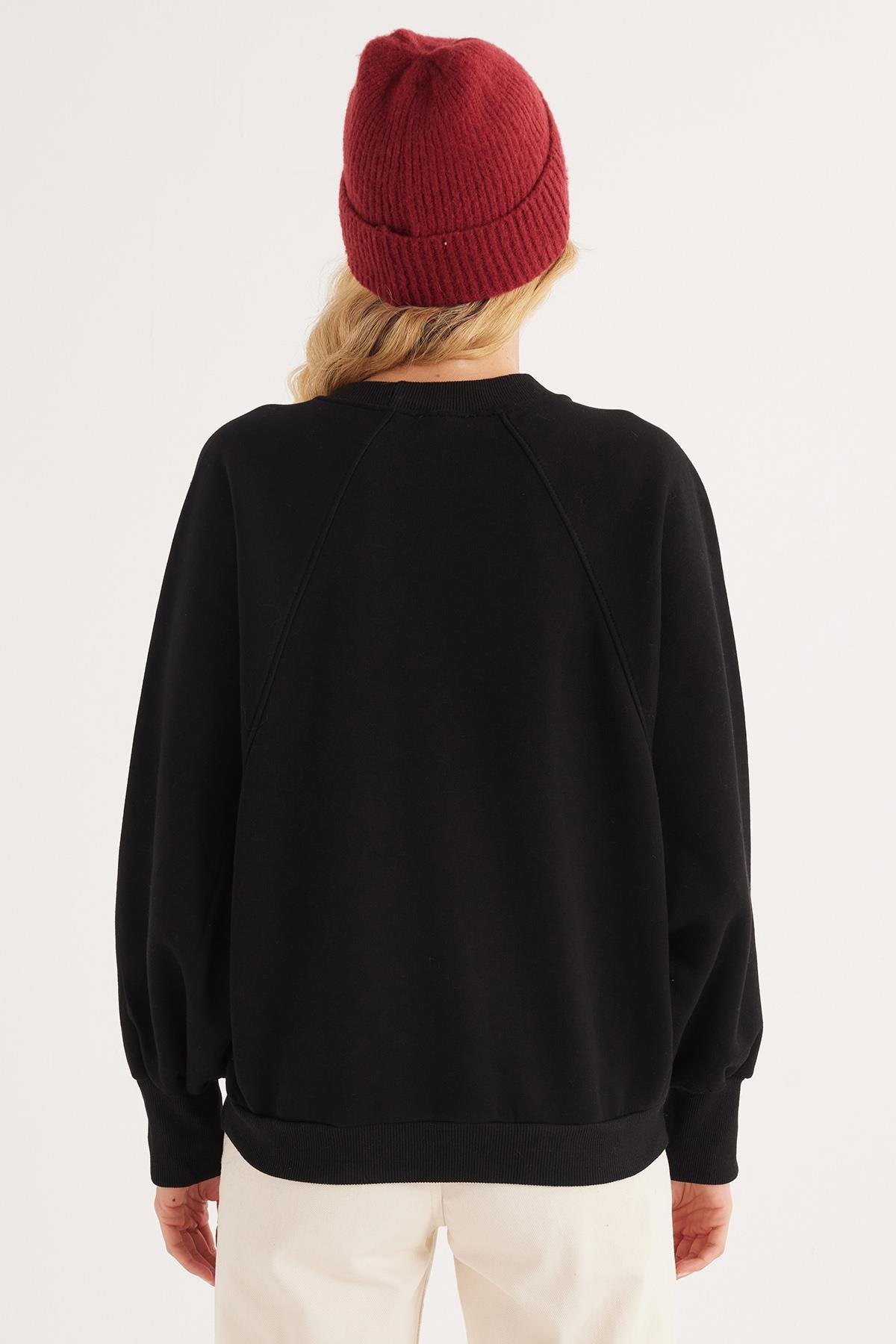Kadın Regular Fit Klasik Kesim %100 Pamuk Baskılı Bisiklet Yaka Siyah Sweatshirt