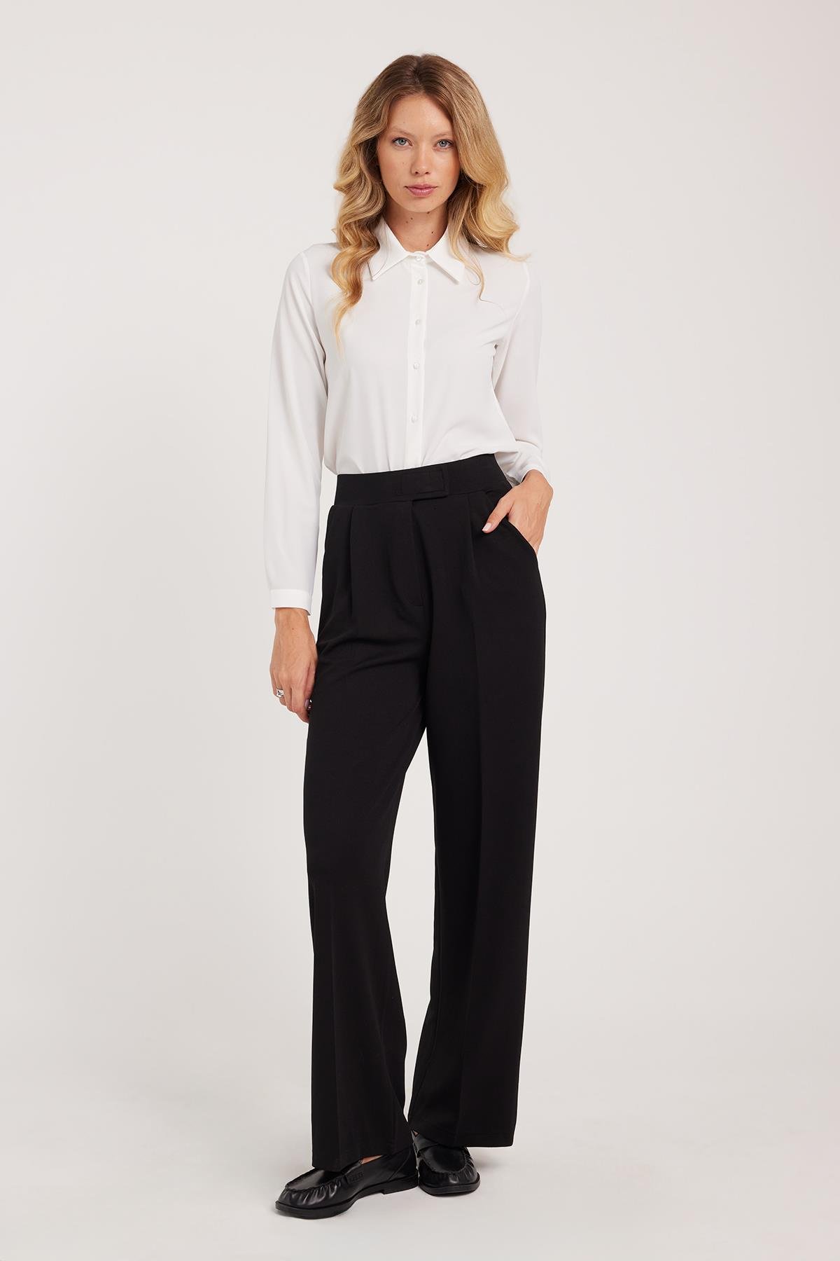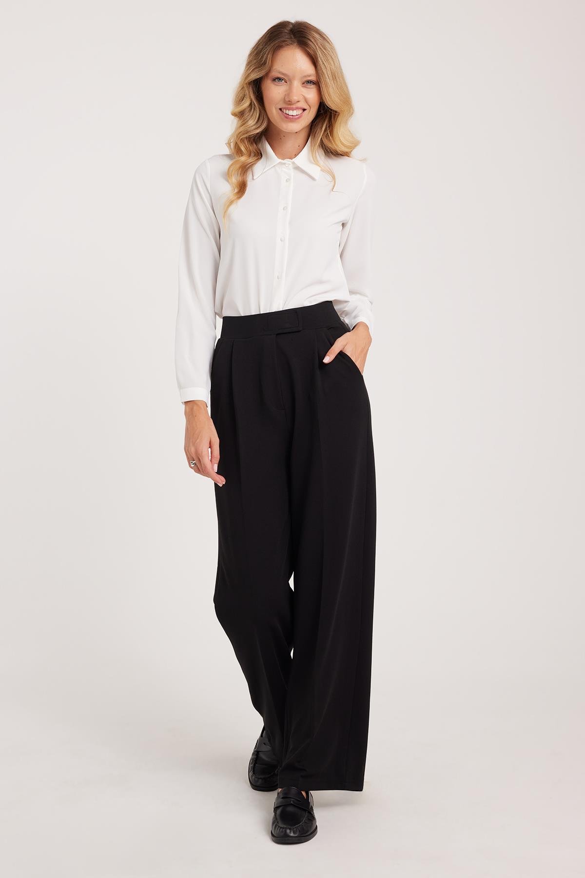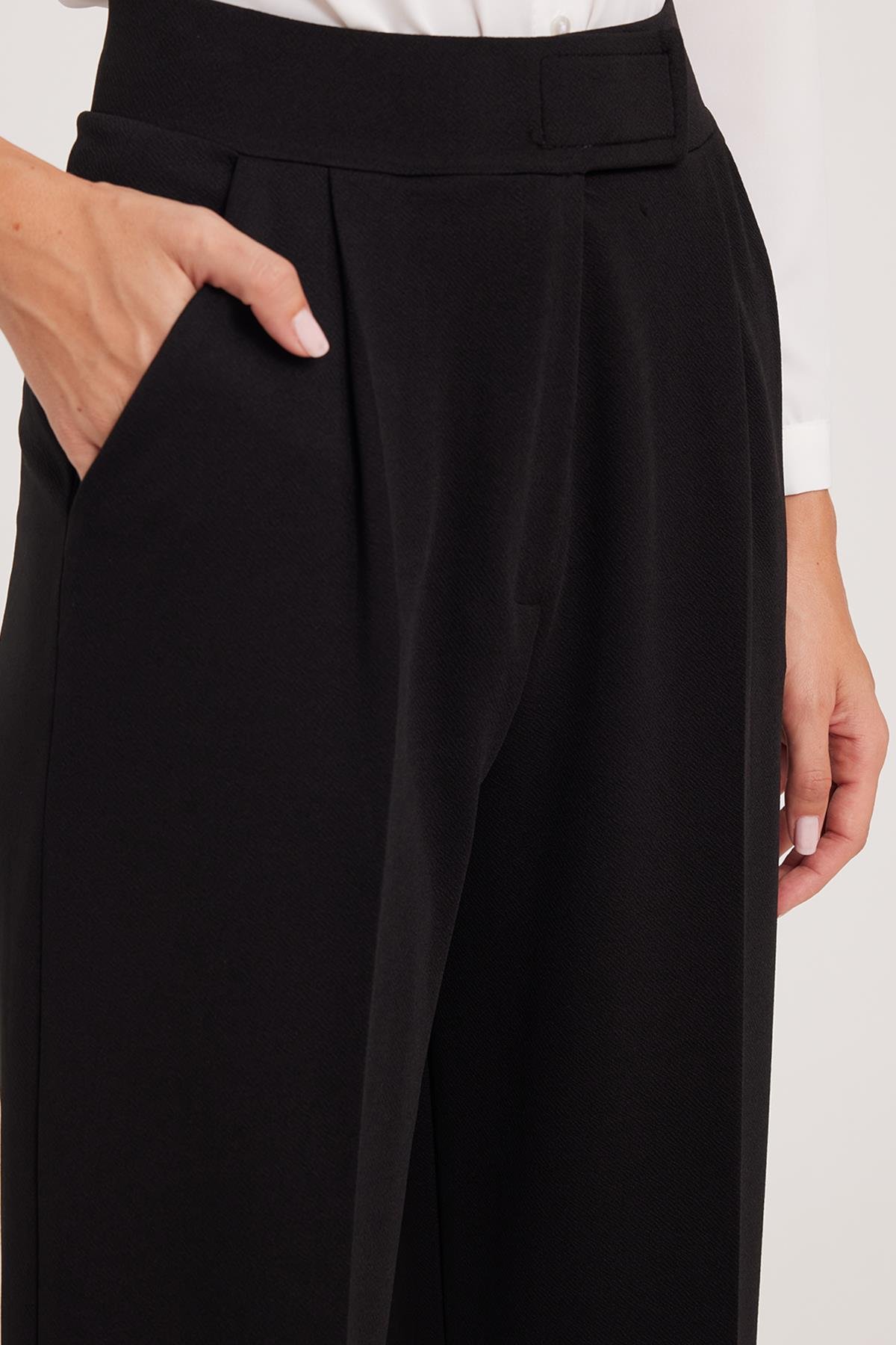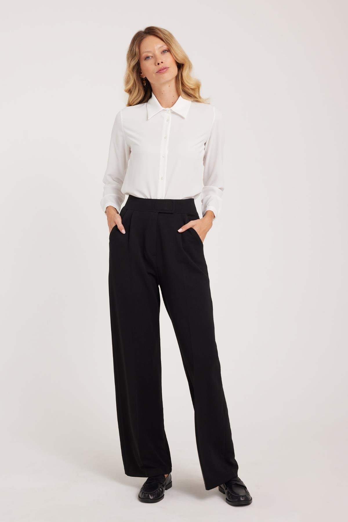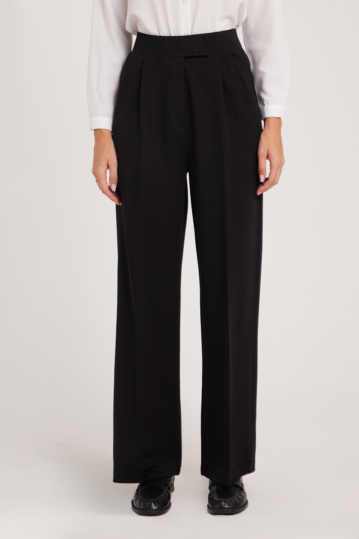 Kadın Regular Fit Klasik Kesim Cırt Kapamalı Geniş Paça Siyah Pantolon (PN250049-02)