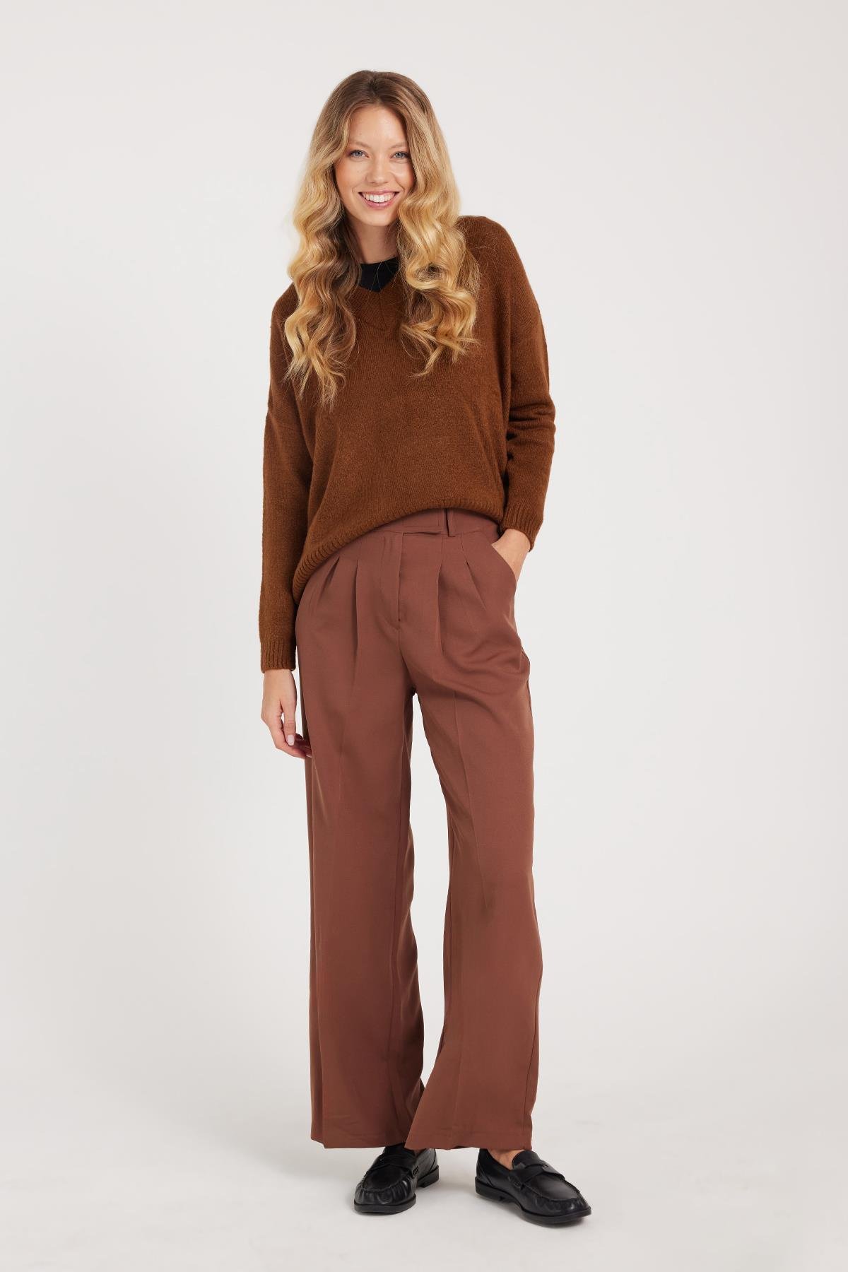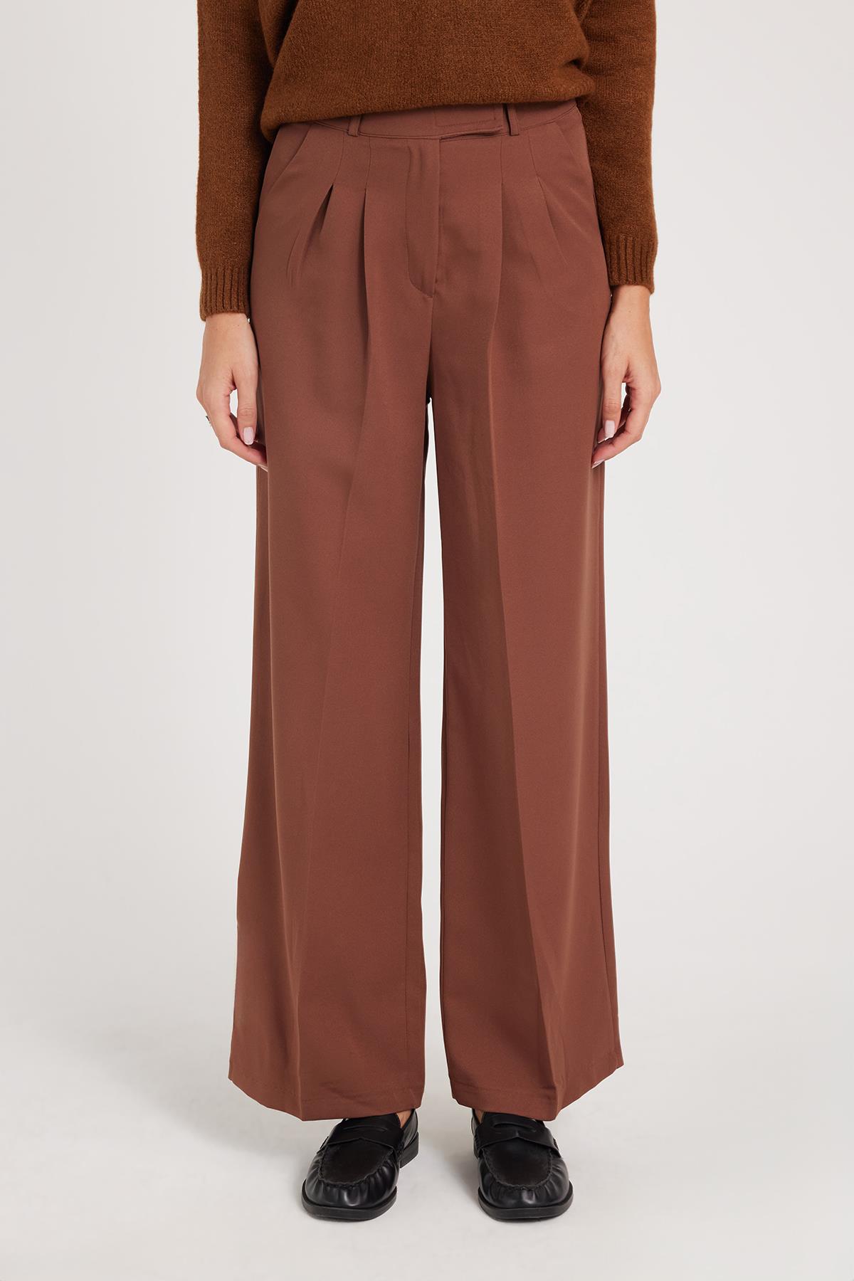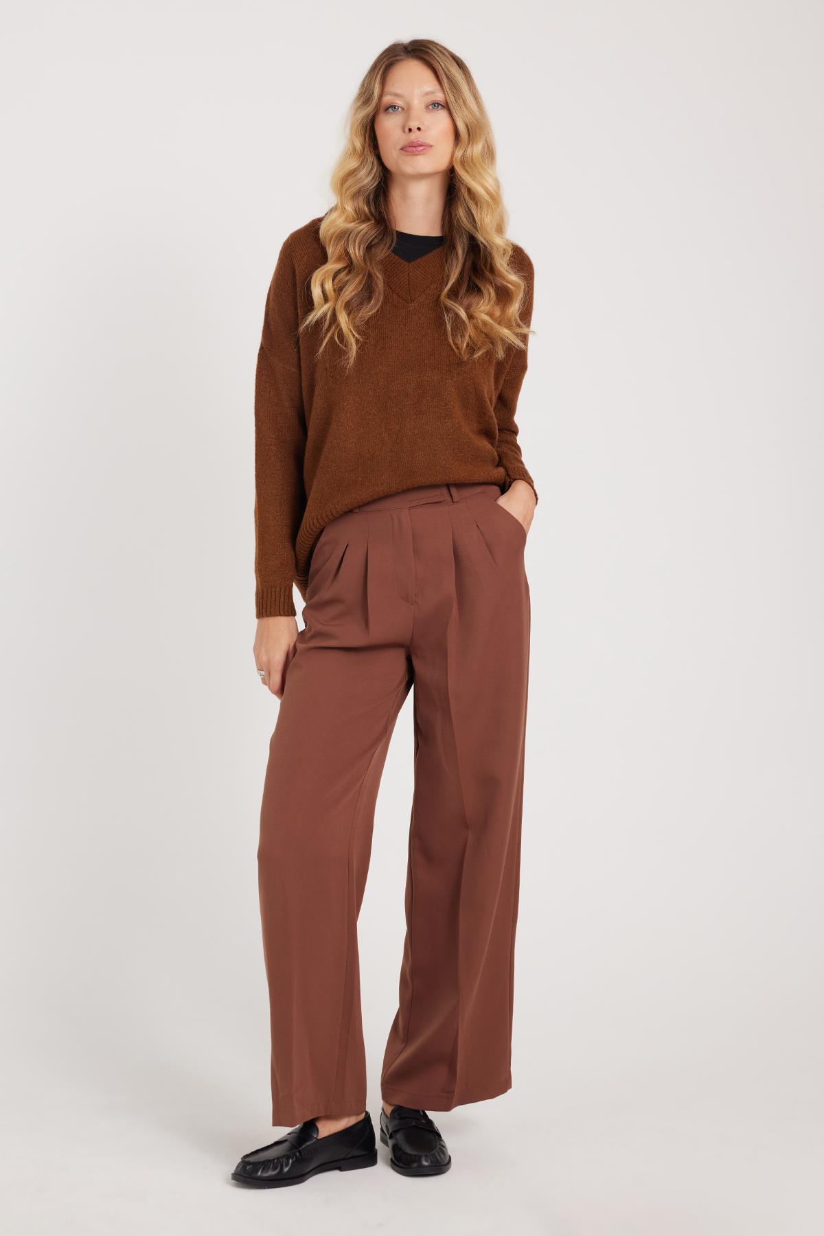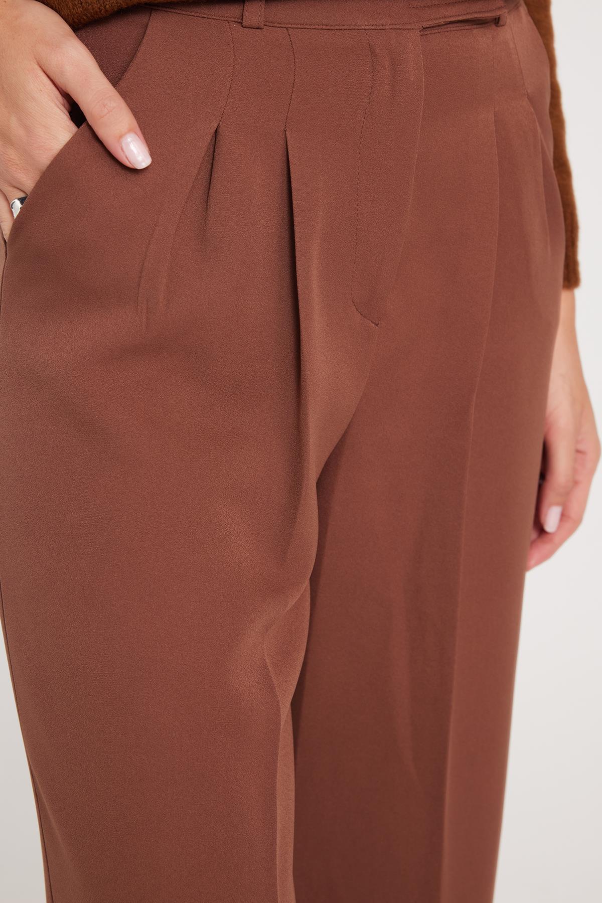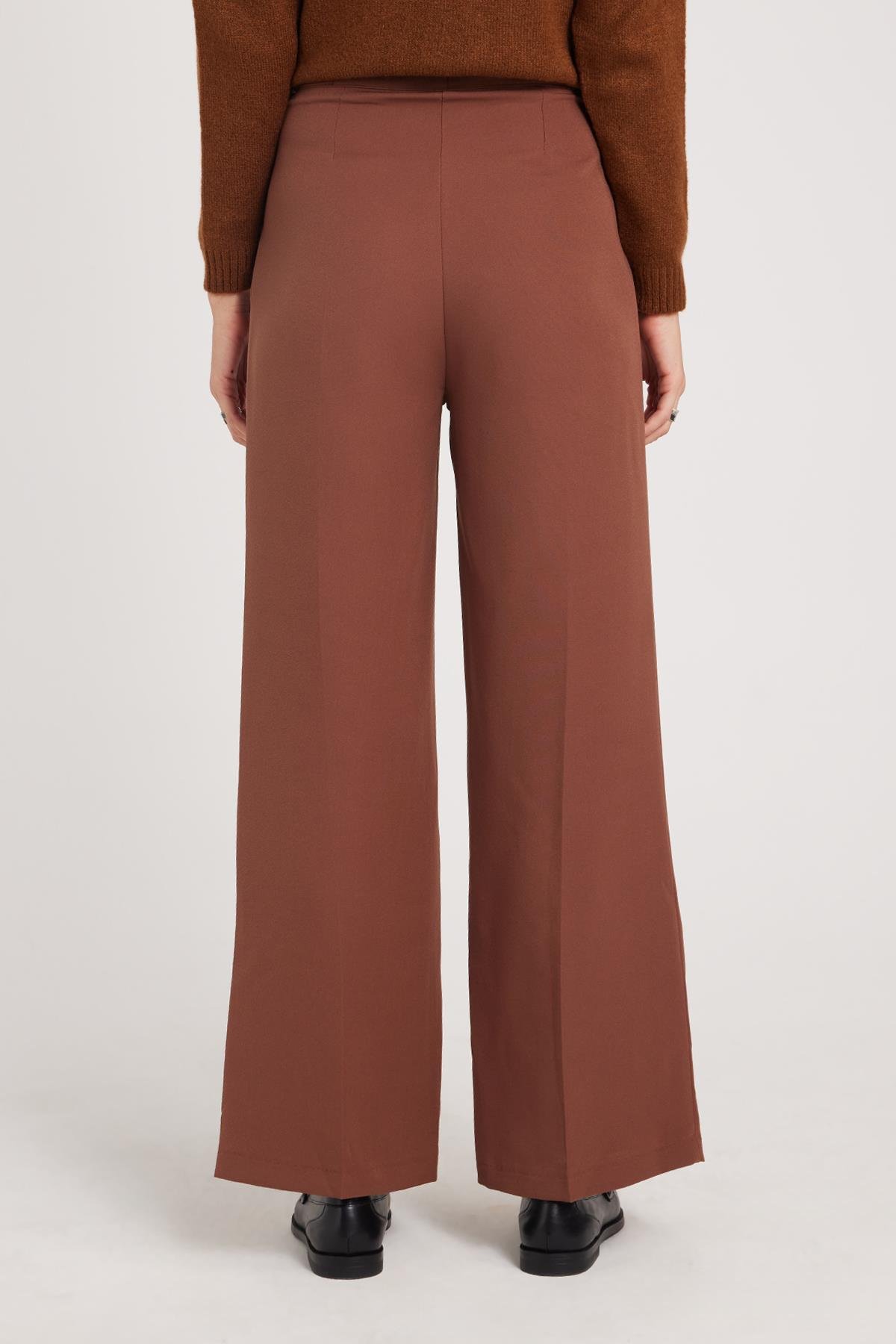 Kadın Regular Fit Klasik Kesim Cırt Kapamalı Palazzo Kahverengi Pantolon (PN250044-07)
