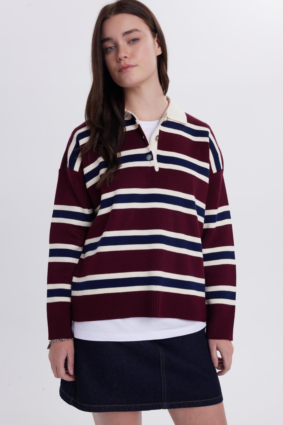 Kadın Regular Fit Klasik Kesim Çizgili Polo Yaka Bordo Kazak (BYKZ2530-08)