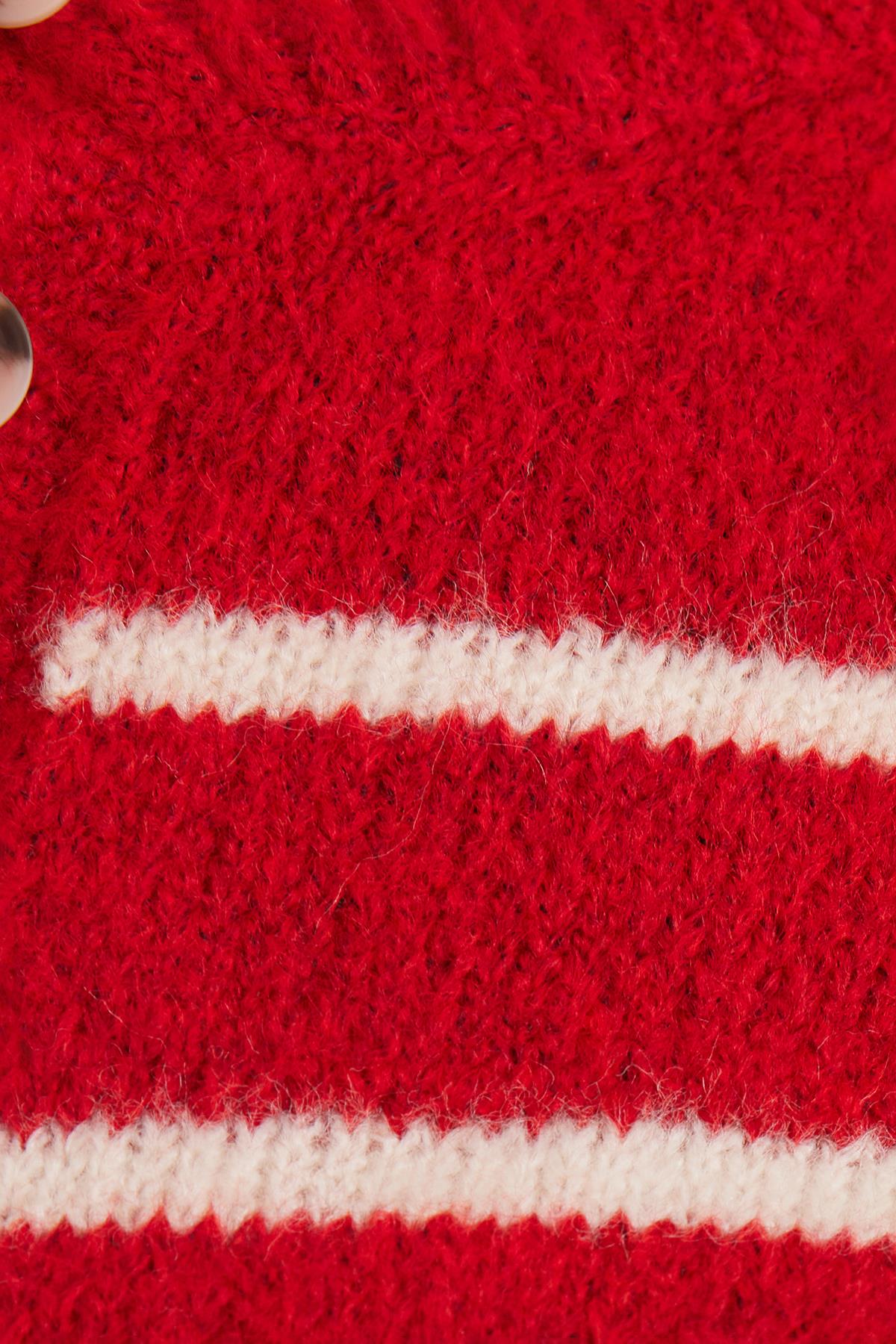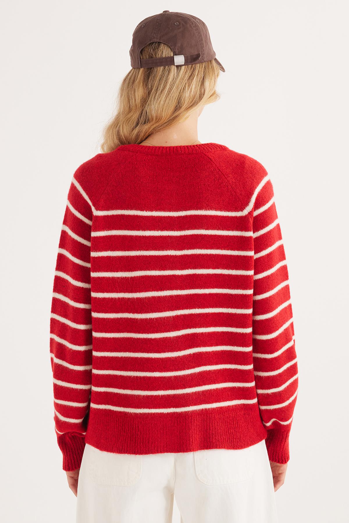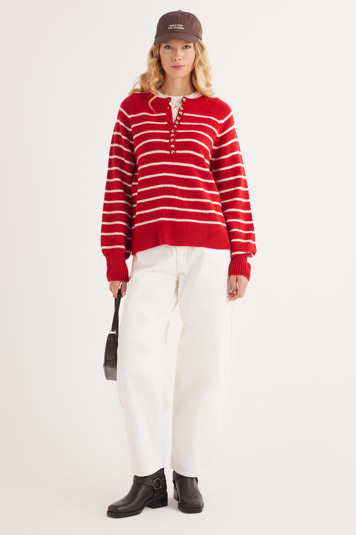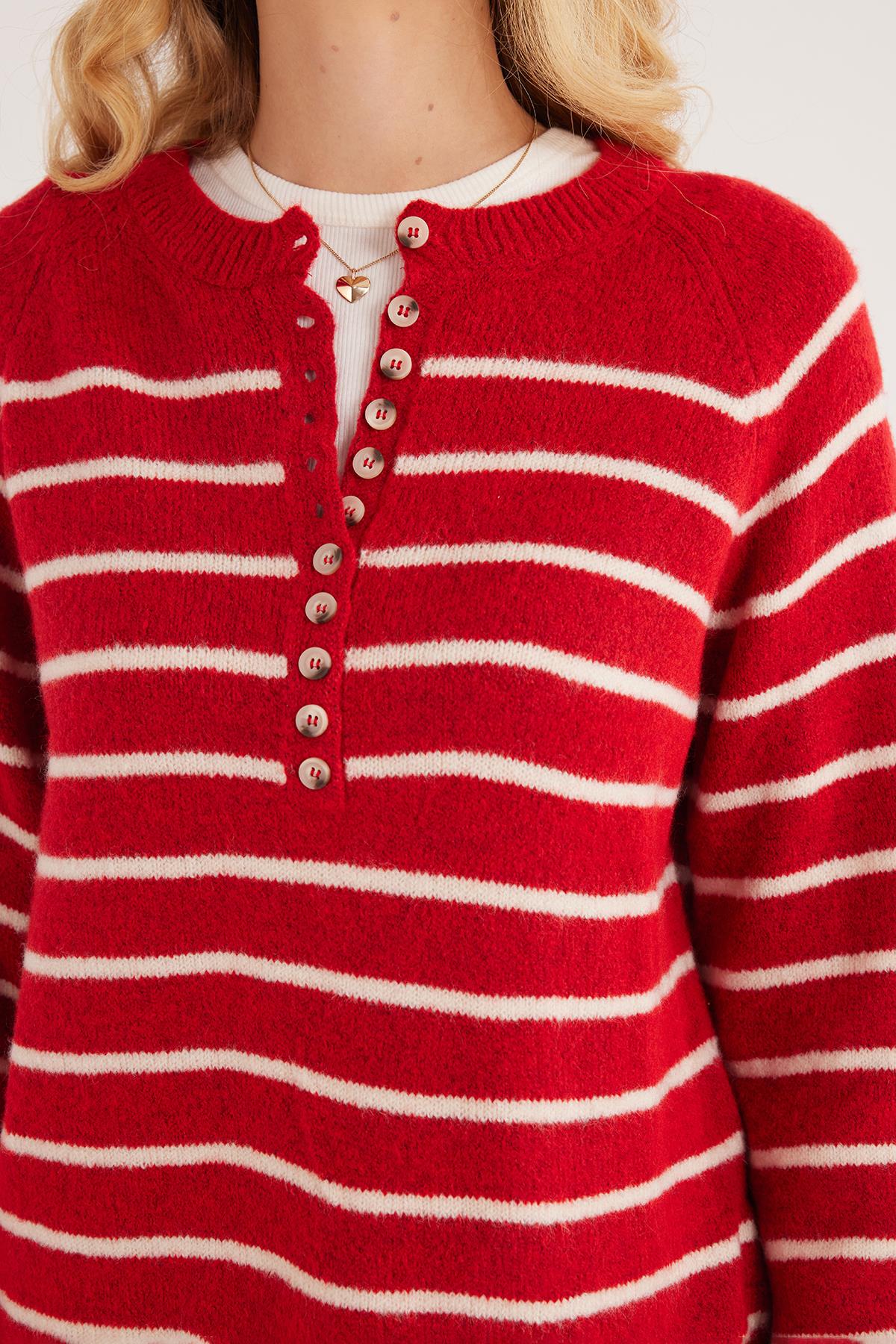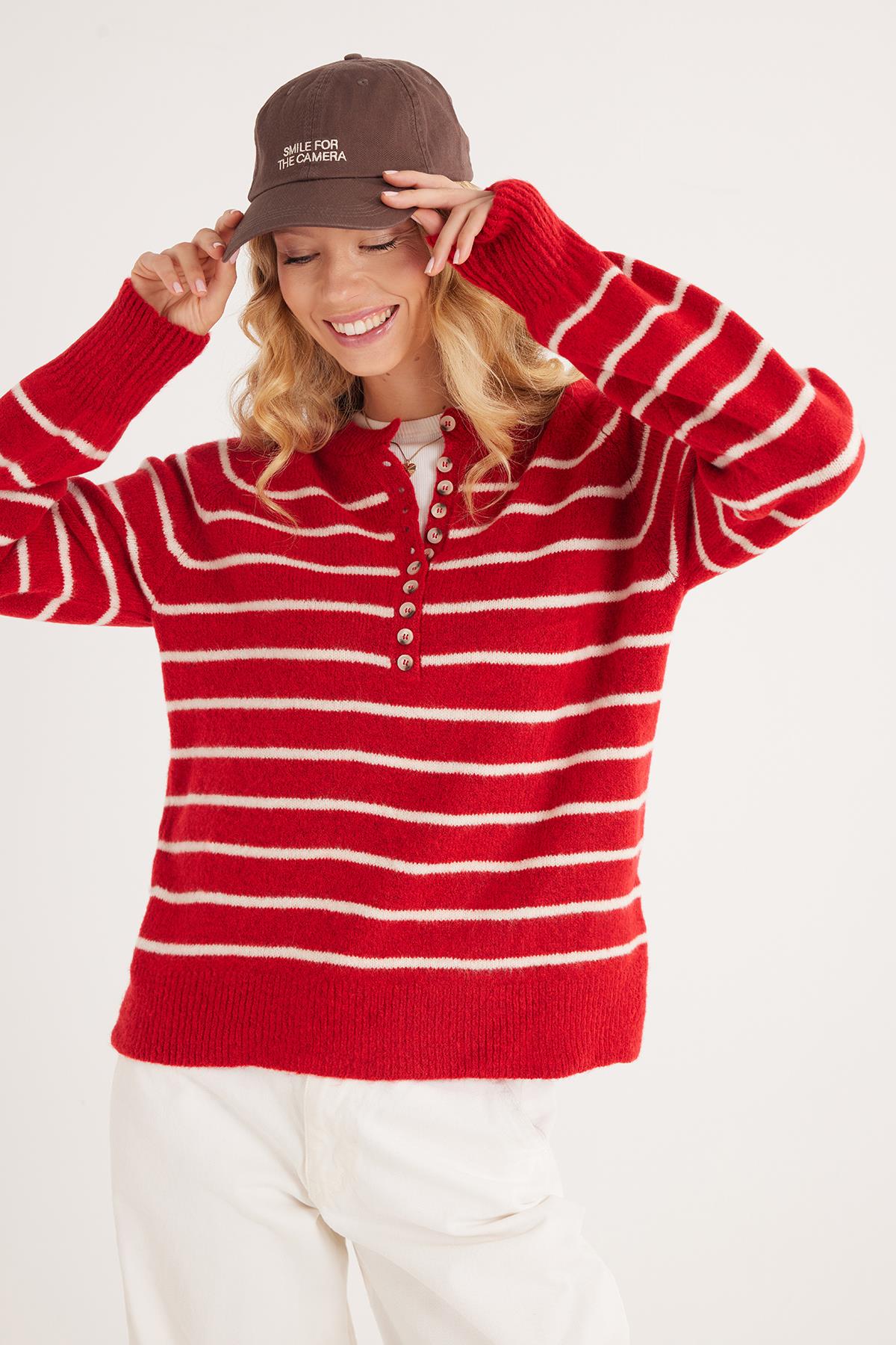 Kadın Regular Fit Klasik Kesim Düğmeli Yaka Çizgili Kırmızı Kazak