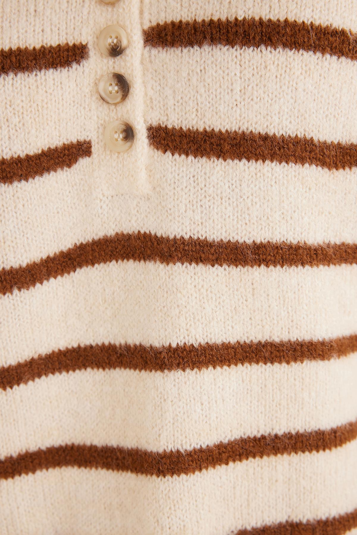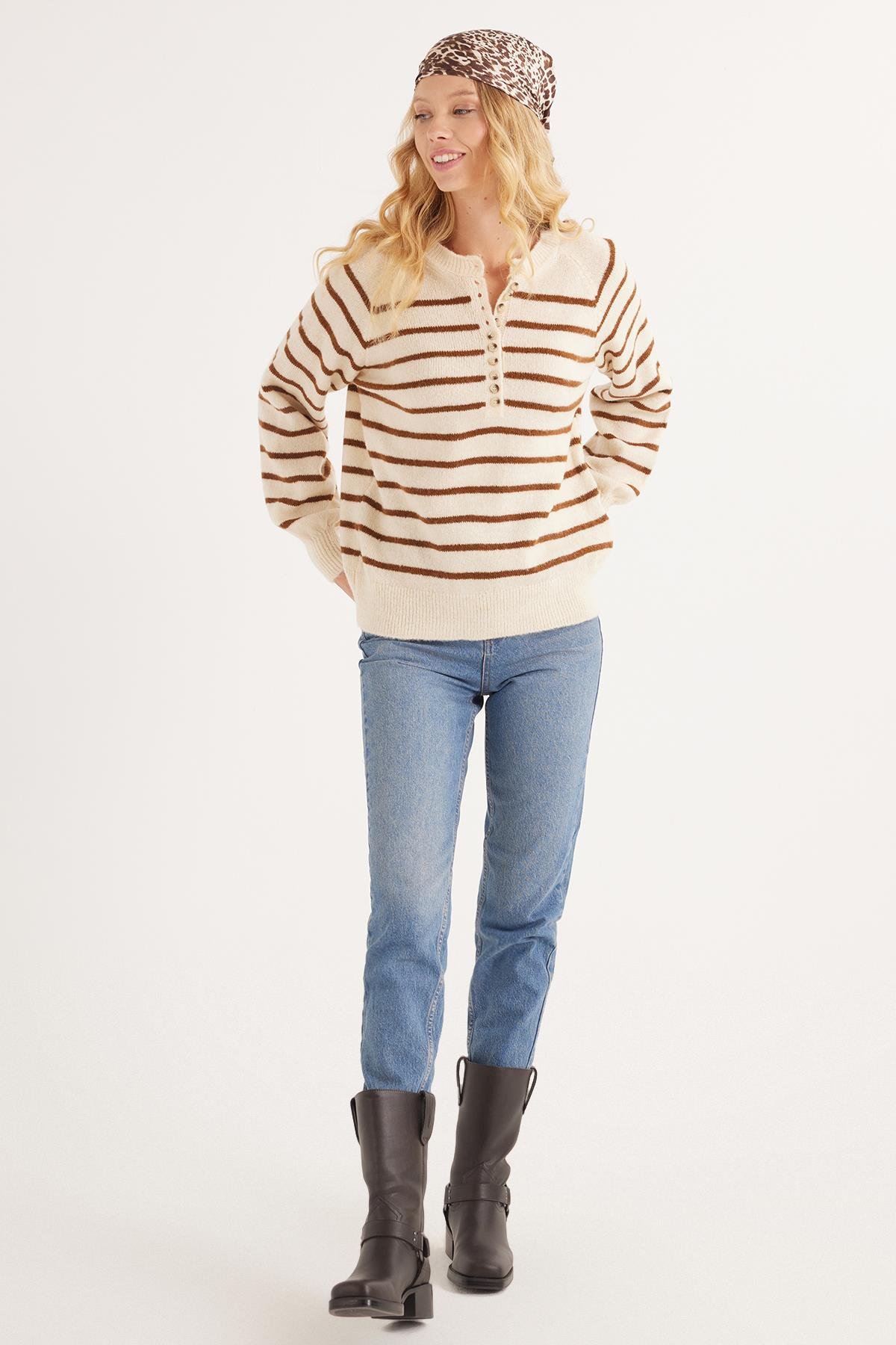 Kadın Regular Fit Klasik Kesim Düğmeli Yaka Kahverengi Çizgili Kazak