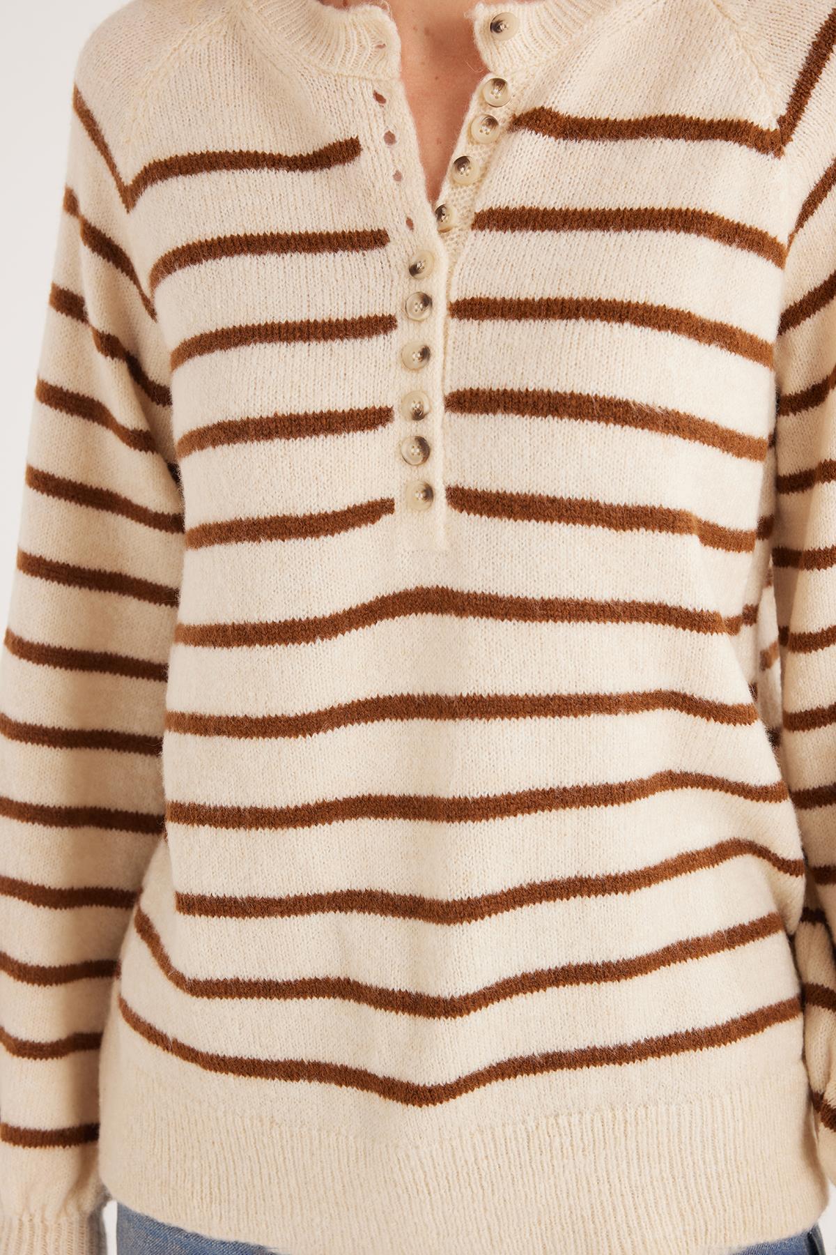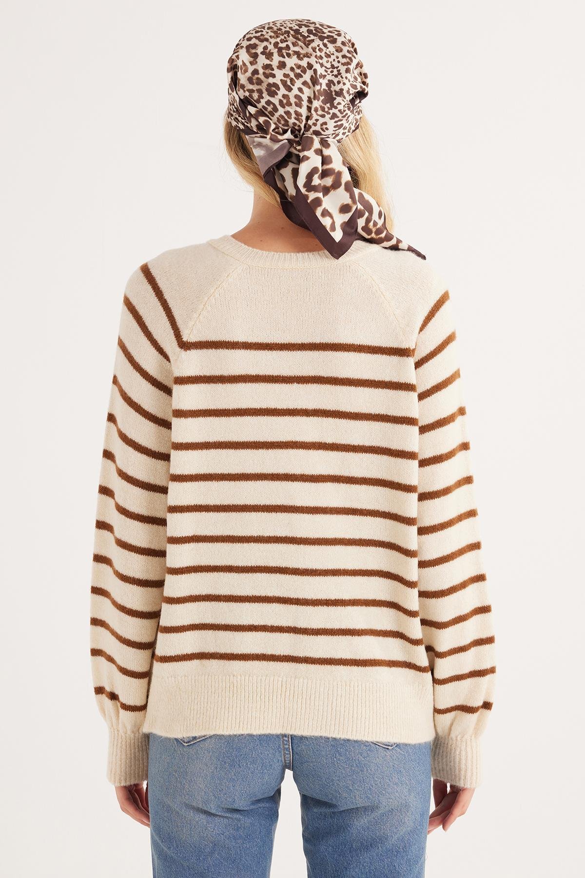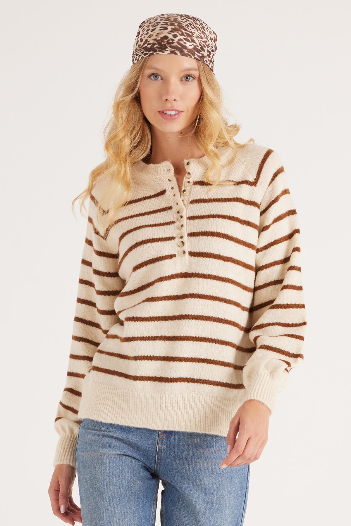 Kadın Regular Fit Klasik Kesim Düğmeli Yaka Kahverengi Çizgili Kazak (BYKZ2506-07)