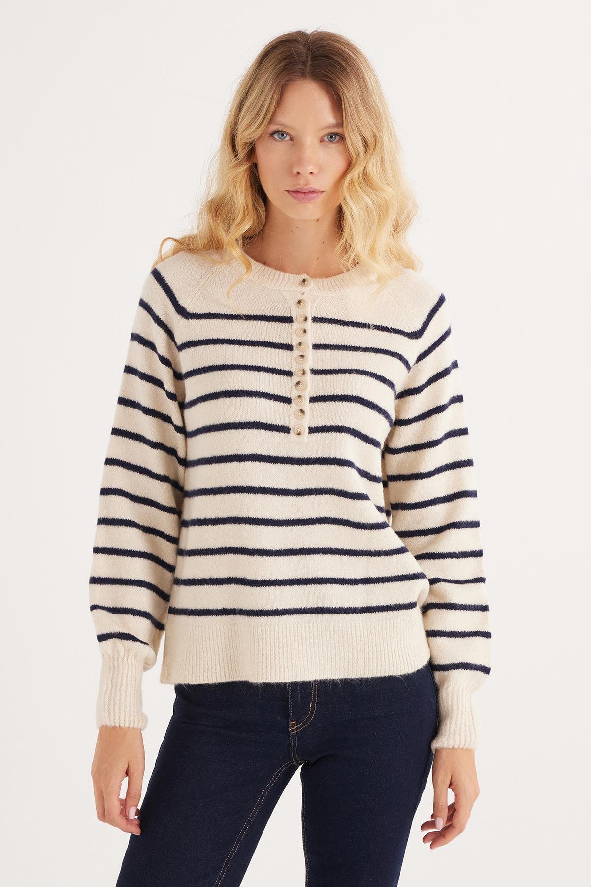 Kadın Regular Fit Klasik Kesim Düğmeli Yaka Lacivert Çizgili Kazak (BYKZ2506-47)