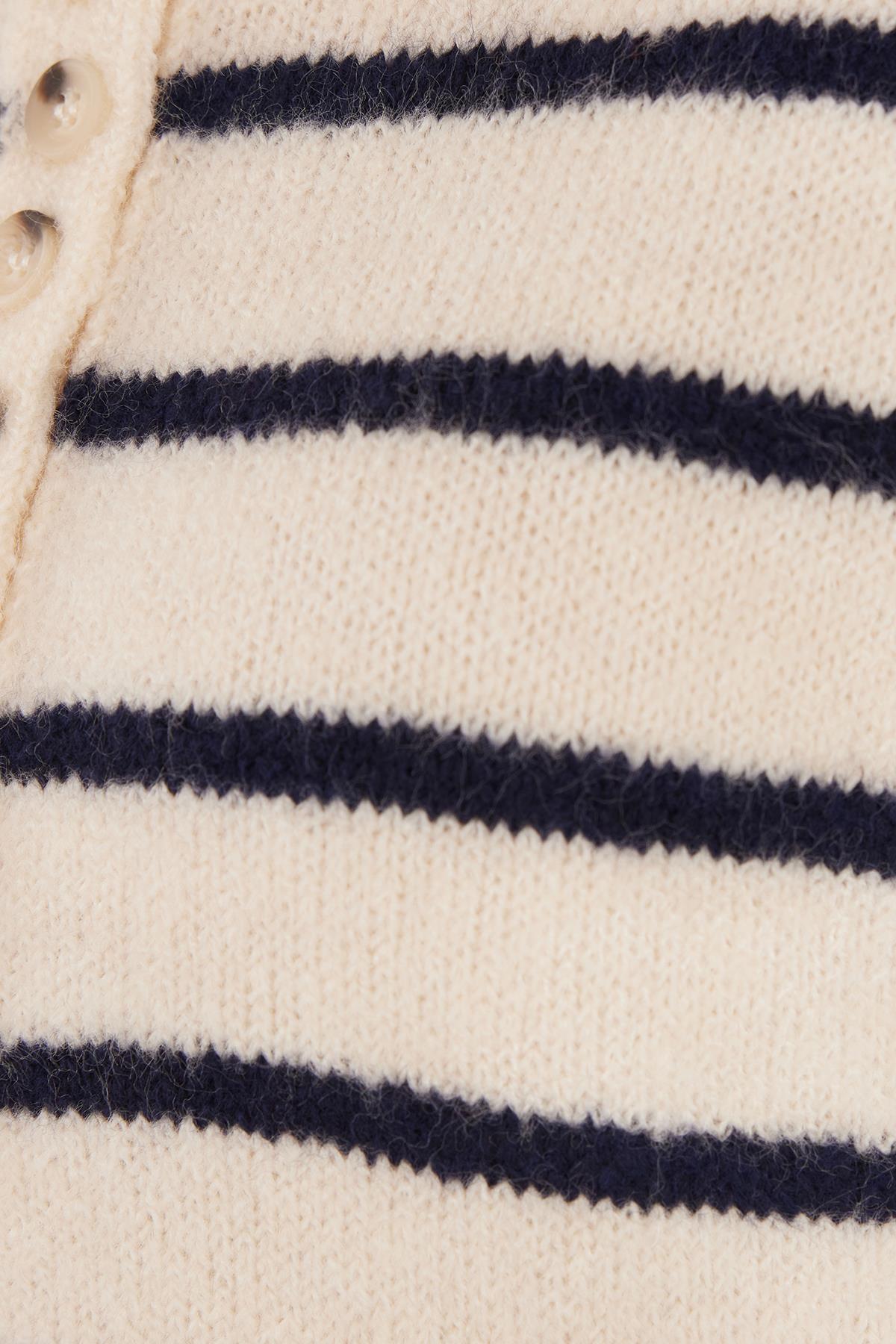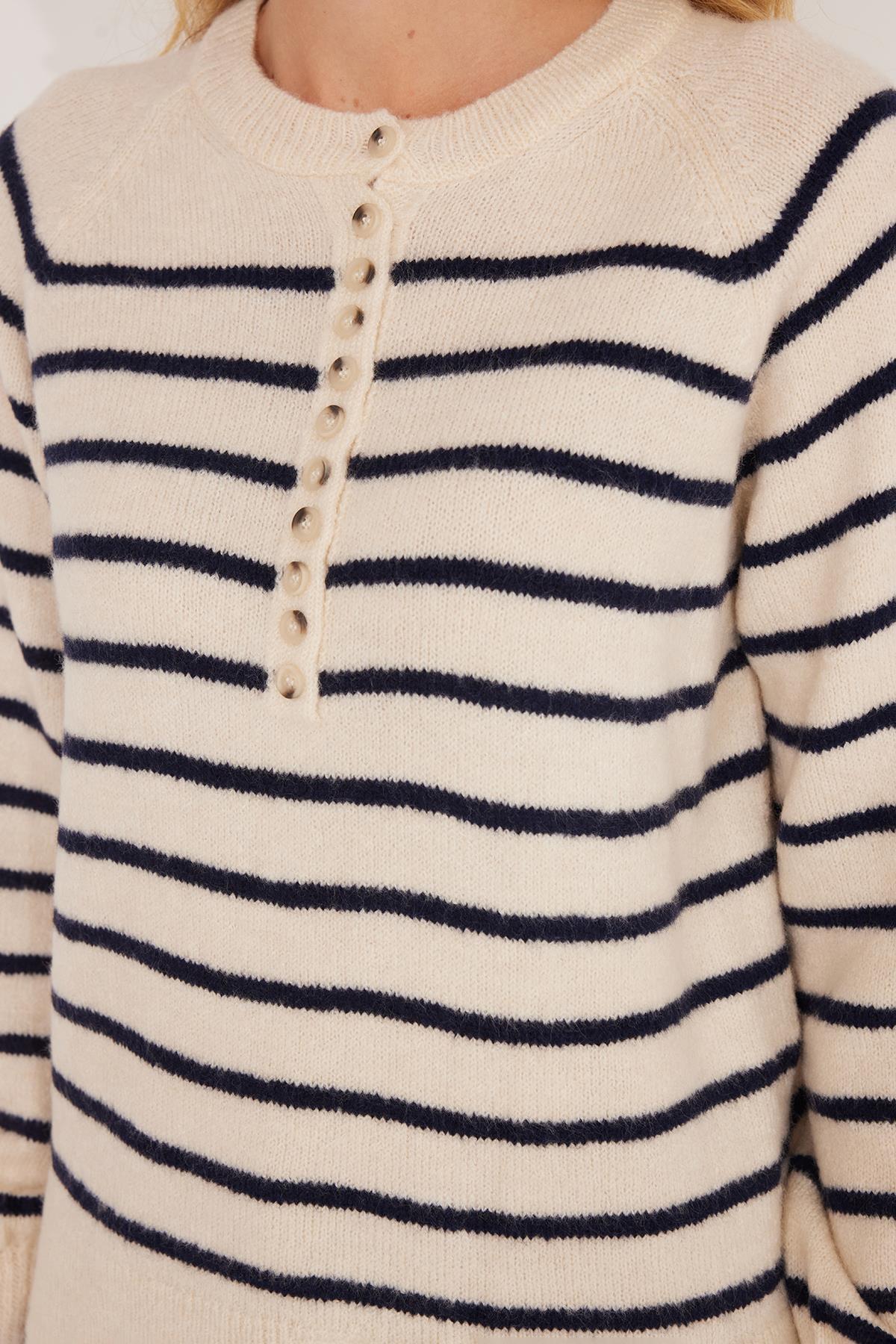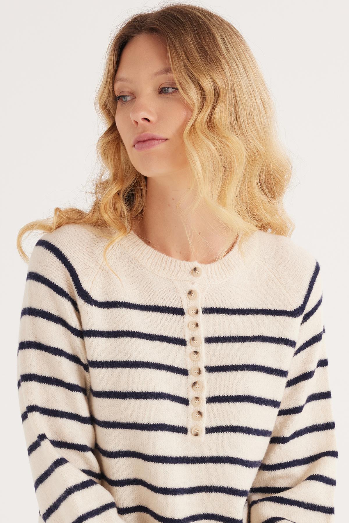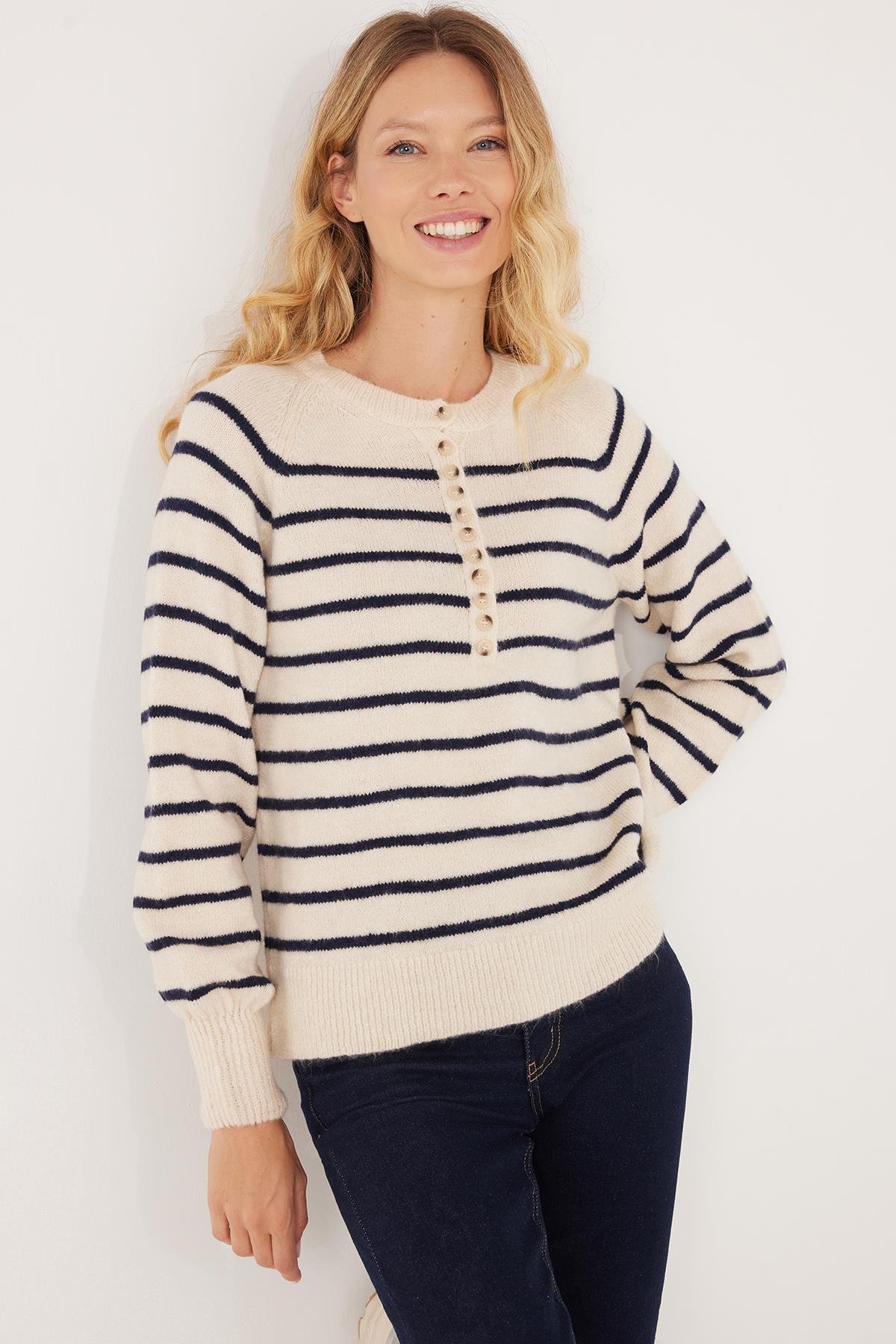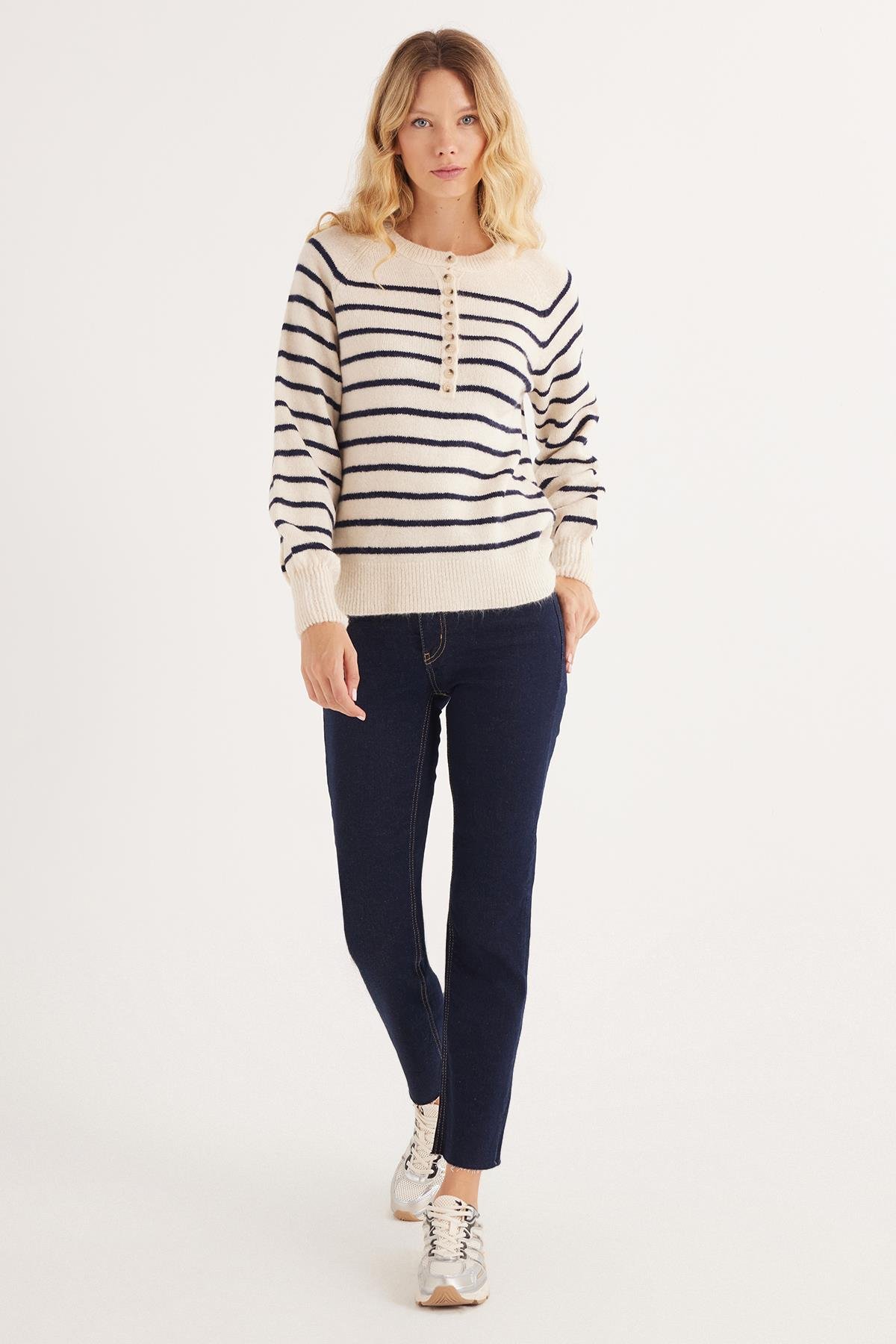 Kadın Regular Fit Klasik Kesim Düğmeli Yaka Lacivert Çizgili Kazak