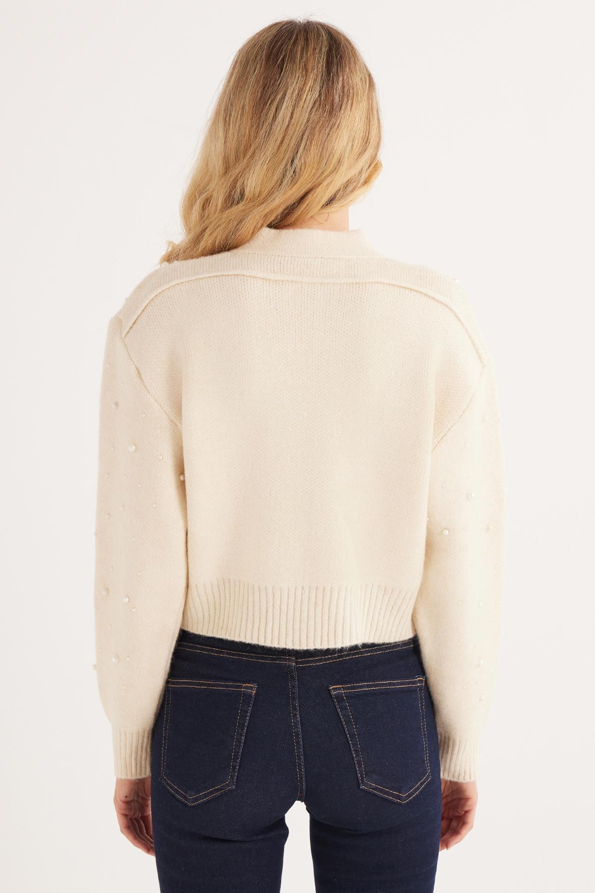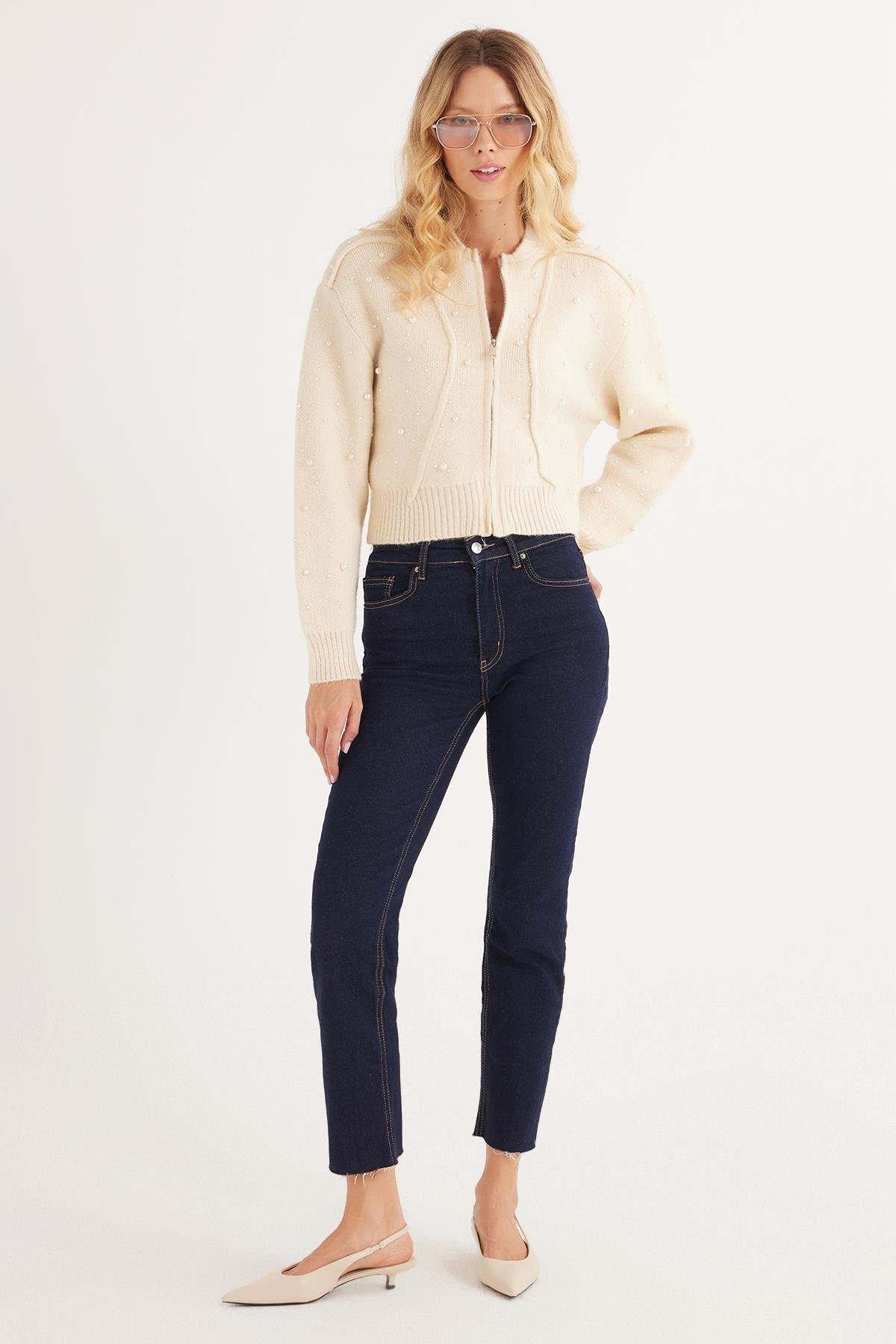 Kadın Regular Fit Klasik Kesim İnci İşlemeli Bej Hırka