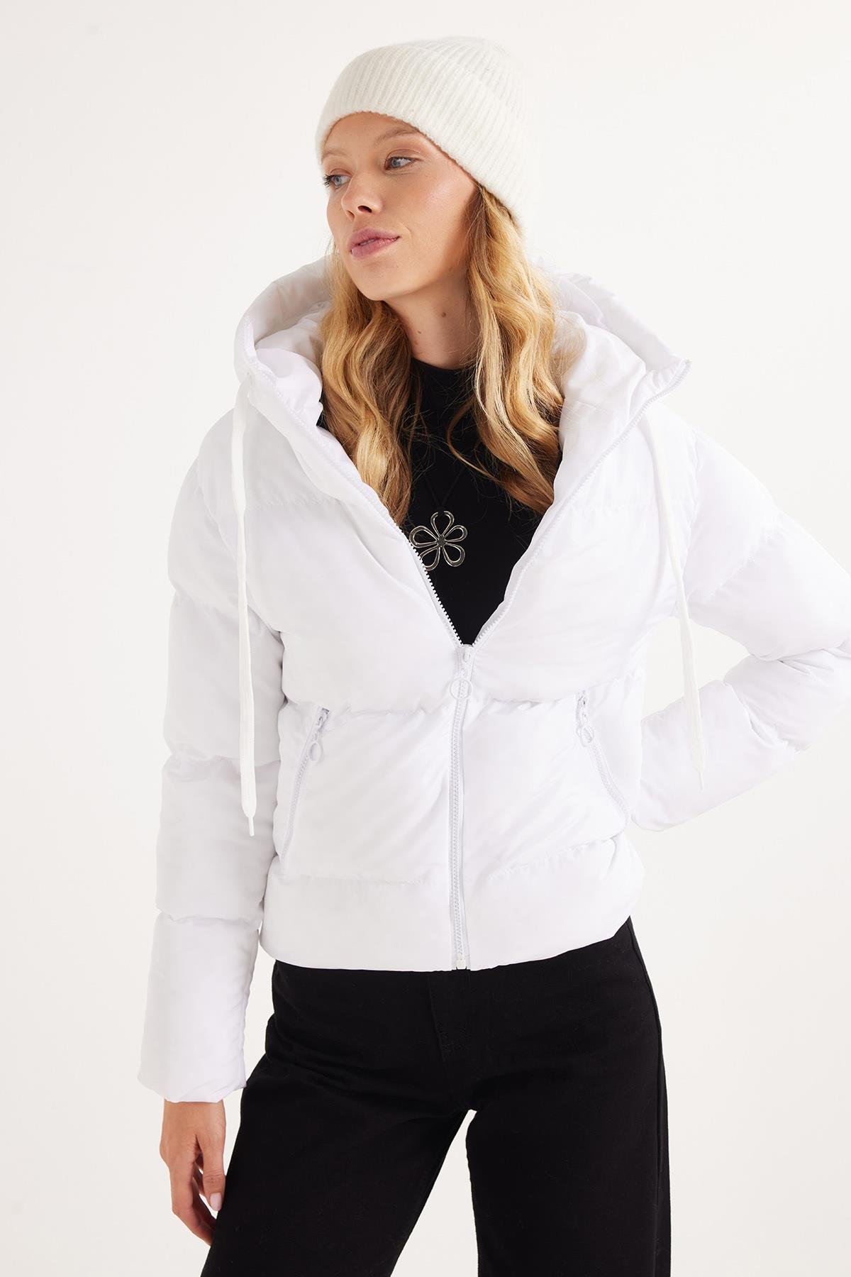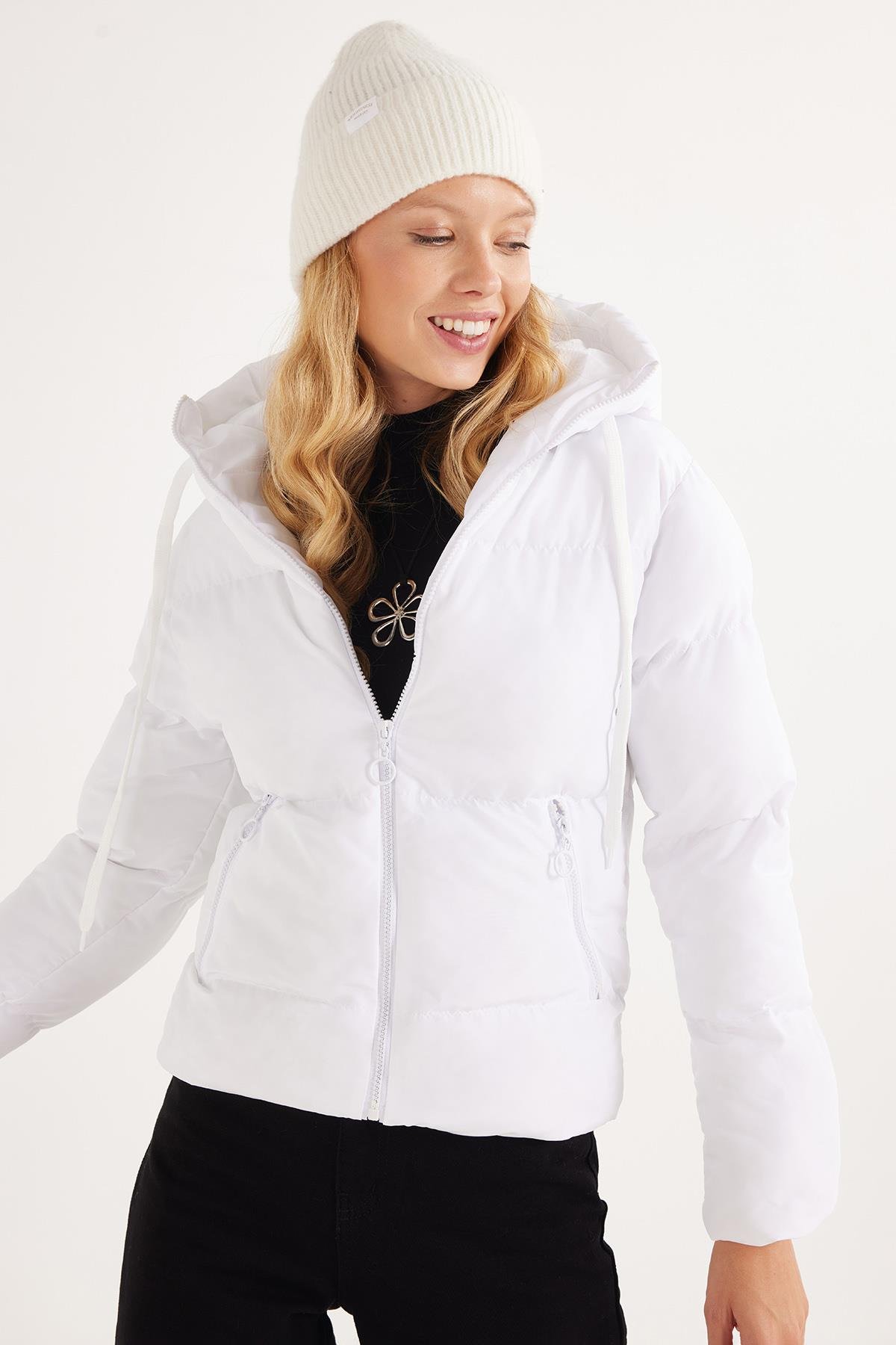 Kadın Regular Fit Klasik Kesim Kapüşonlu Şişme Beyaz Mont (KBN25001-01)