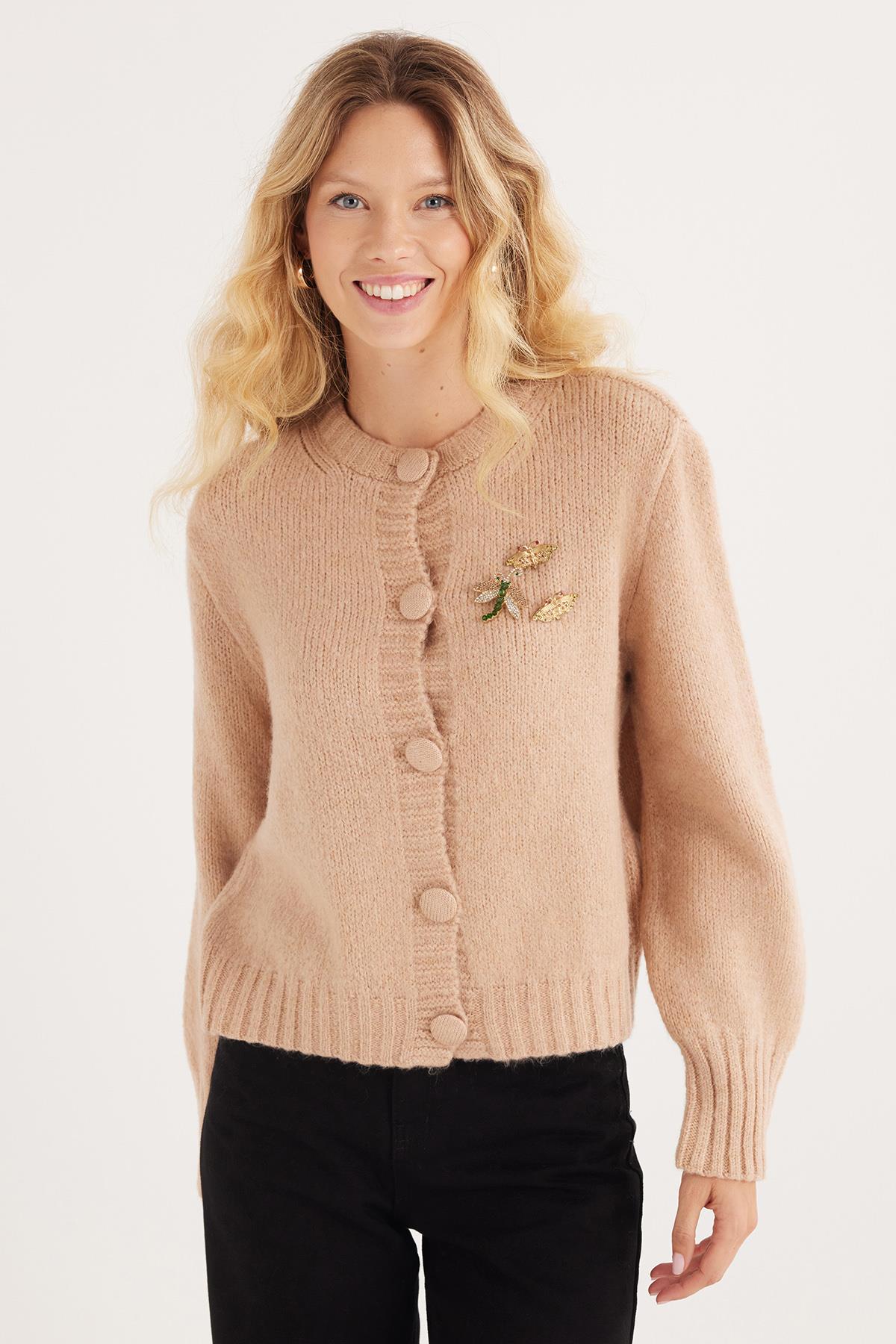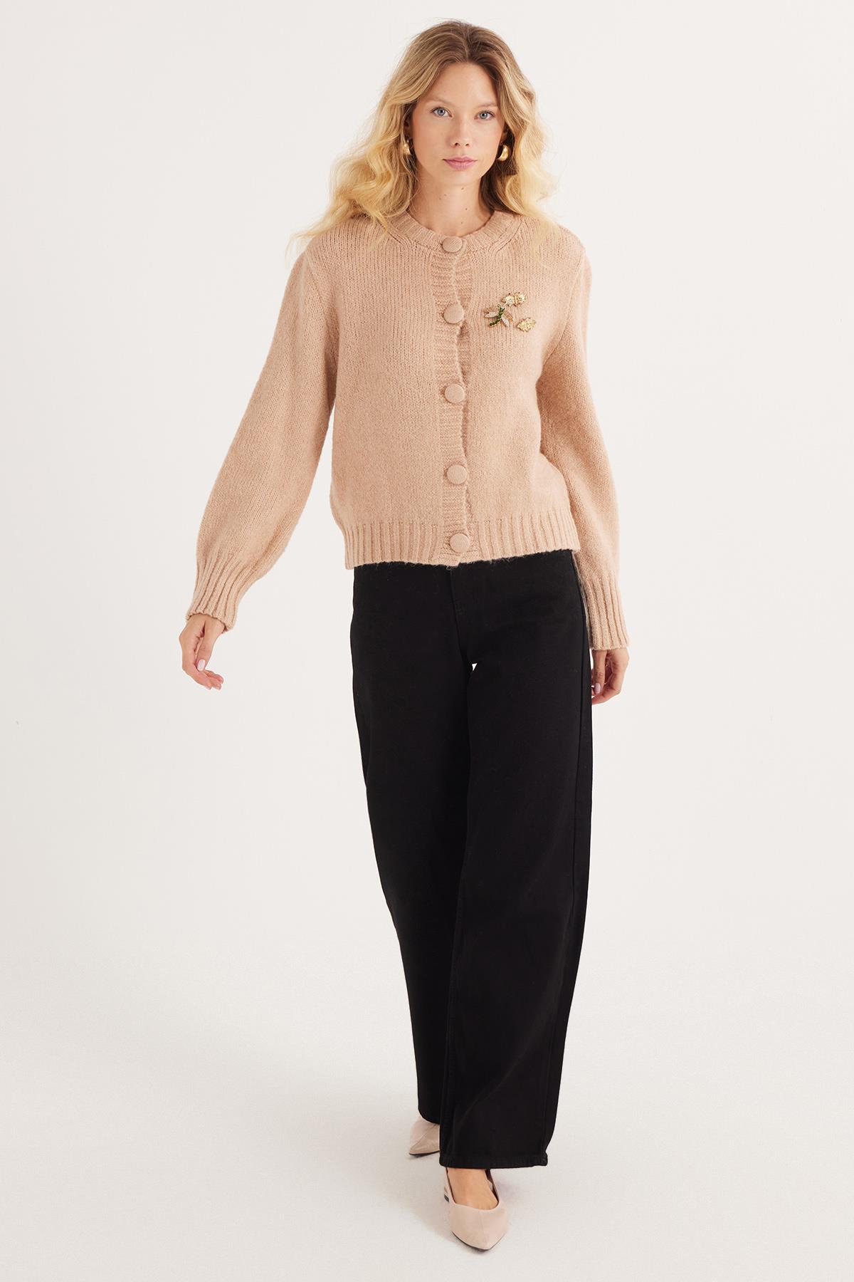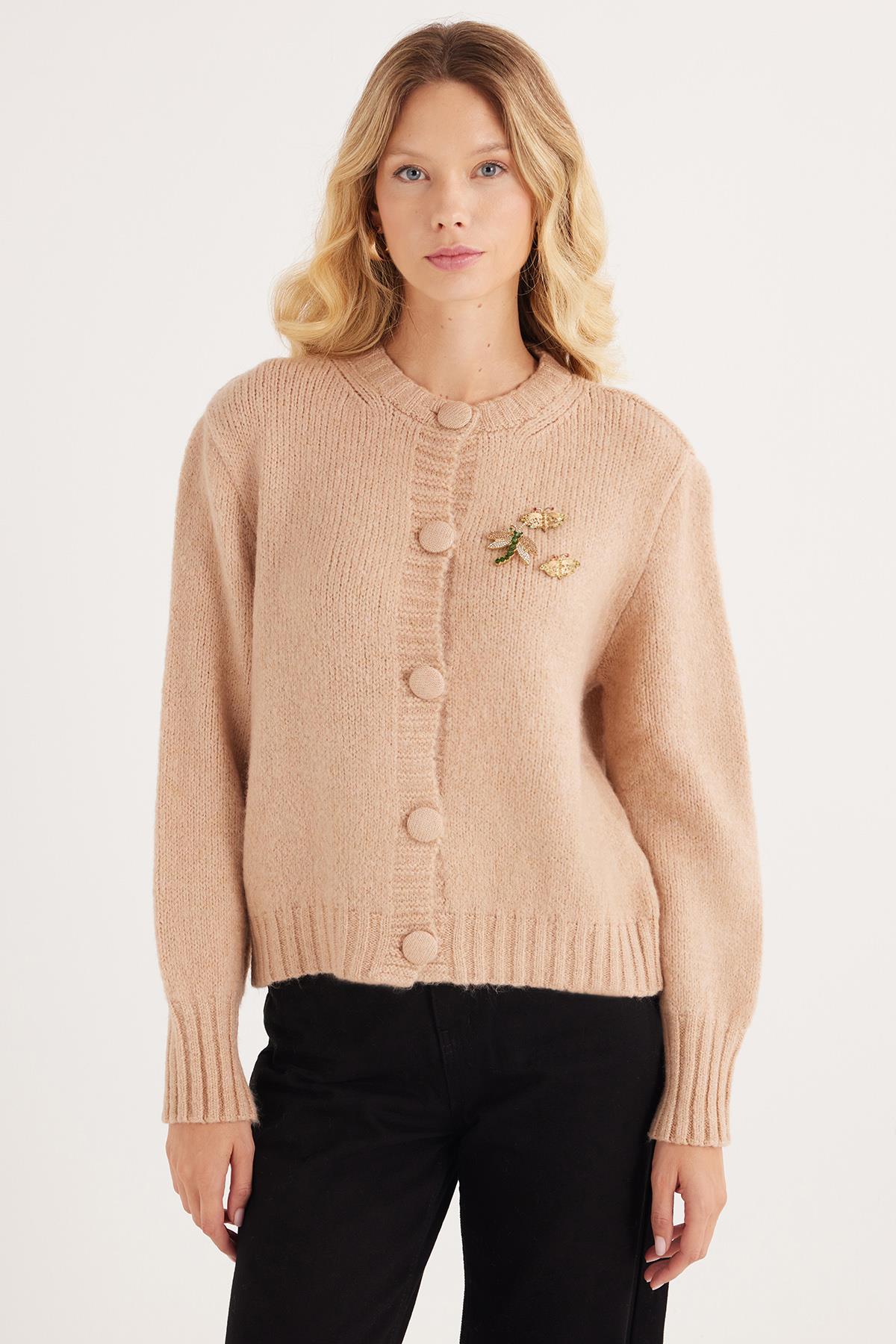 Kadın Regular Fit Klasik Kesim Kelebek İşlemeli Pudra Hırka (BYKZ2520-PUDRA)