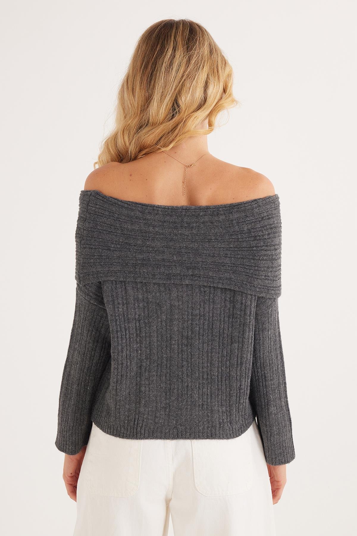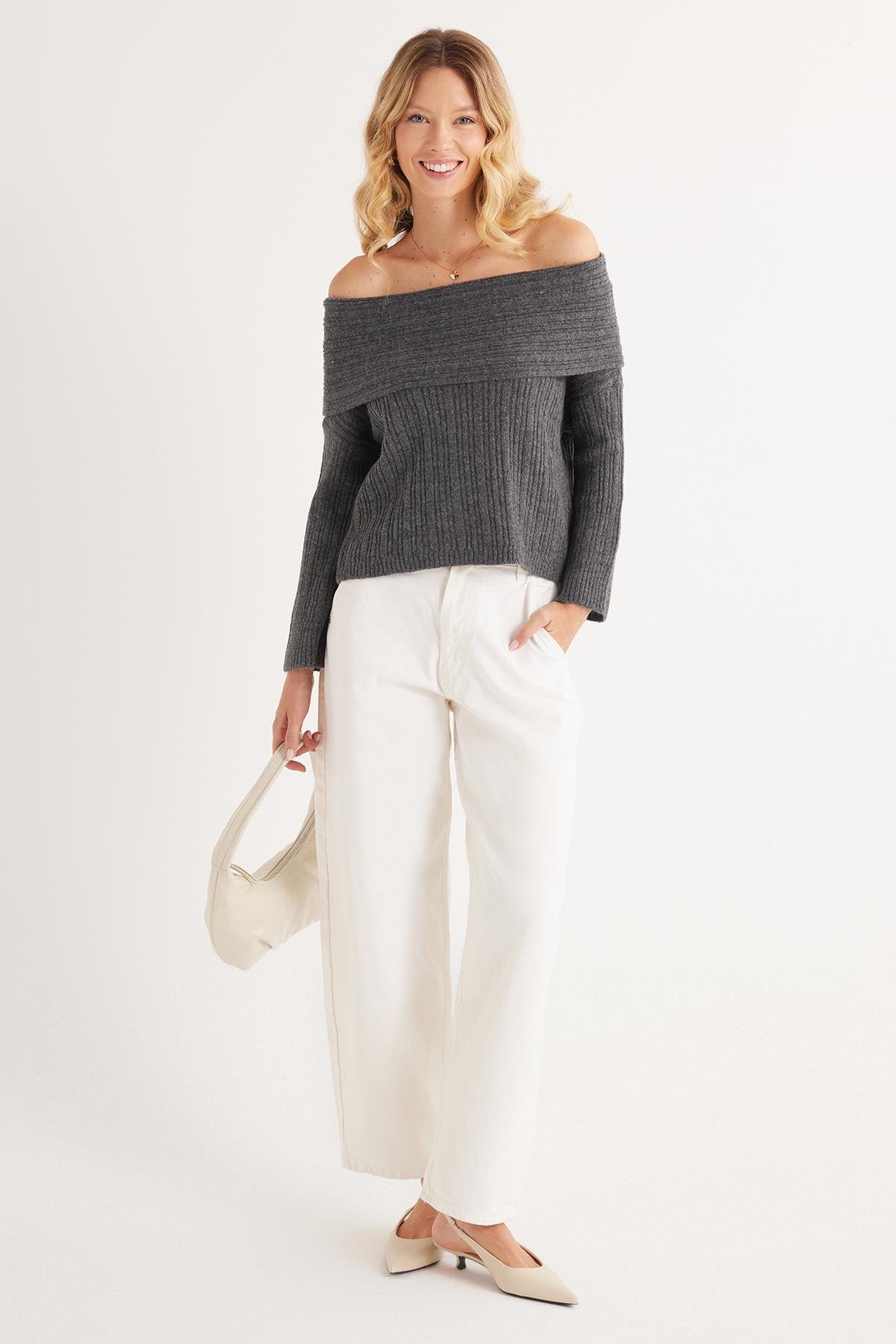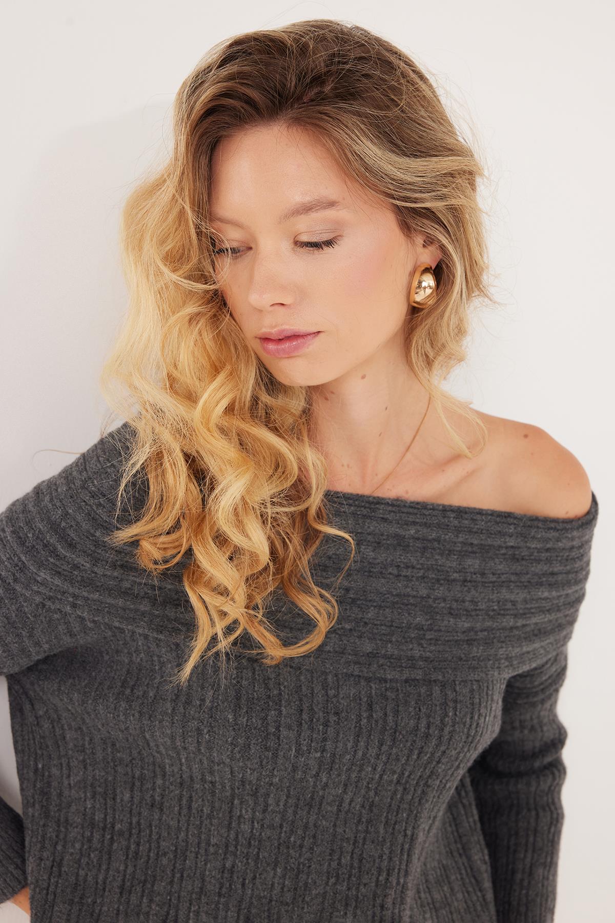 Kadın Regular Fit Klasik Kesim Uzun Kollu Omzu Açık Antrasit Kazak