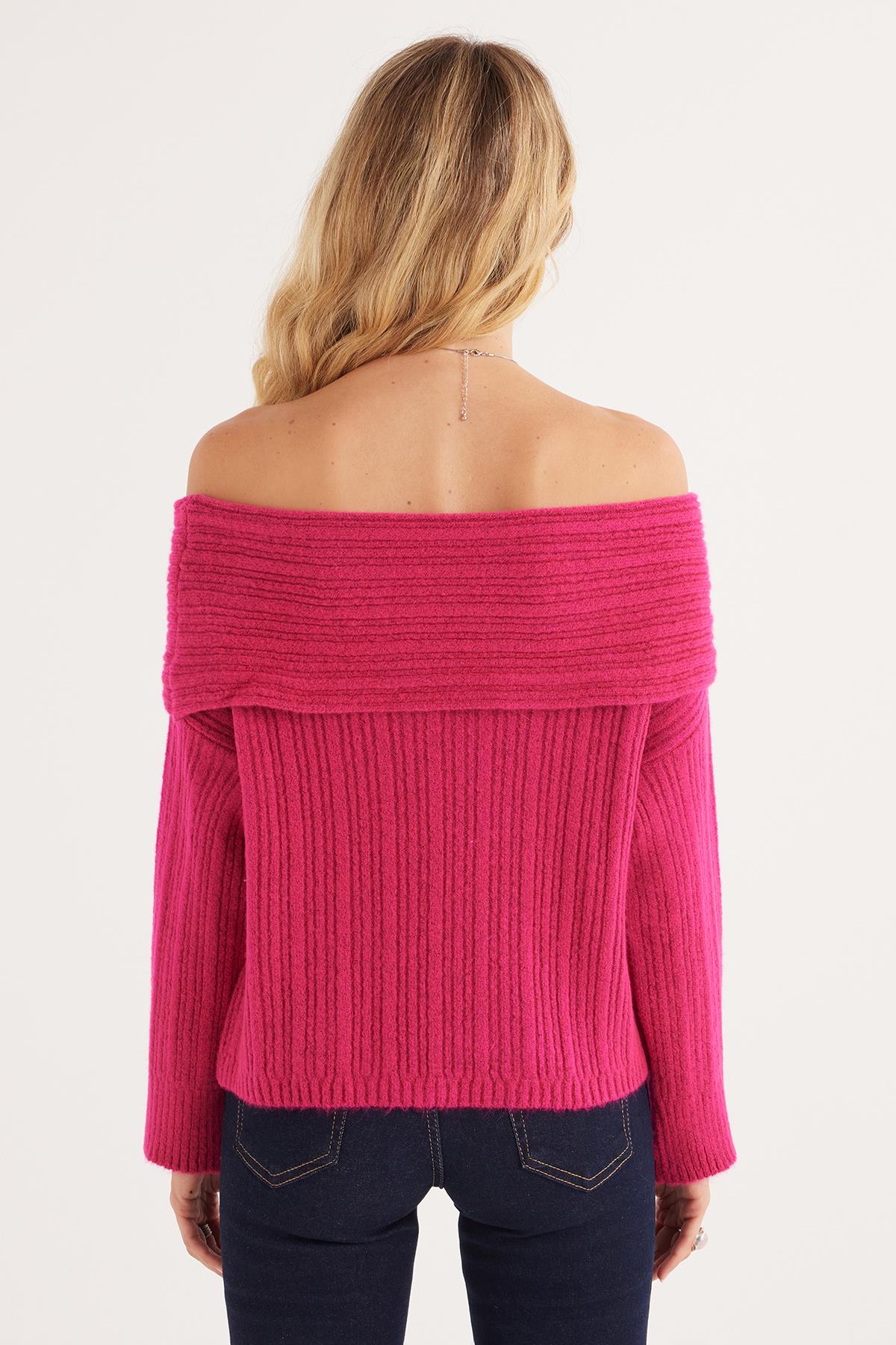 Kadın Regular Fit Klasik Kesim Uzun Kollu Omzu Açık Fuşya Kazak