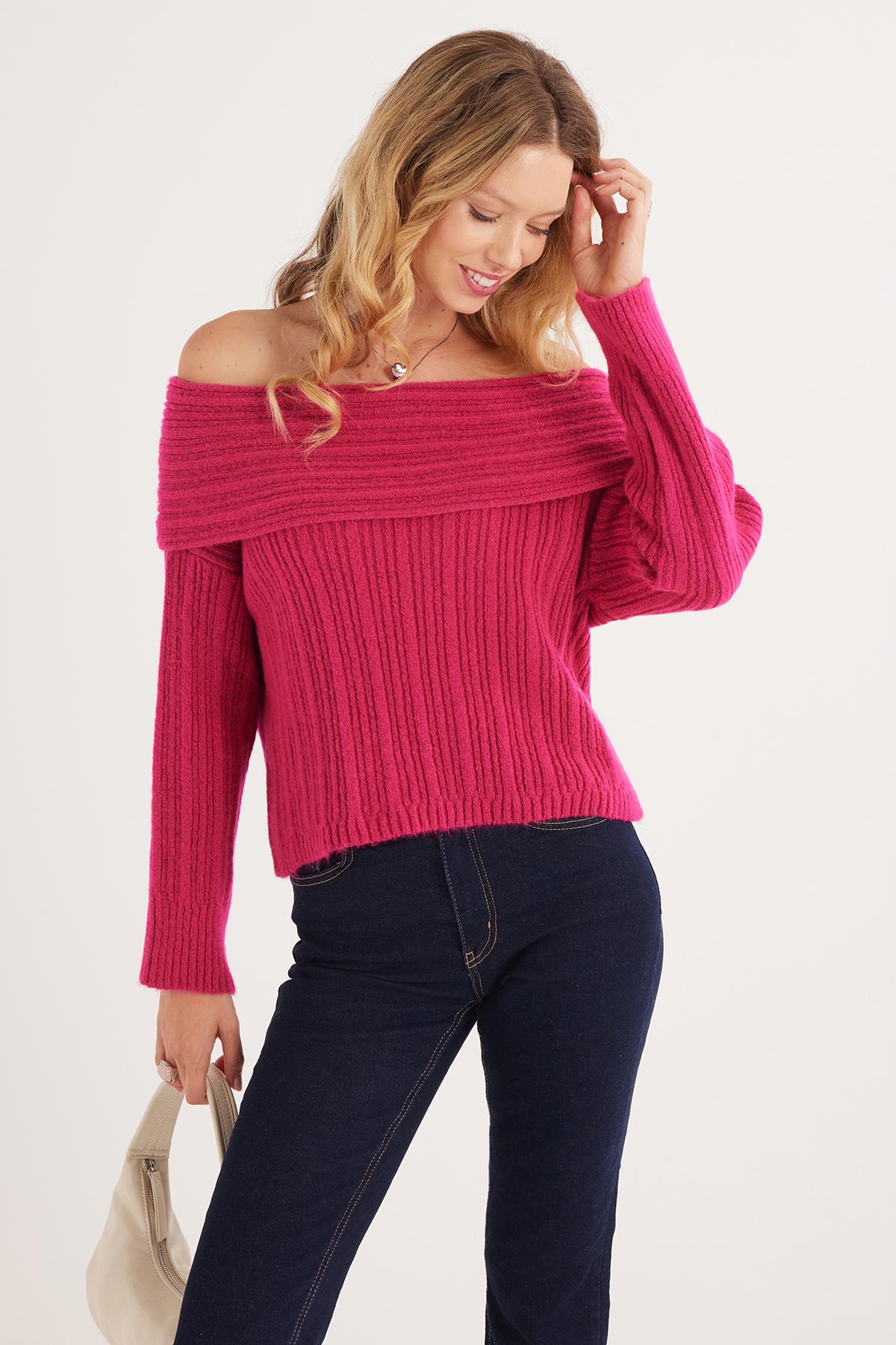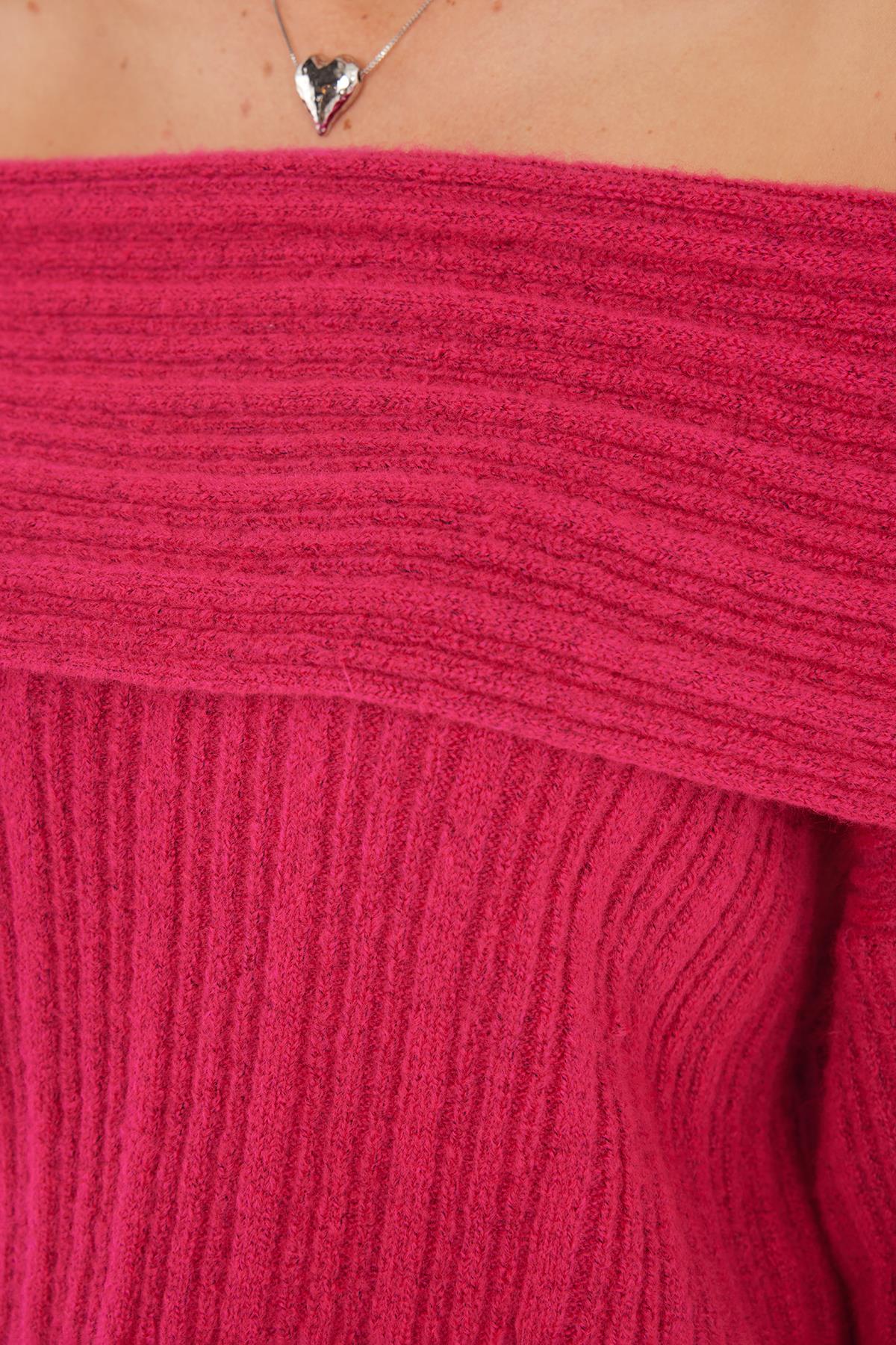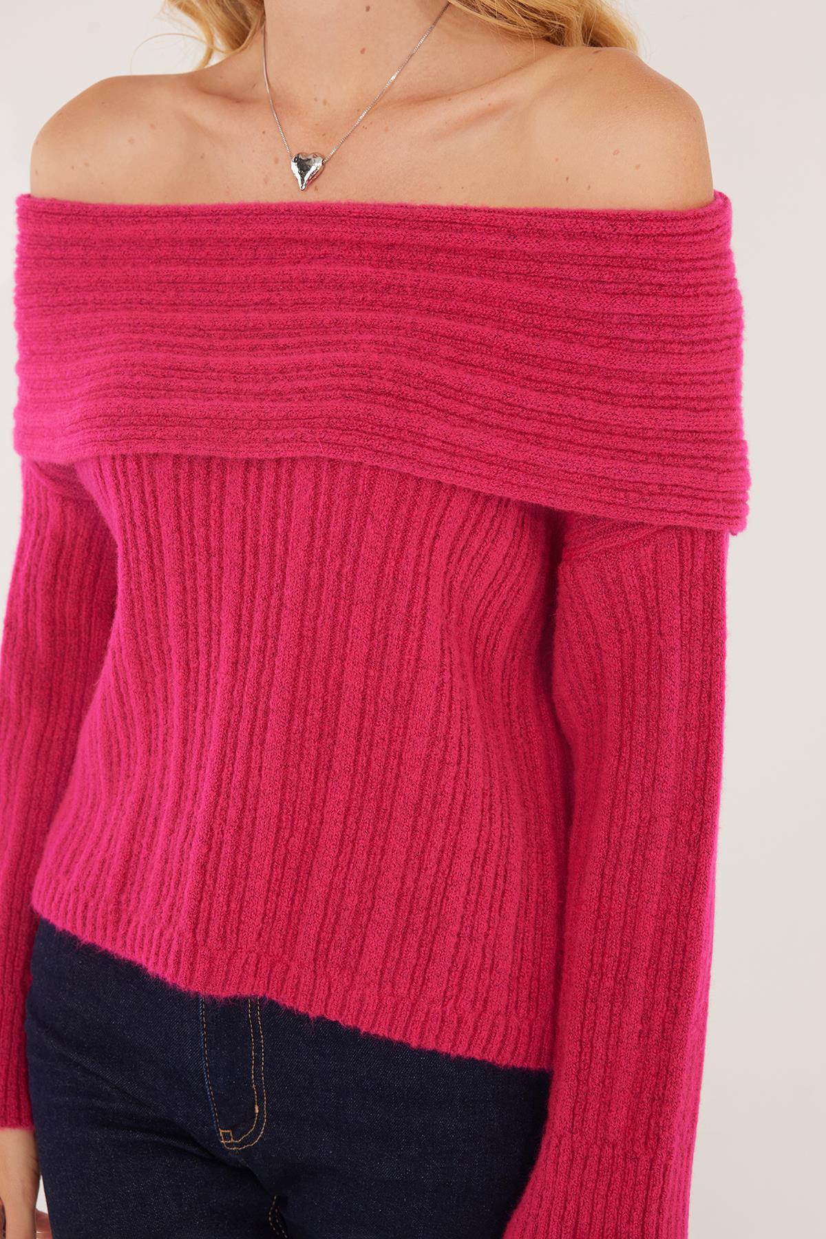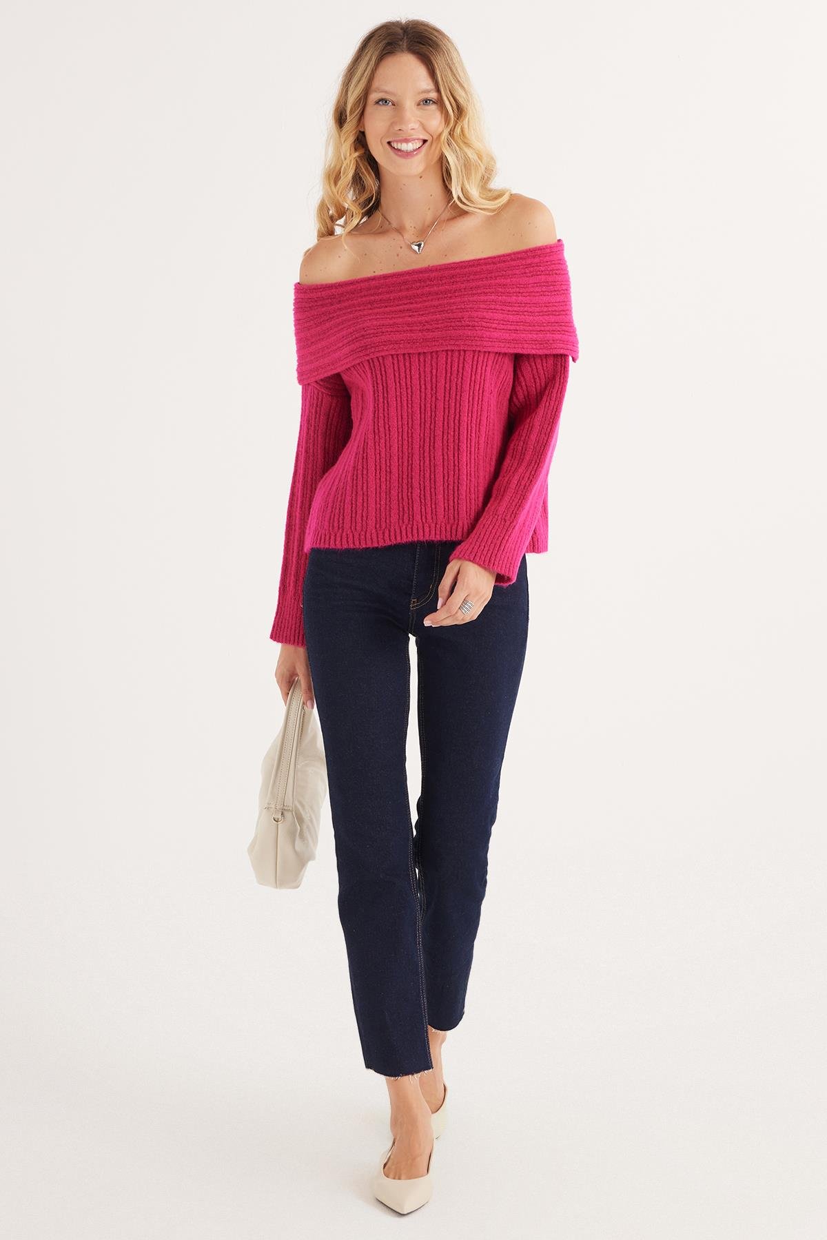 Kadın Regular Fit Klasik Kesim Uzun Kollu Omzu Açık Fuşya Kazak (BYKZ2522-25)