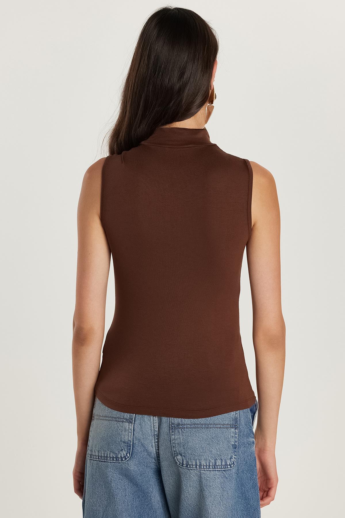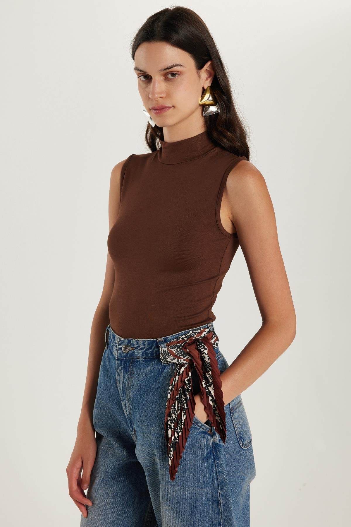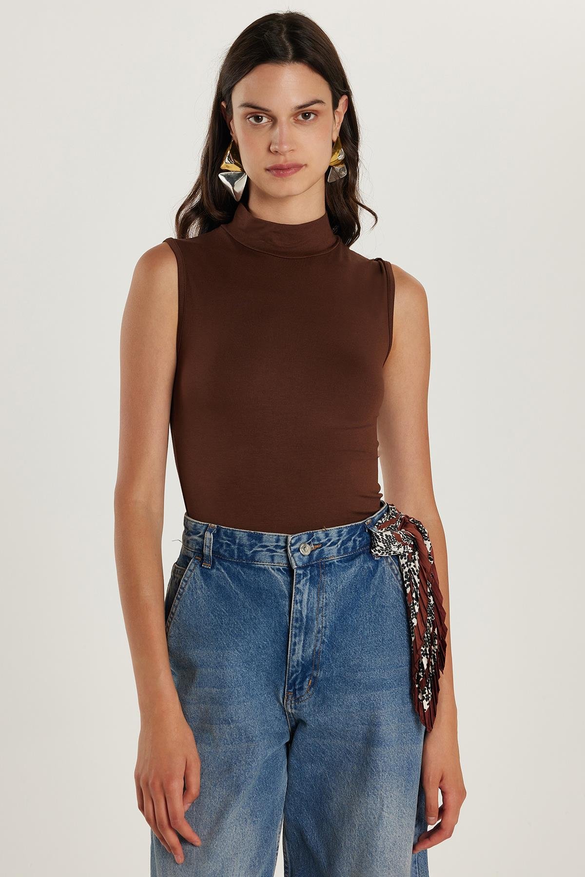 Kadın Regular Fit Klasik Kesim Viskon Kumaş Balıkçı Yaka Sıfır Kol Kahverengi Bluz (BYGM2542-07)