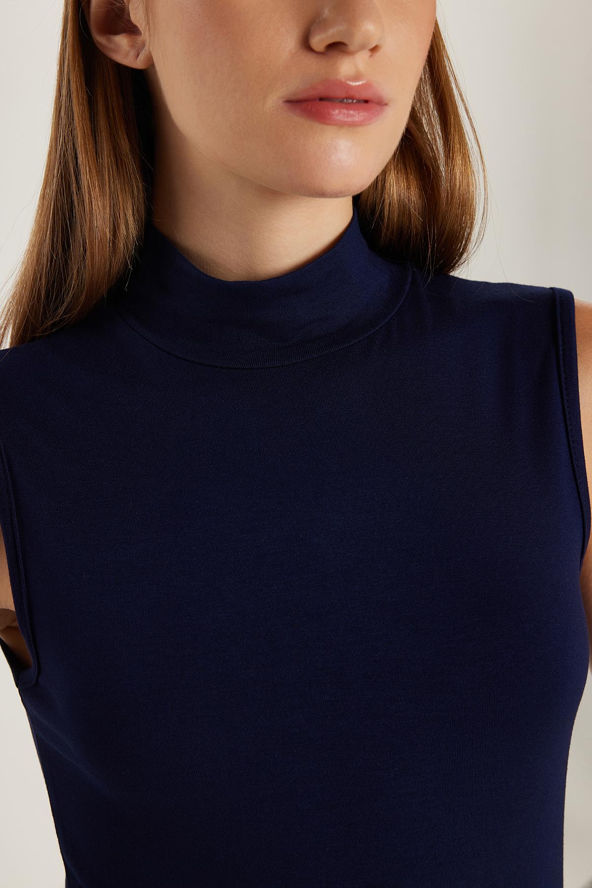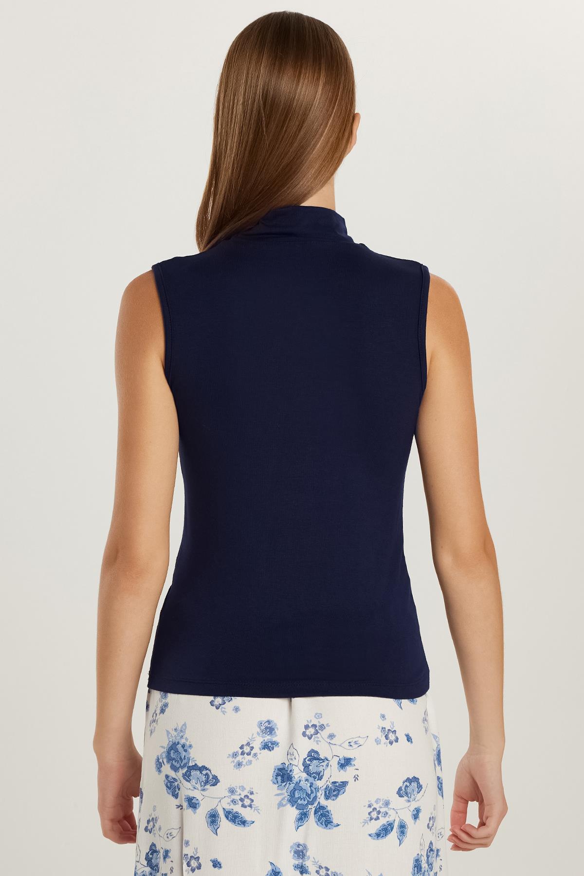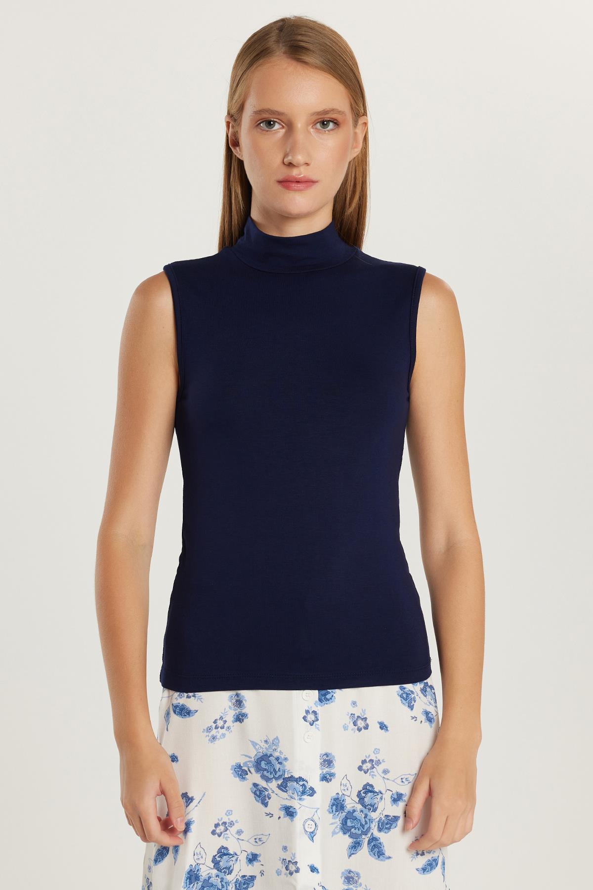 Kadın Regular Fit Klasik Kesim Viskon Kumaş Balıkçı Yaka Sıfır Kol Lacivert Bluz (BYGM2542-47)