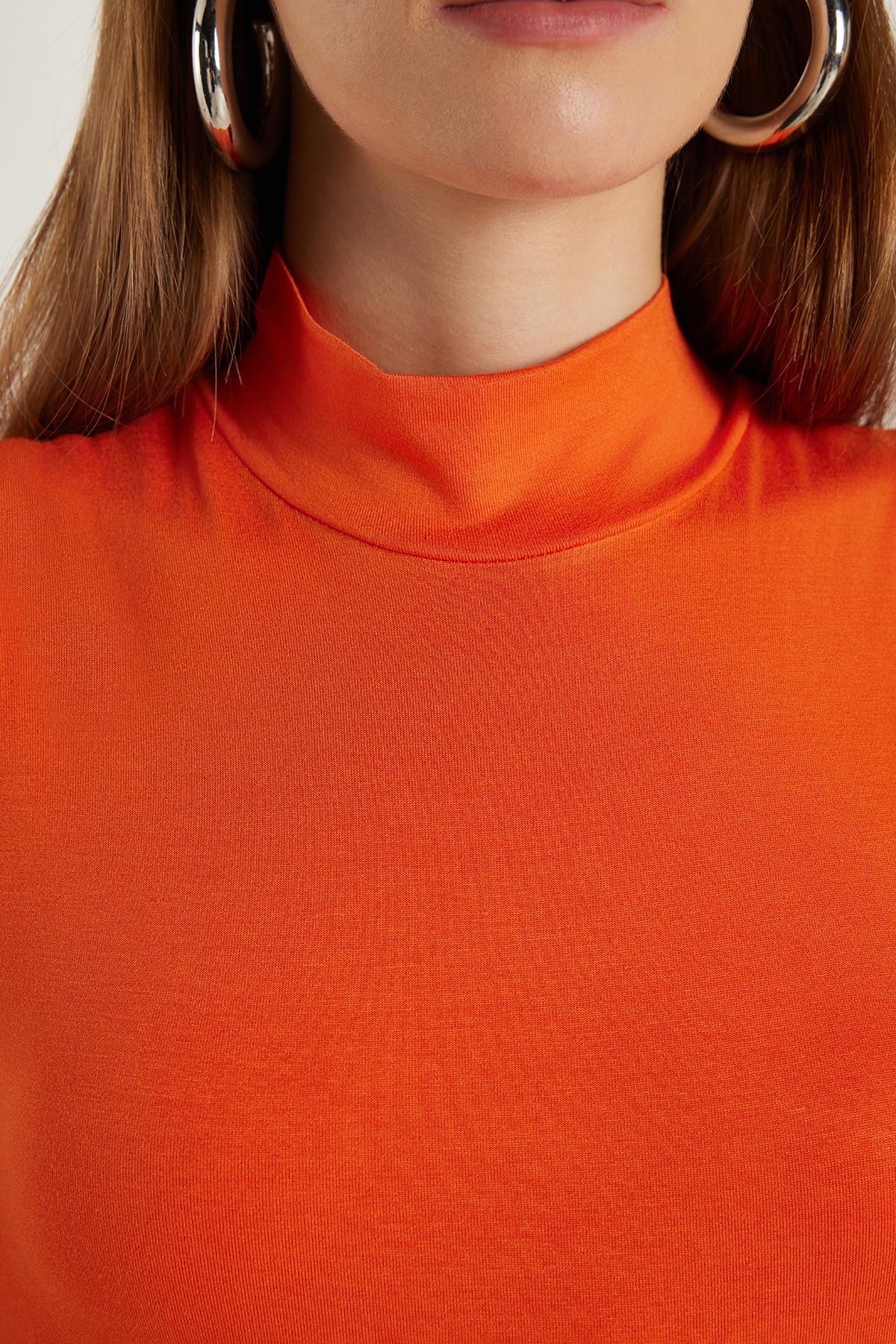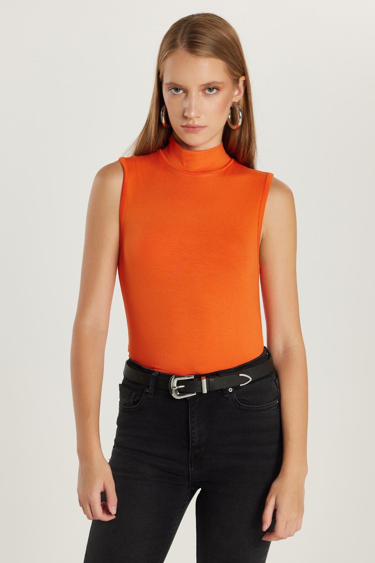 Kadın Regular Fit Klasik Kesim Viskon Kumaş Balıkçı Yaka Sıfır Kol Turuncu Bluz (BYGM2542-09)