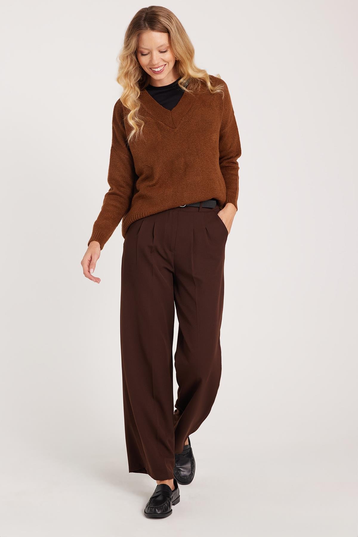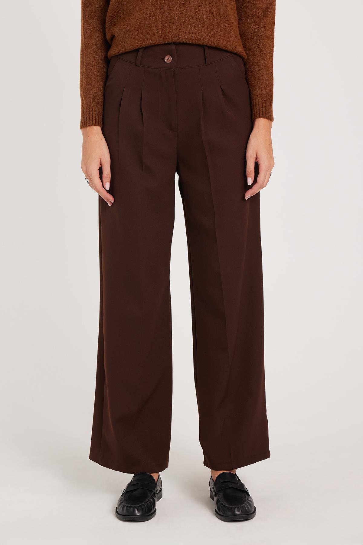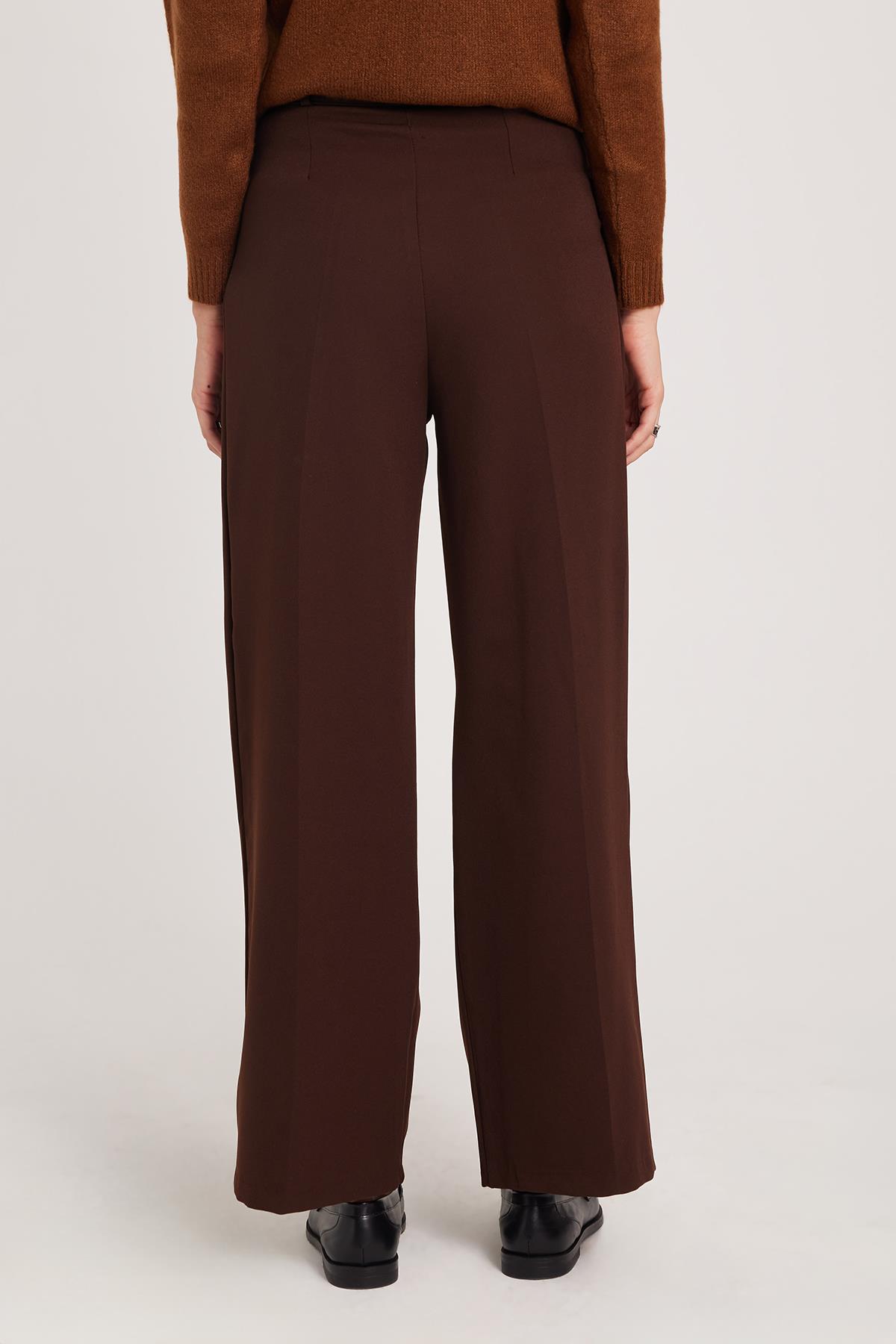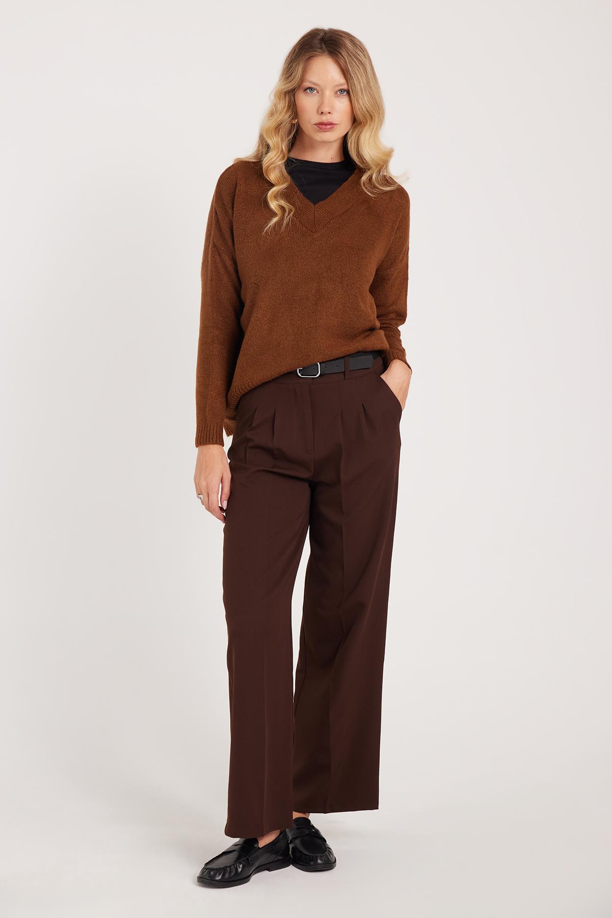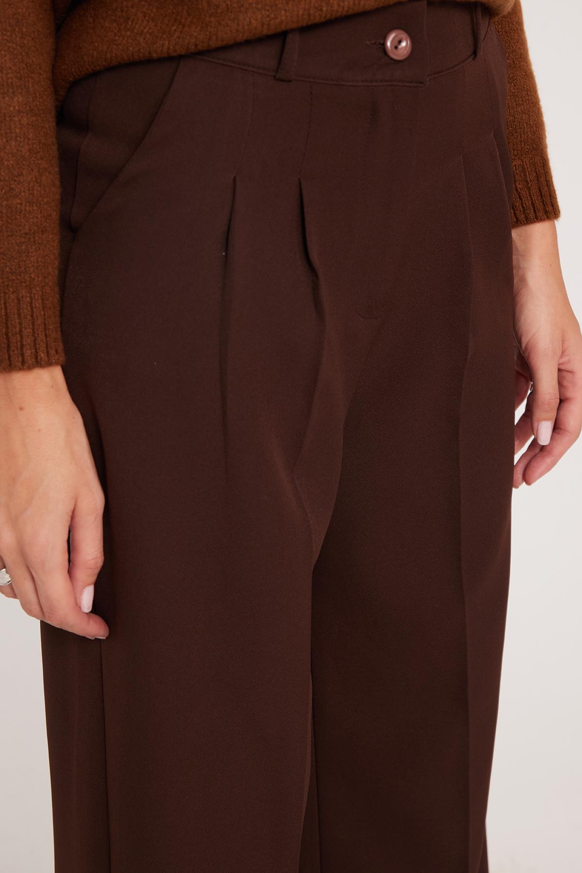 Kadın Regular Fit Klasik Kesim Yüksel Bel Geniş Paça Kahverengi Pantolon (PN250045-07)