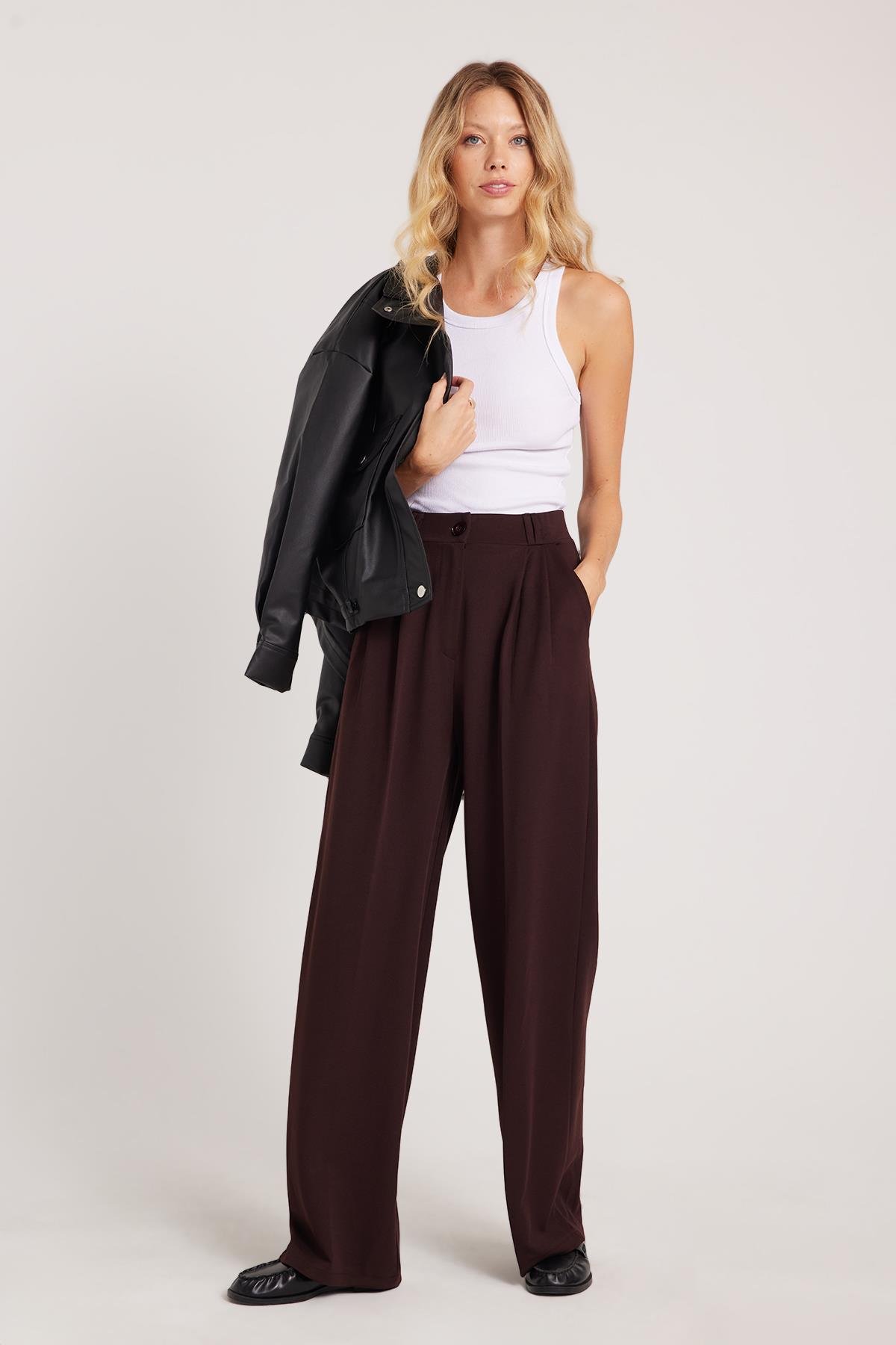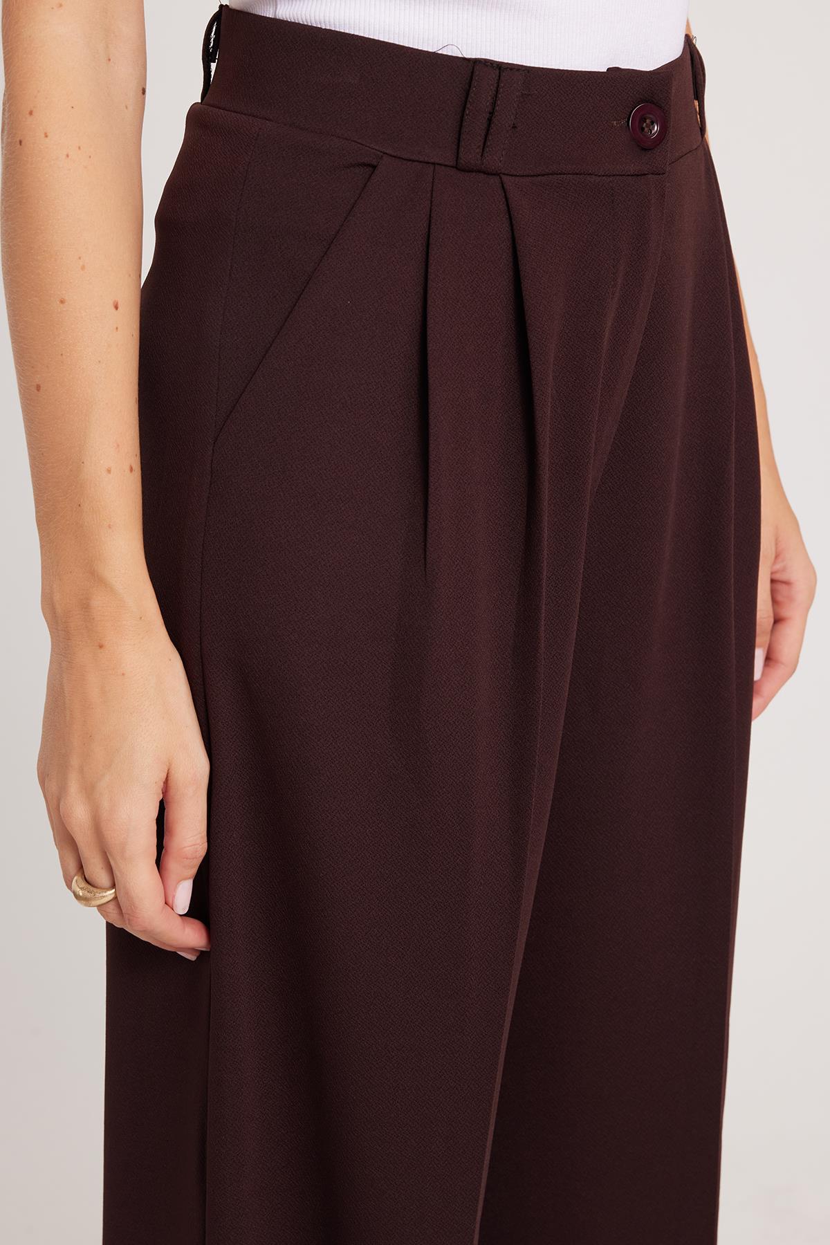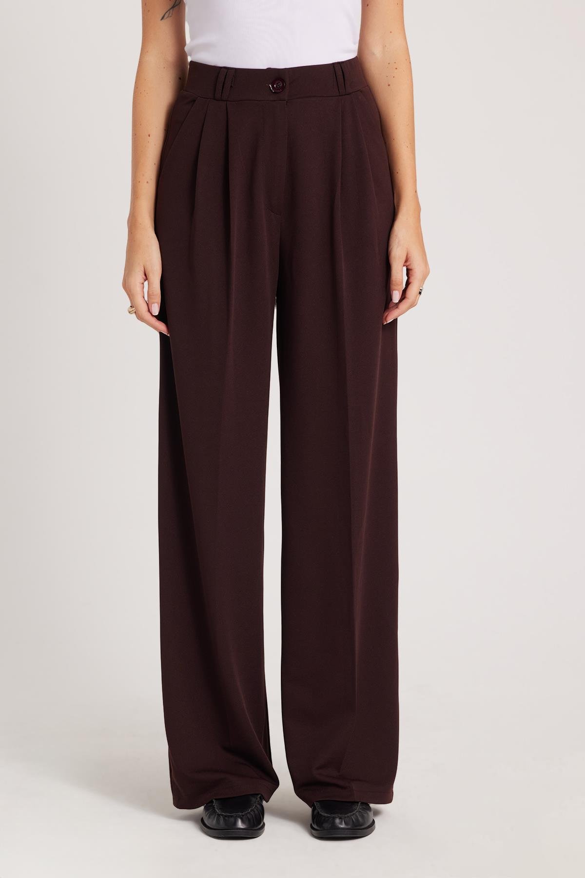 Kadın Regular Fit Klasik Kesim Yüksel Bel Geniş Paça Kahverengi Pantolon (PN250050-07)