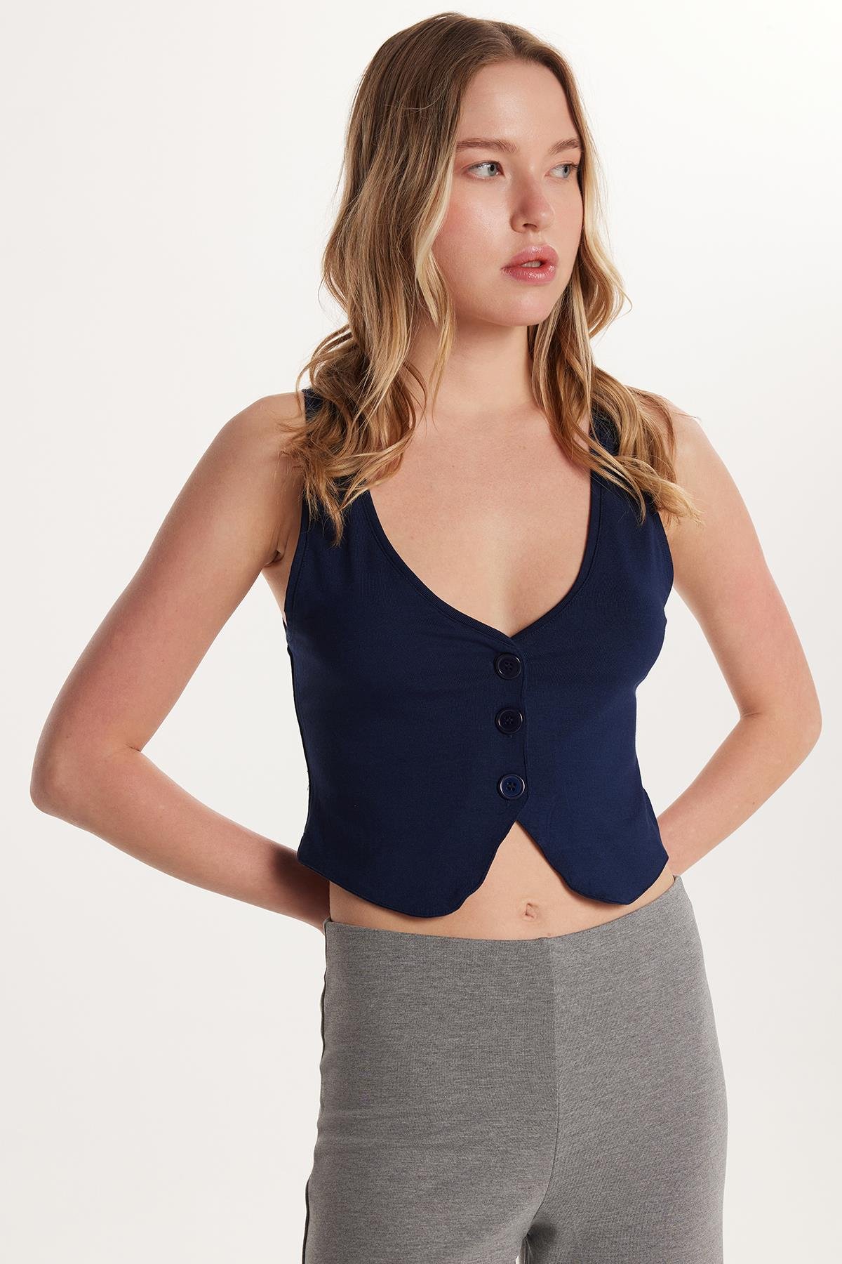 Kadın Regular Fit Sıfır Kol V Yaka Düğmeli Lacivert Yelek