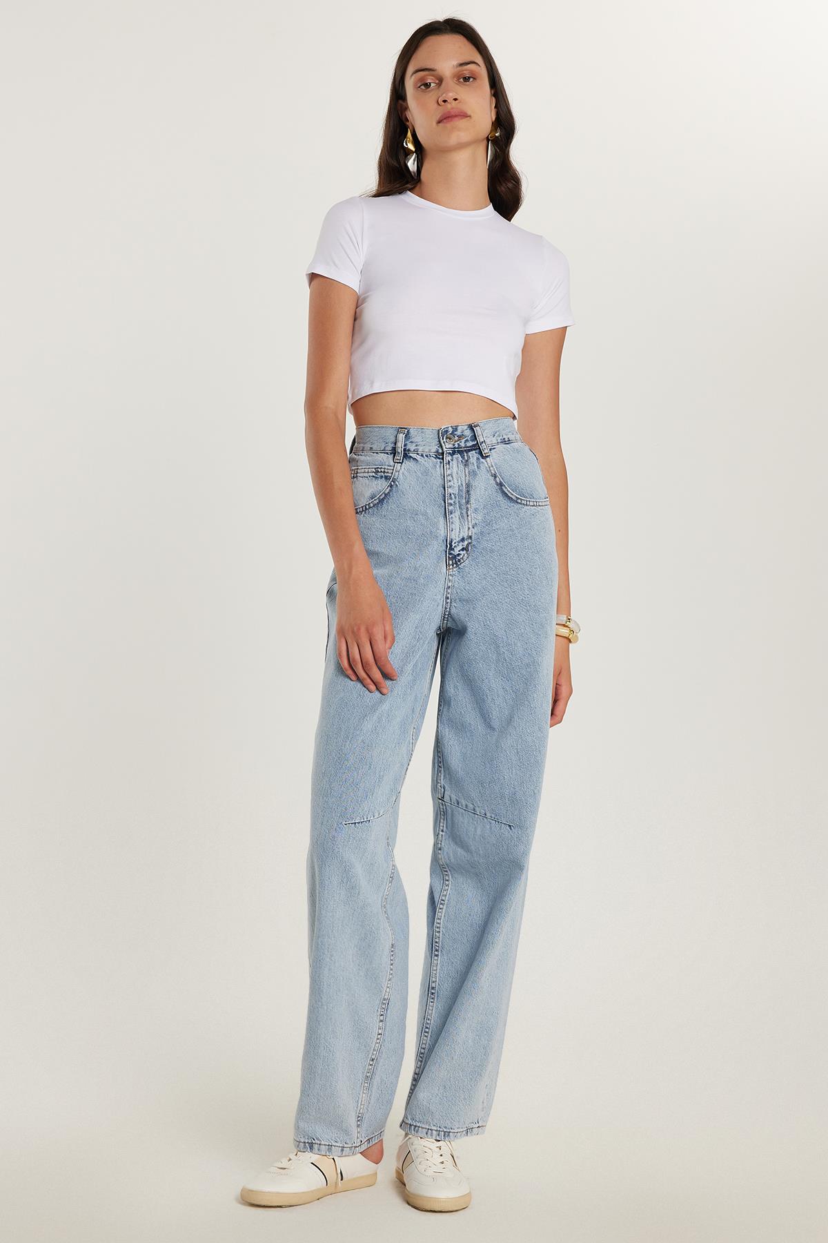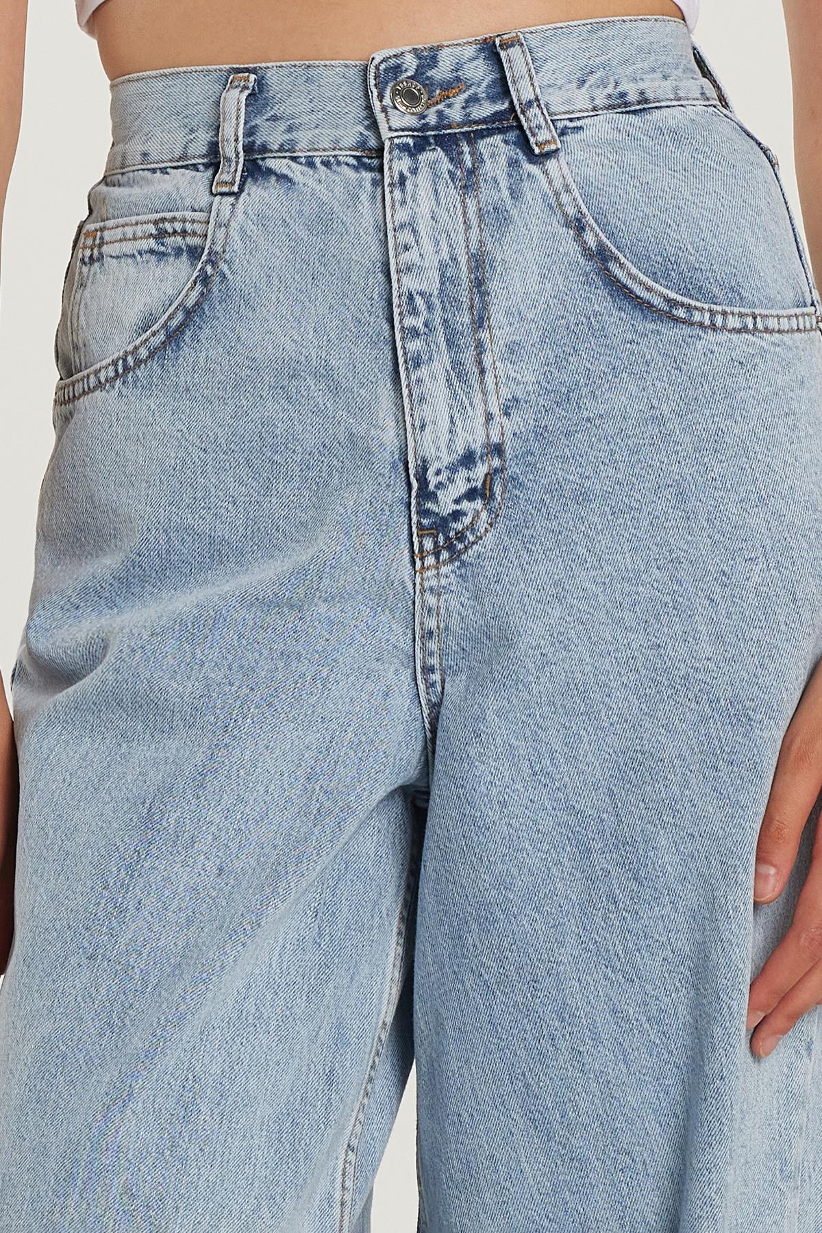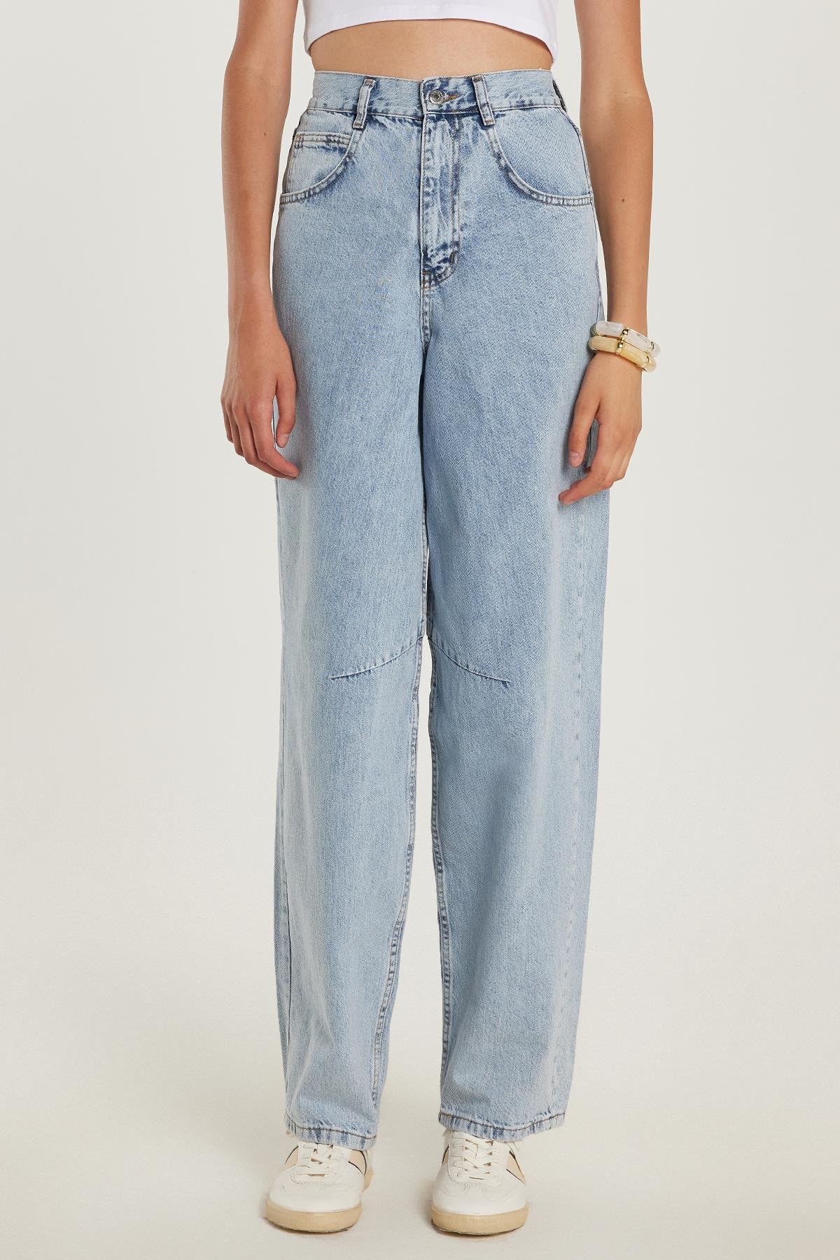 Kadın Regular Fit Tokalı Geniş Paça Baggy Mavi Jean Kot Pantolon