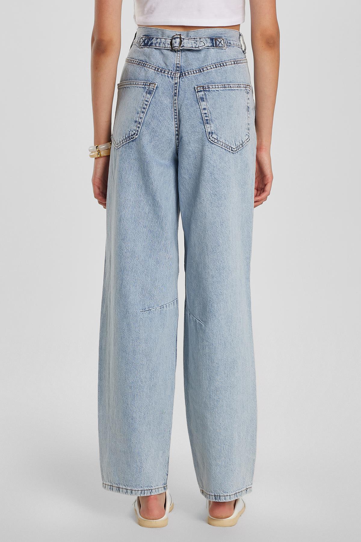 Kadın Regular Fit Tokalı Geniş Paça Baggy Mavi Jean Kot Pantolon (KDN25247-9001)