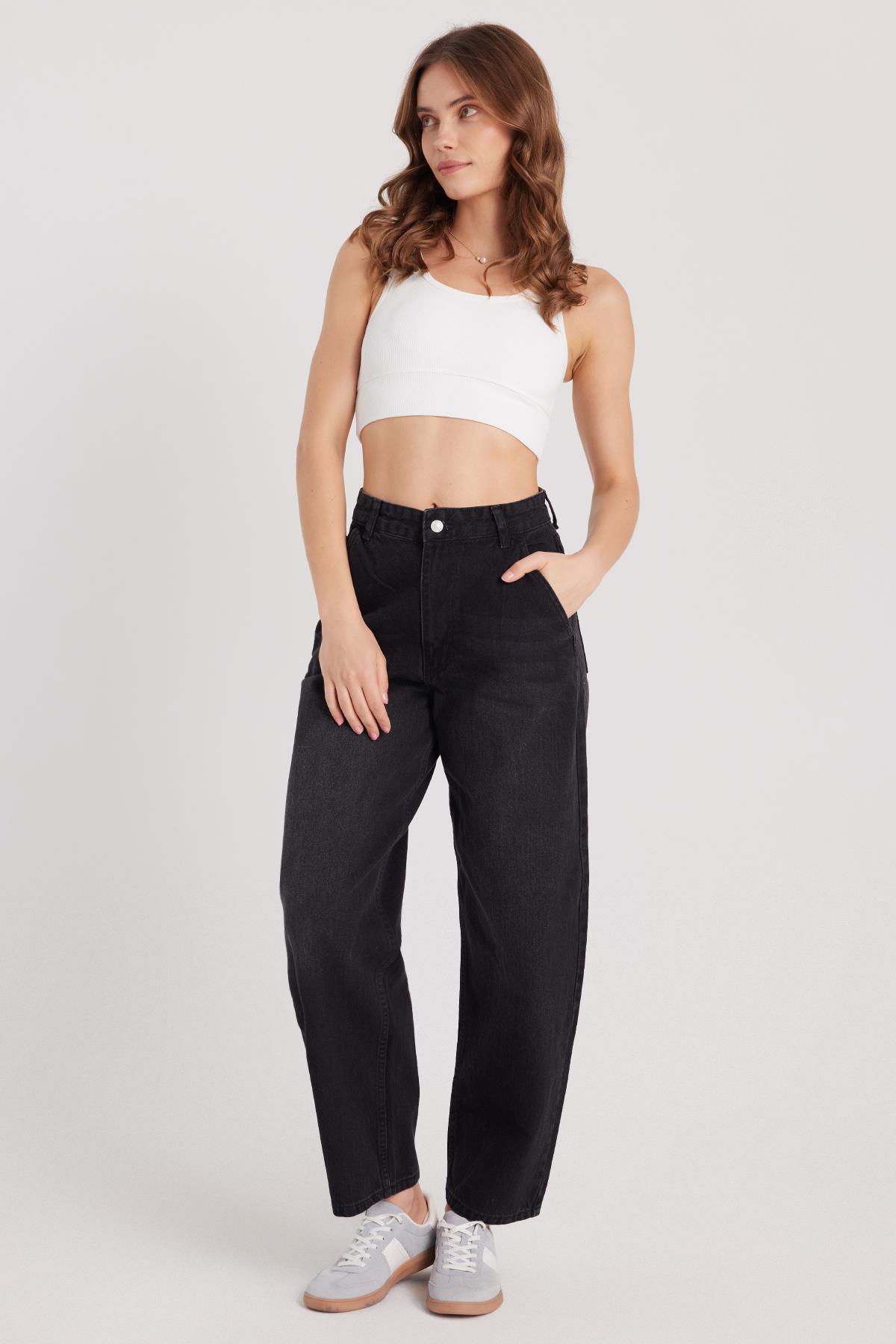 Kadın Regular Fit Yan Cepli Baggy Balon Siyah Jean Kot Pantolon