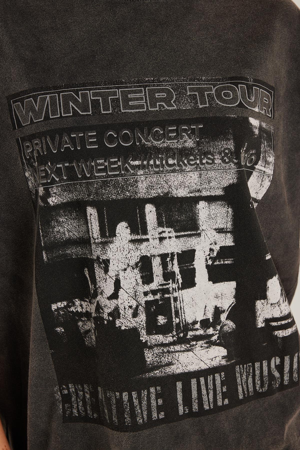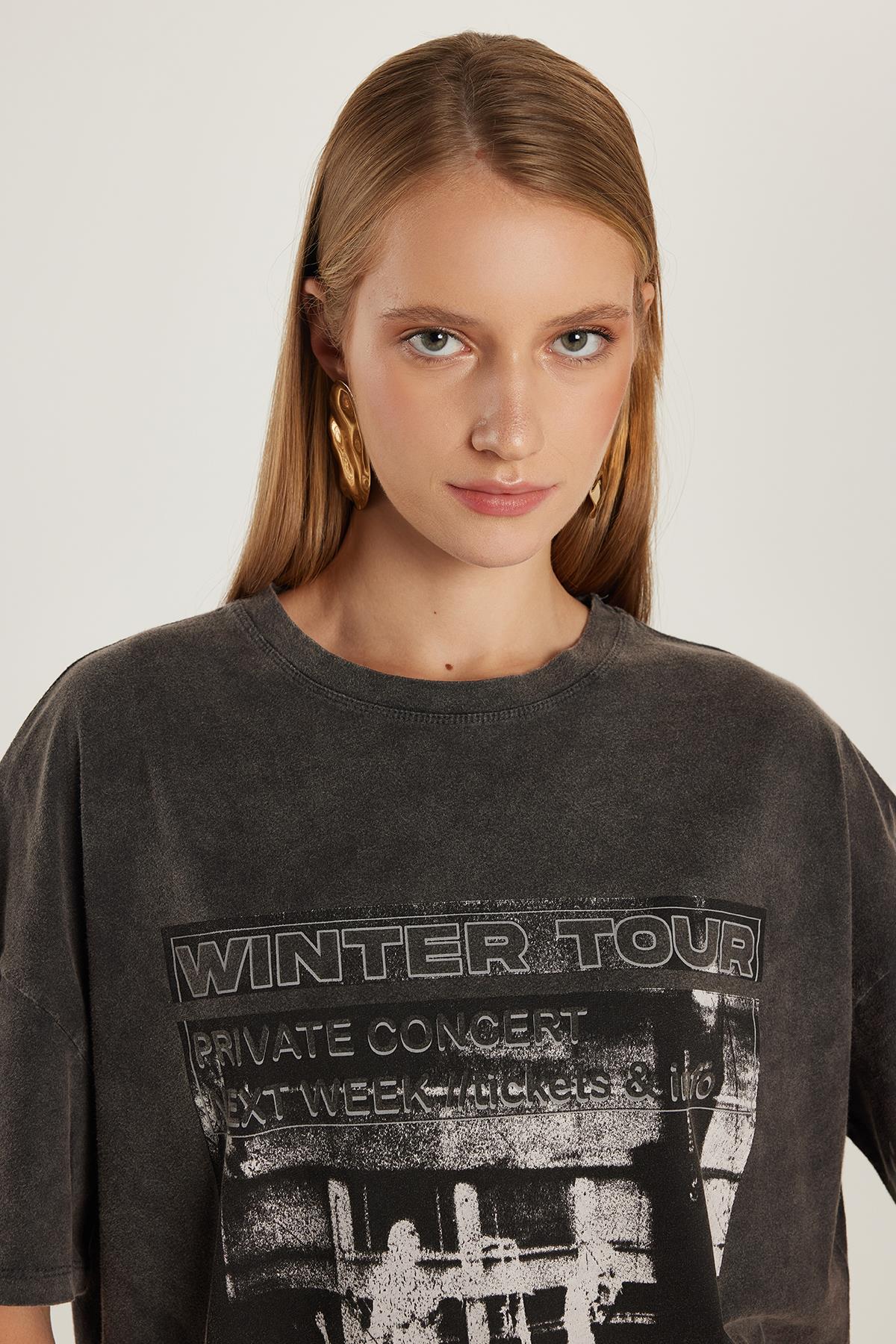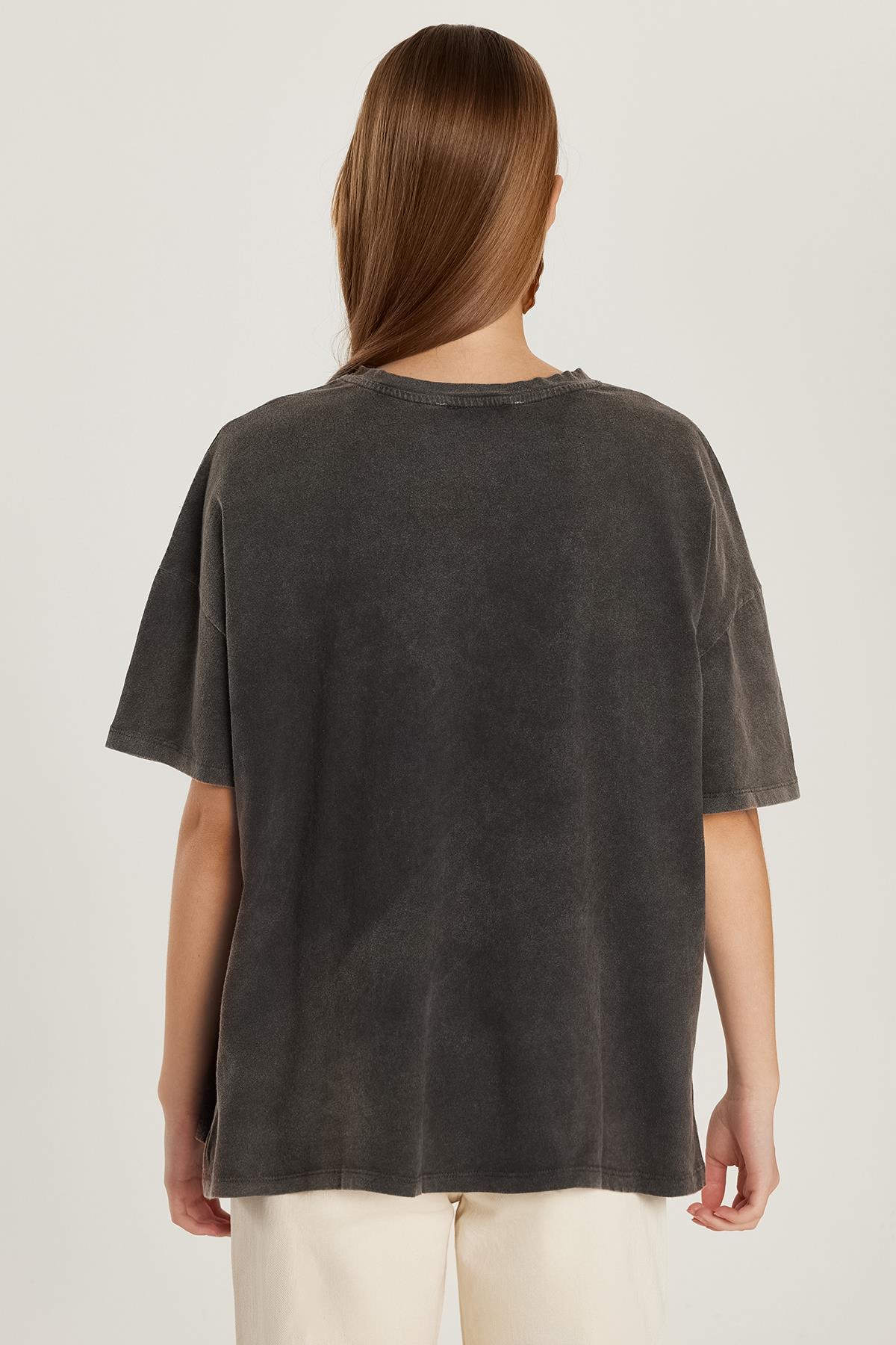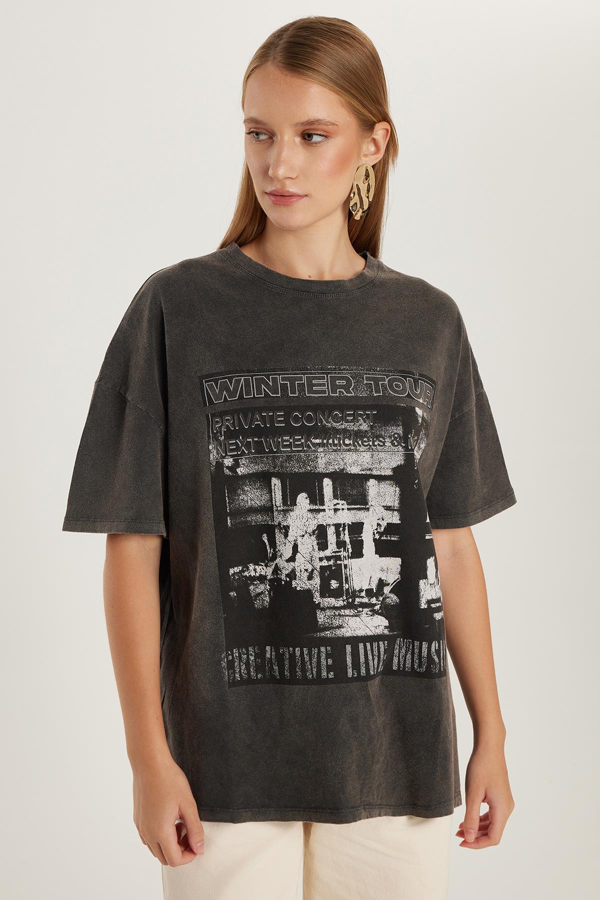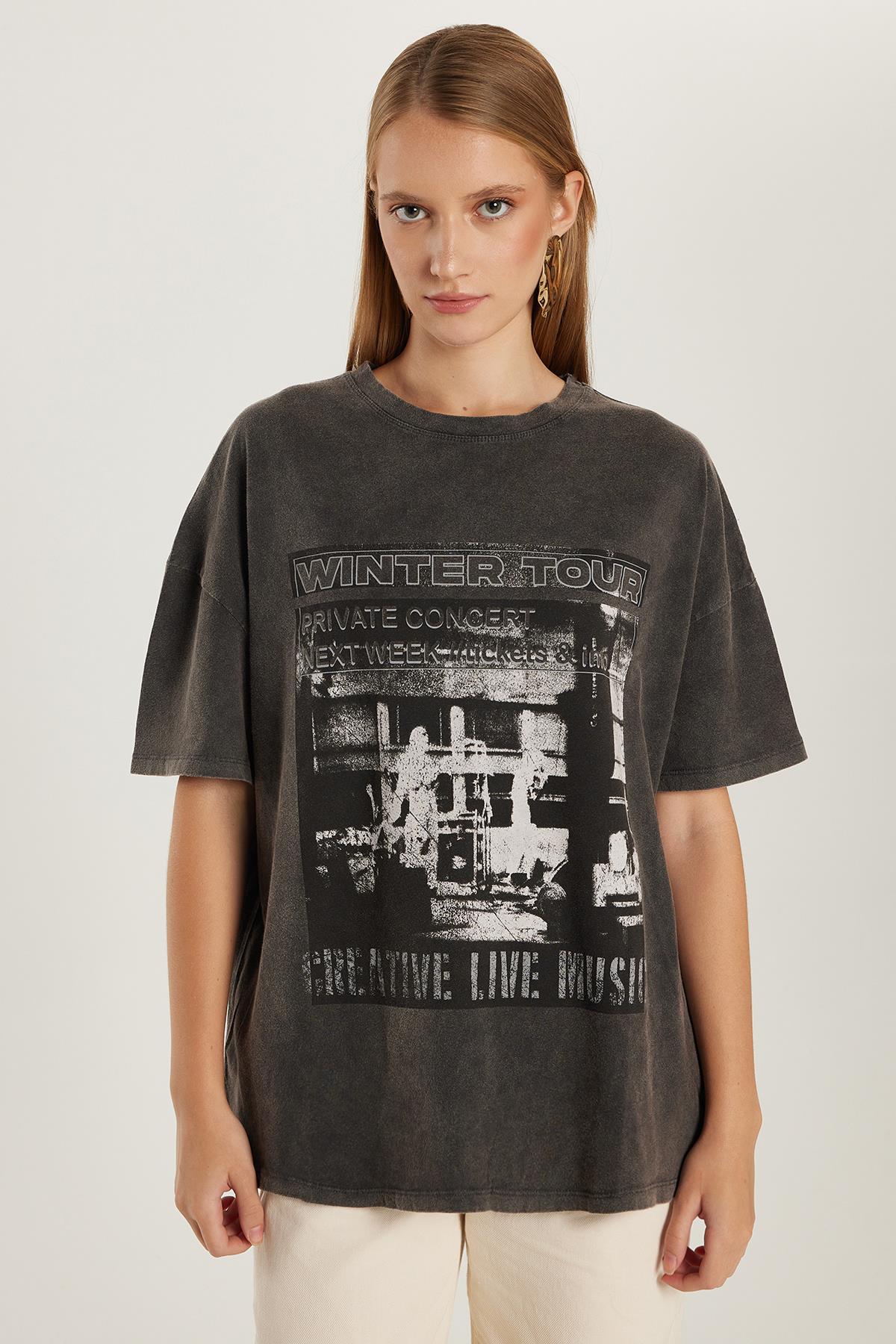 Kadın Relax Fit Rahat Kesim %100 Pamuk Kısa Kollu Bisiklet Yaka Baskılı Antrasit Tişört