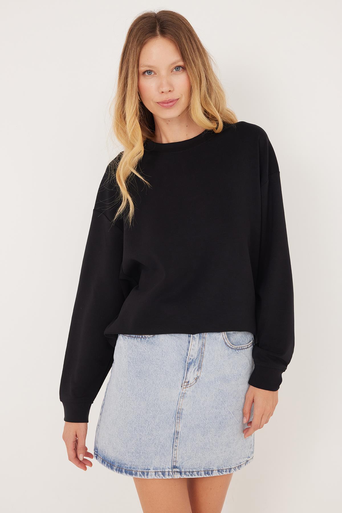 Kadın Relax Fit Rahat Kesim Bisiklet Yaka Siyah Sweatshirt (KDN25069-02)