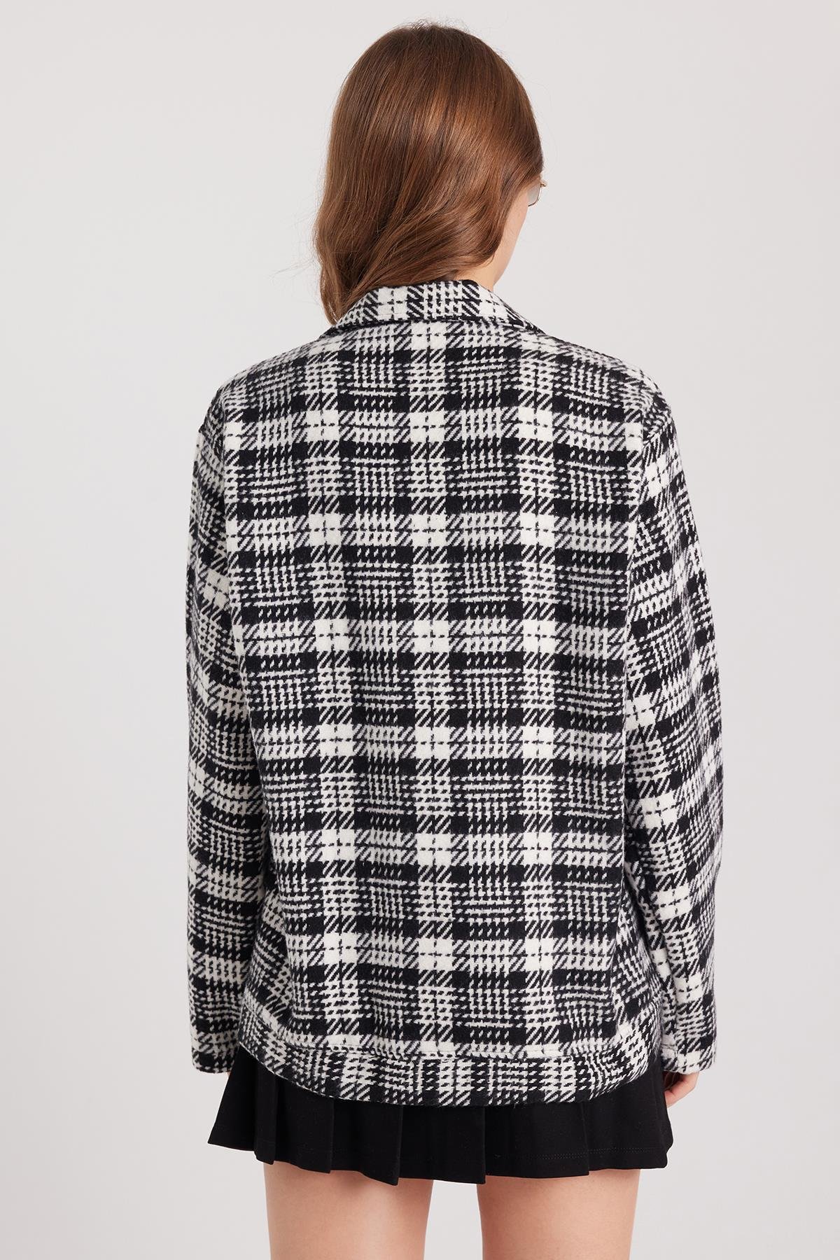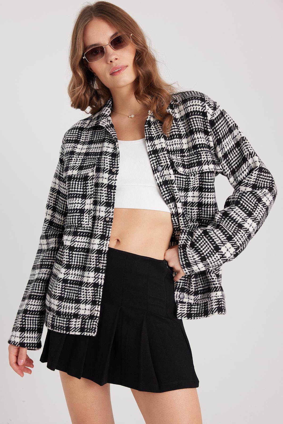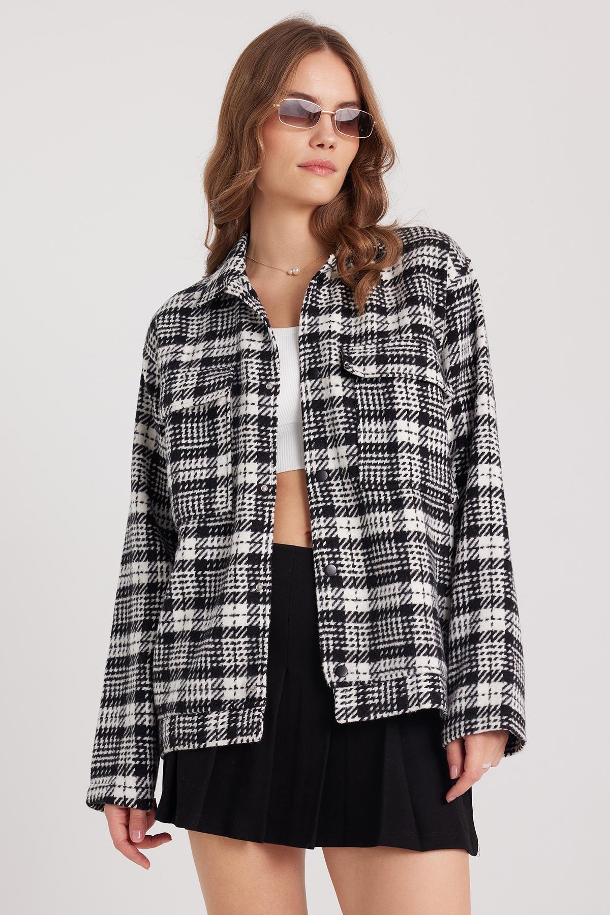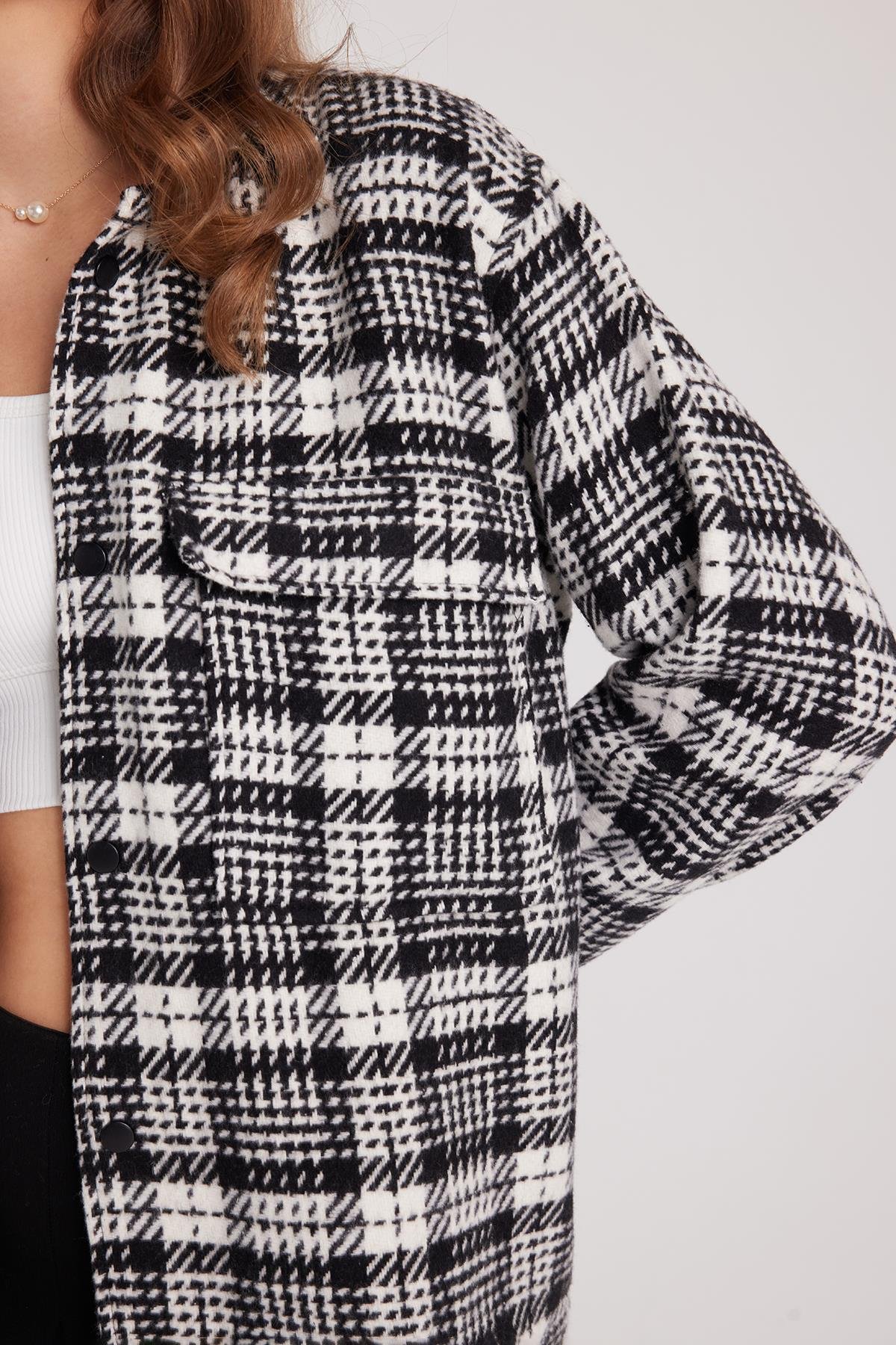 Kadın Relax Fit Rahat Kesim Çıtçıtlı Çift Cepli Kareli Kışlık Apaş Yaka Mont Gömlek (BYGM2573-7431)