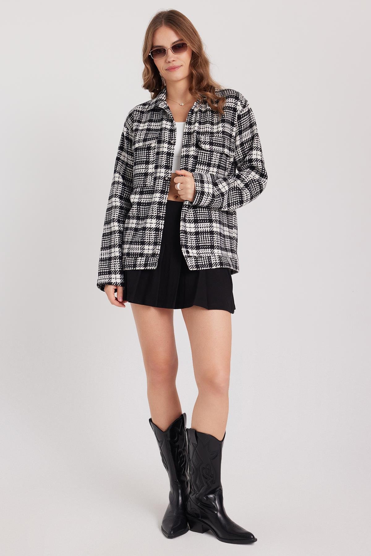 Kadın Relax Fit Rahat Kesim Çıtçıtlı Çift Cepli Kareli Kışlık Apaş Yaka Mont Gömlek