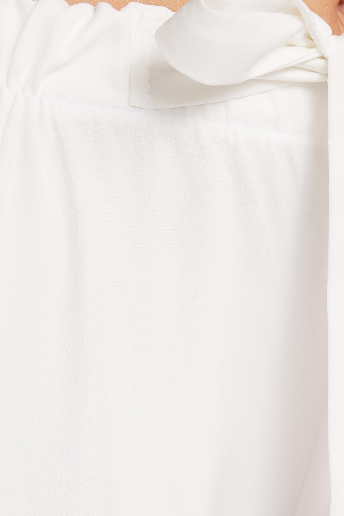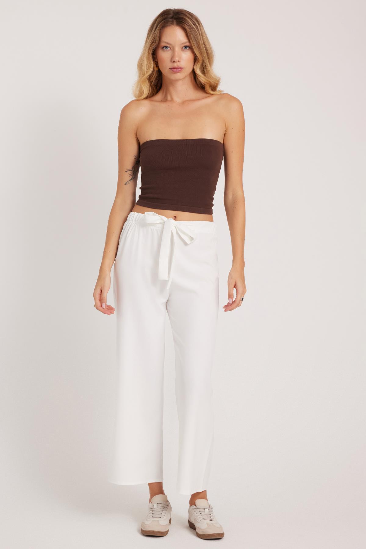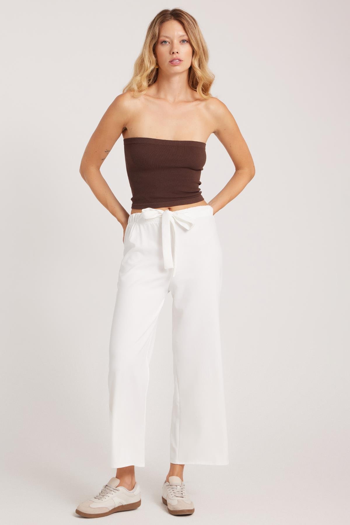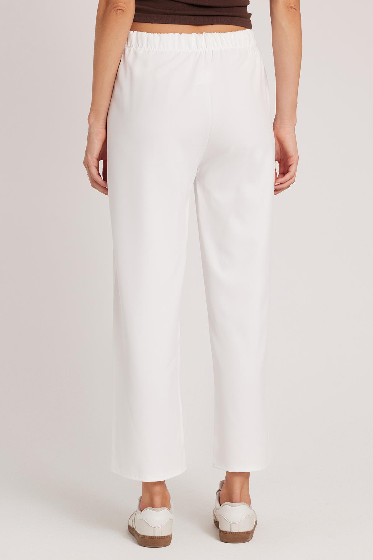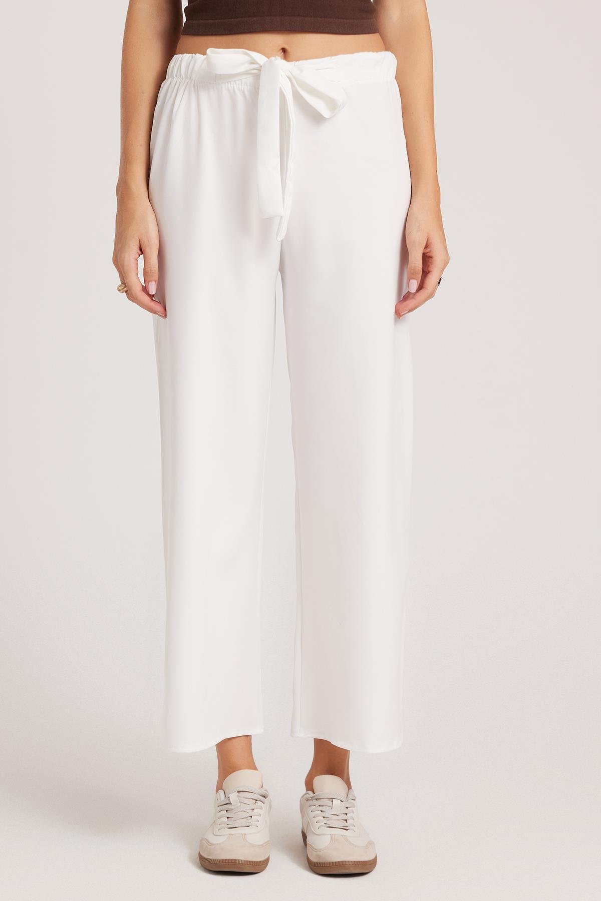 Kadın Relax Fit Rahat Kesim Lastikli Kuşak Bağlamalı Geniş Paça Beyaz Pantolon (PN250048-01)