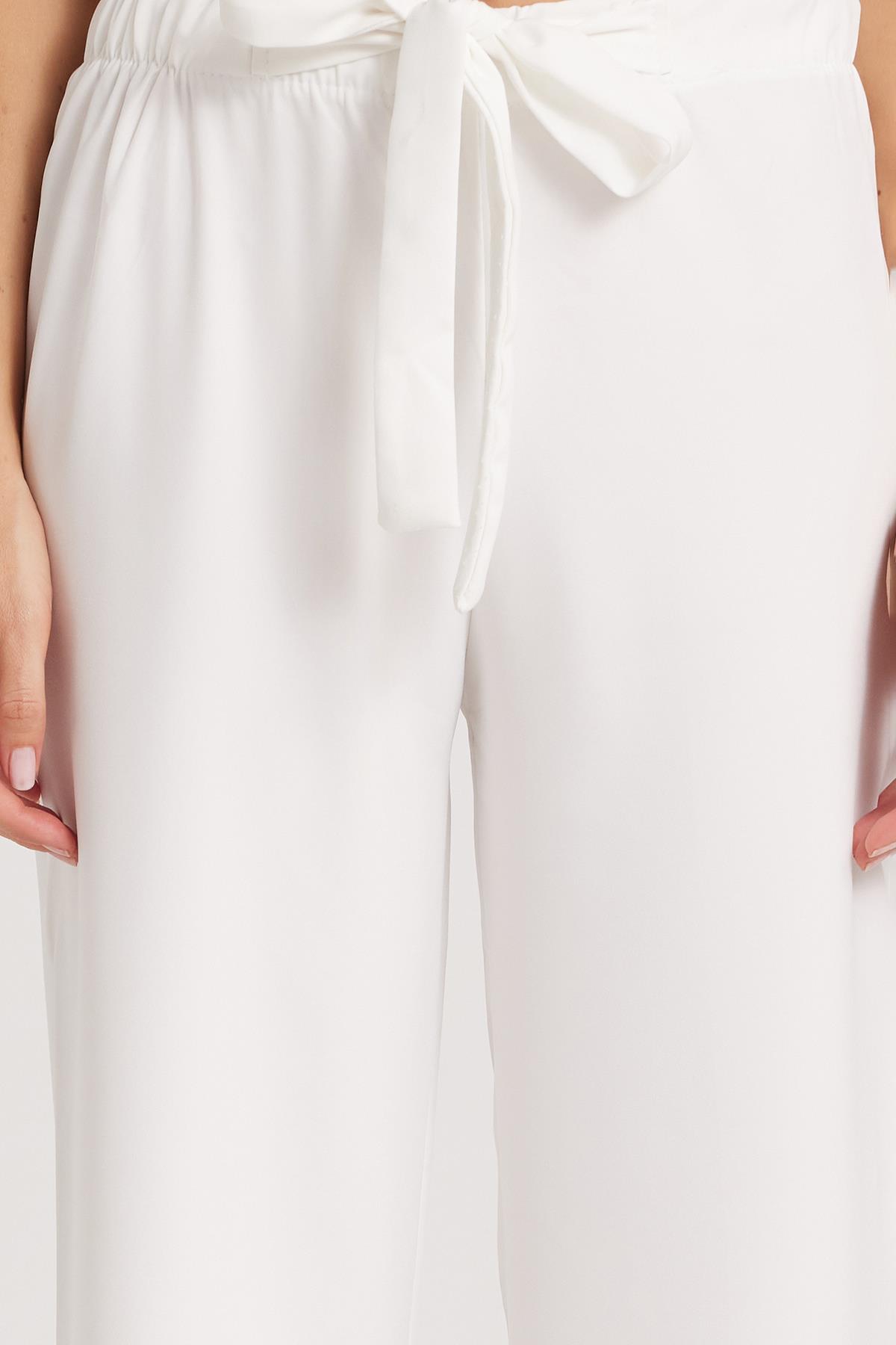 Kadın Relax Fit Rahat Kesim Lastikli Kuşak Bağlamalı Geniş Paça Beyaz Pantolon