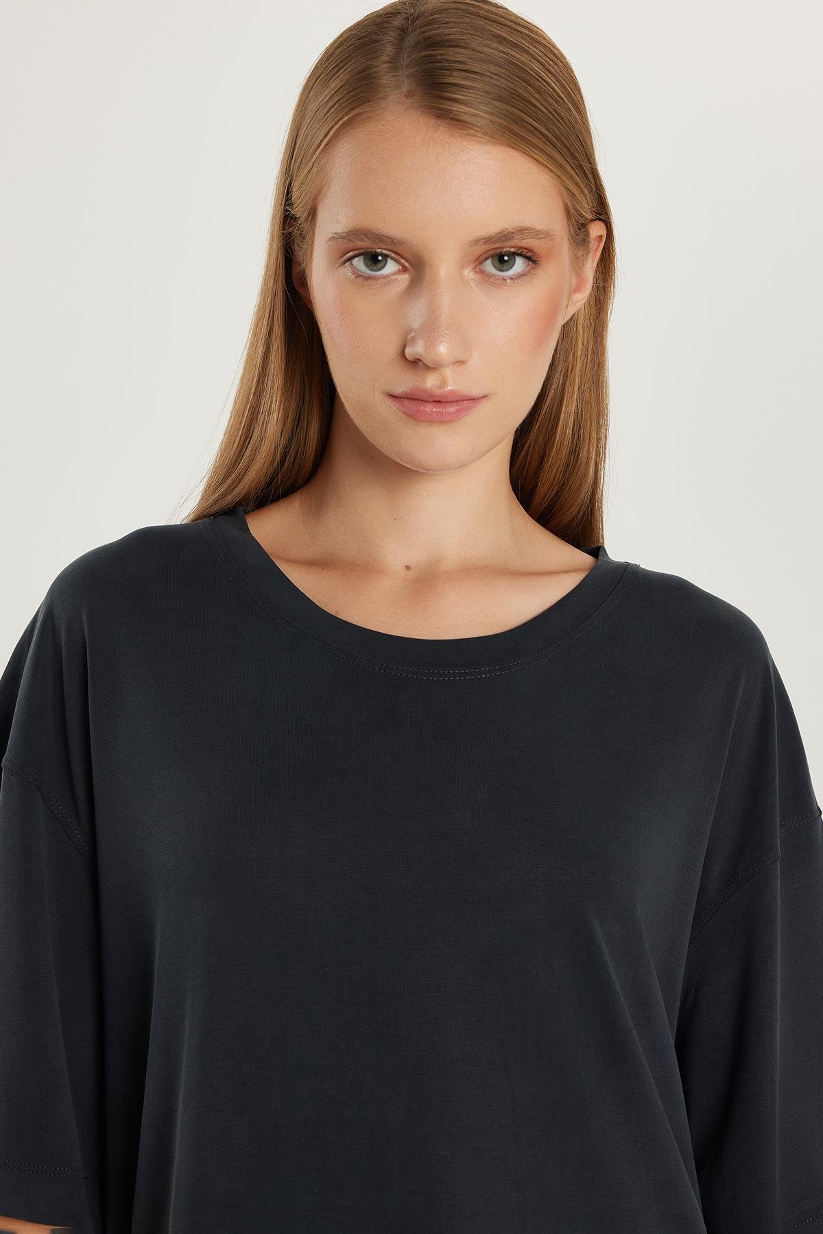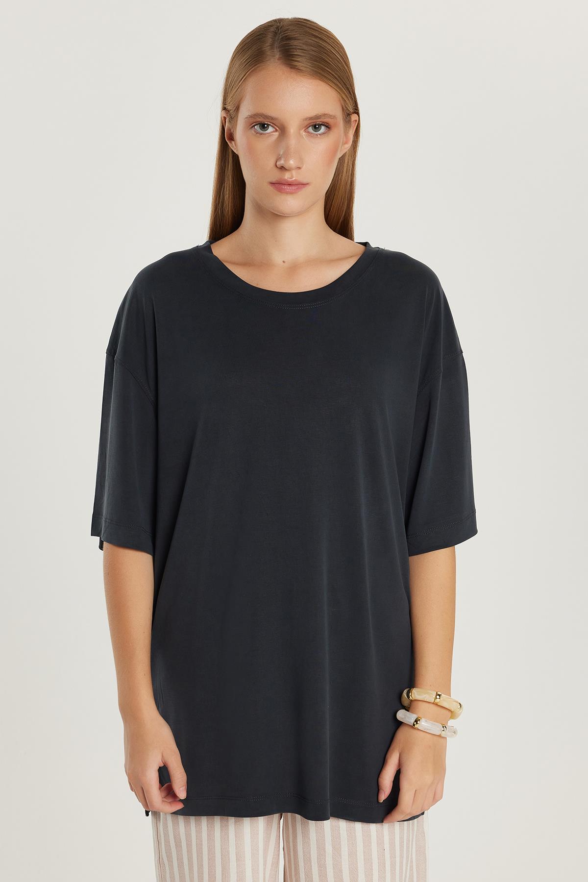 Kadın Relax Fit Rahat Kesim Modal Kumaş Bisiklet Yaka Antrasit Tişört