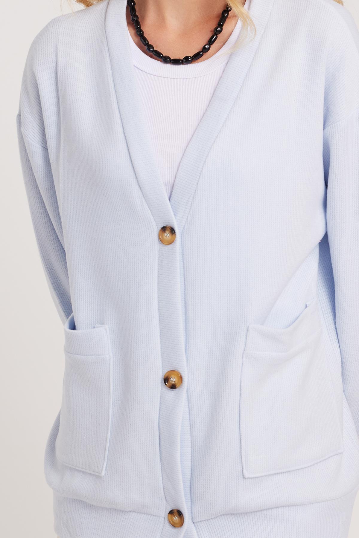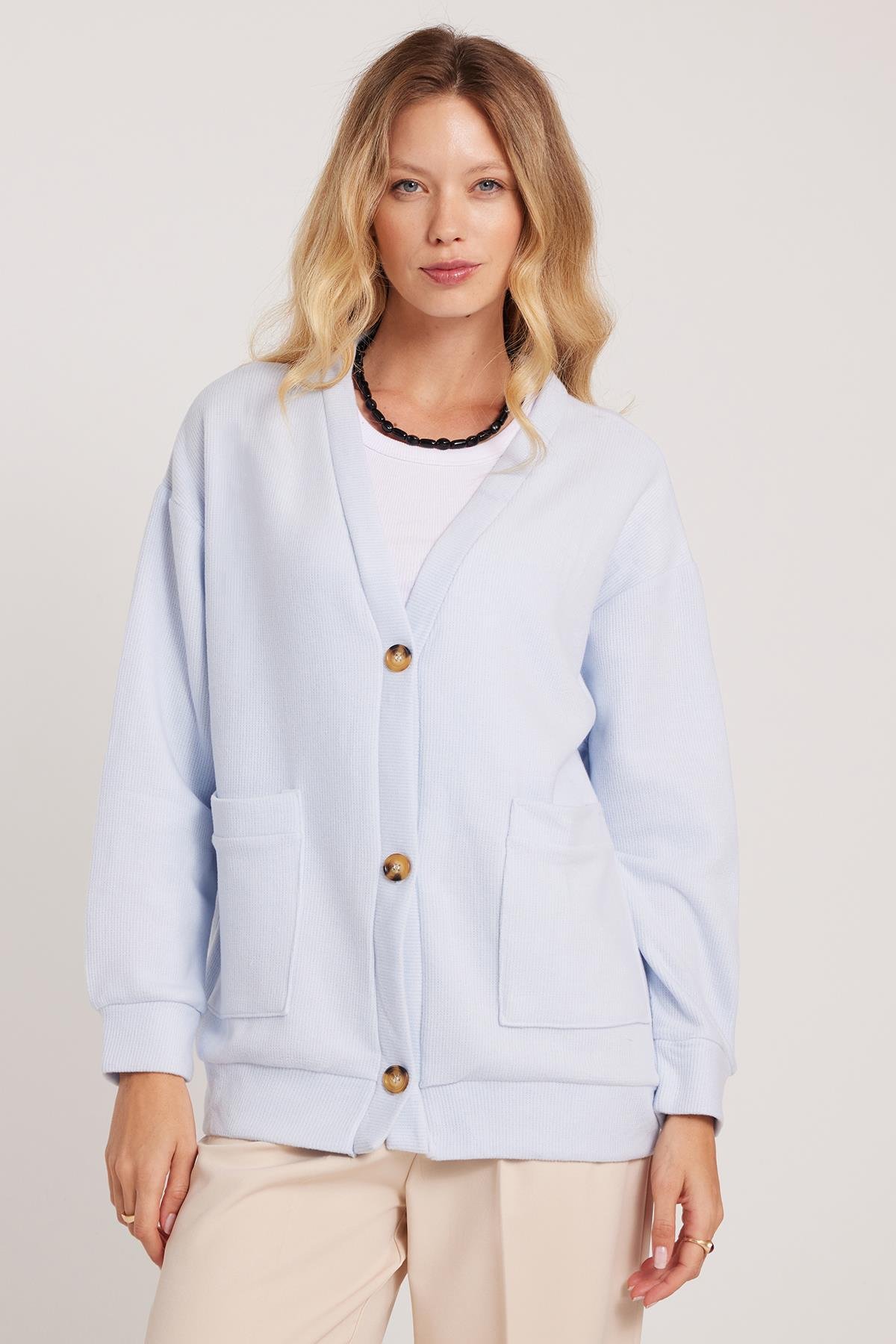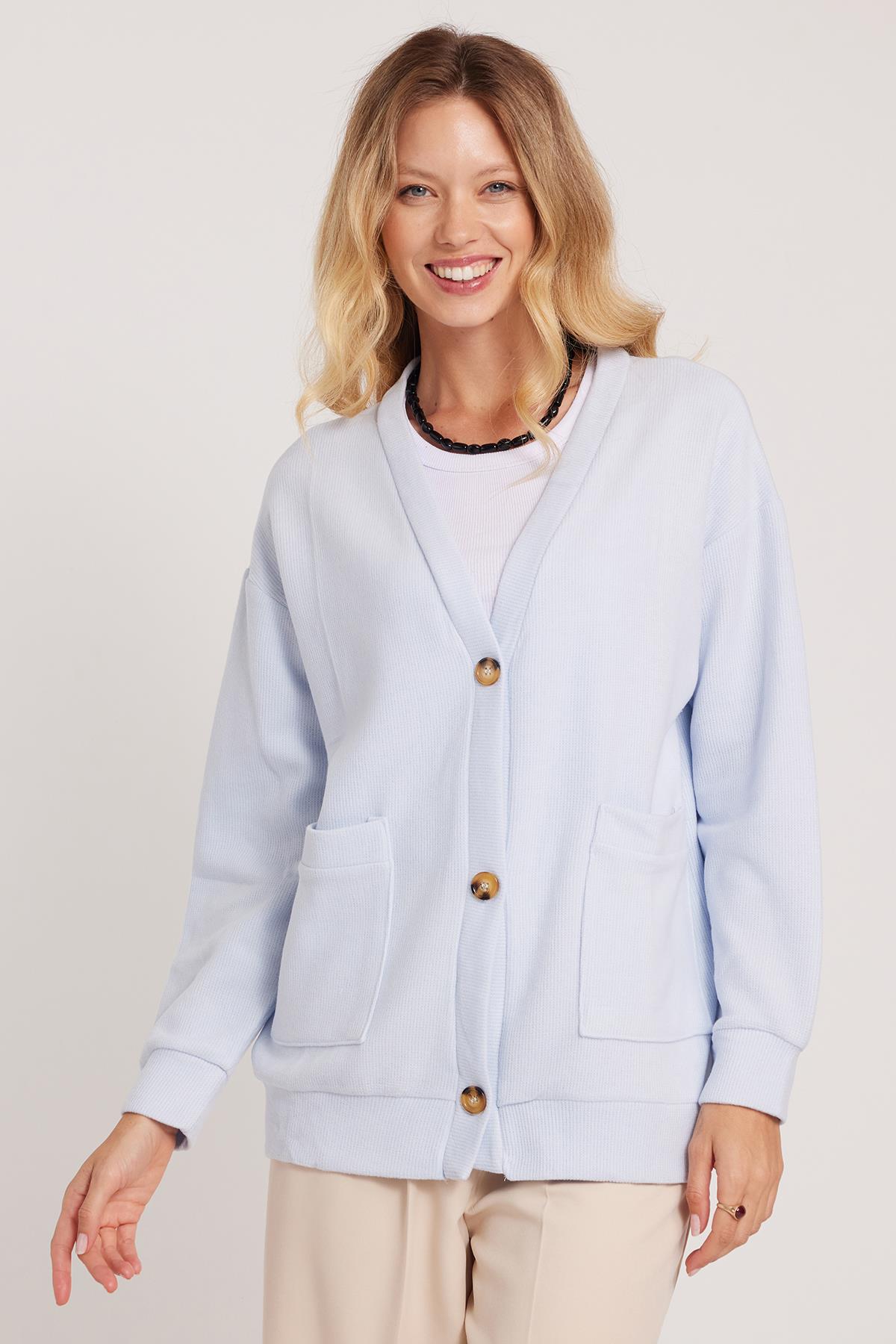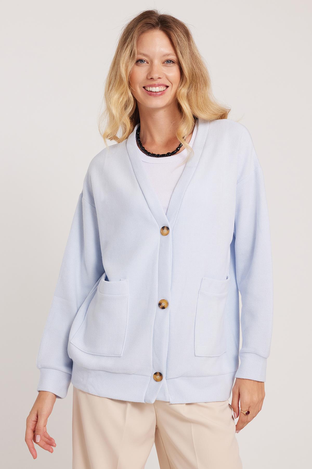 Kadın Relax Fit Rahat Kesim Örme Kumaş Çift Cepli V Yaka Mavi Hırka (BYKZ2527-BB1)