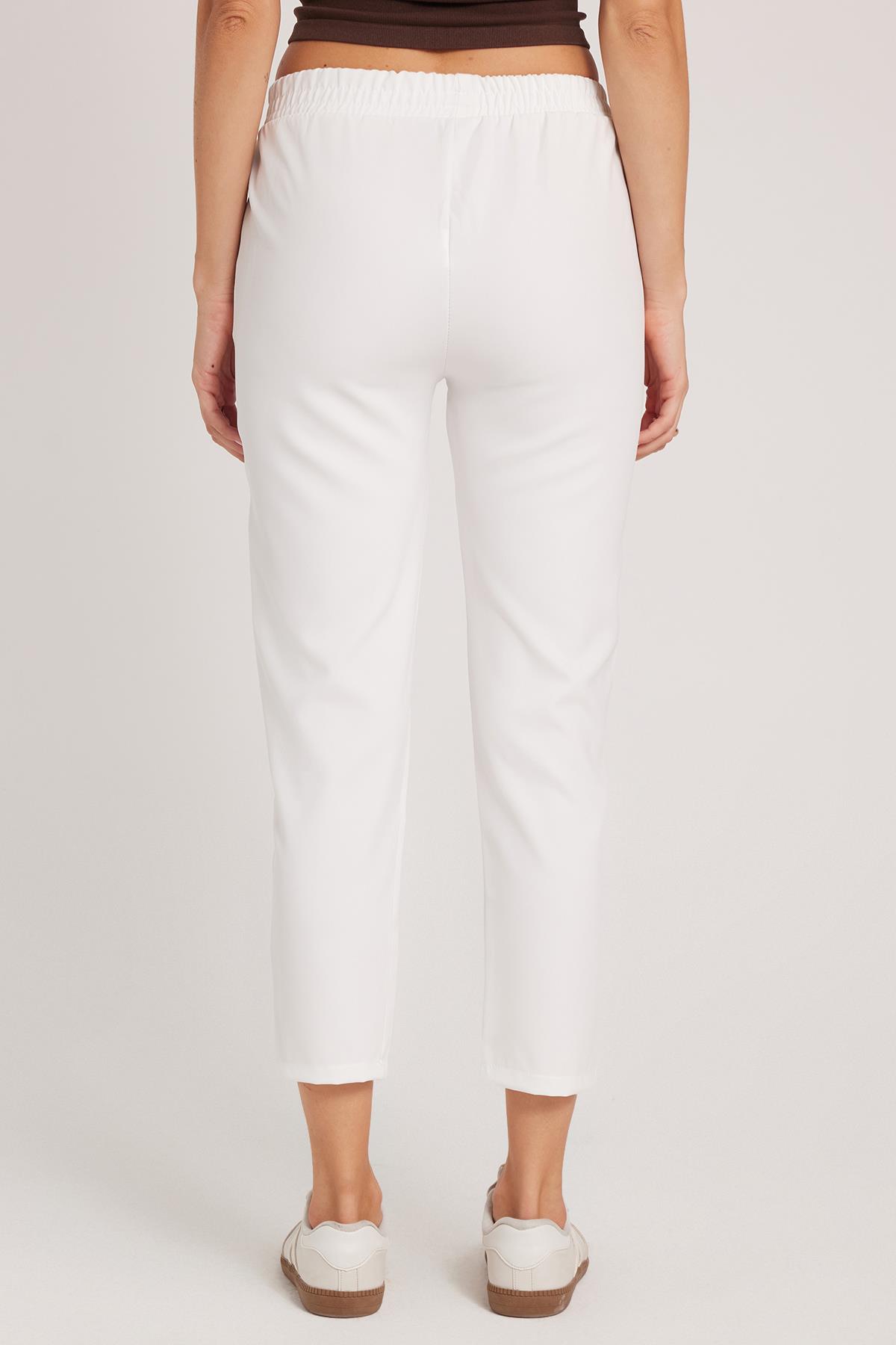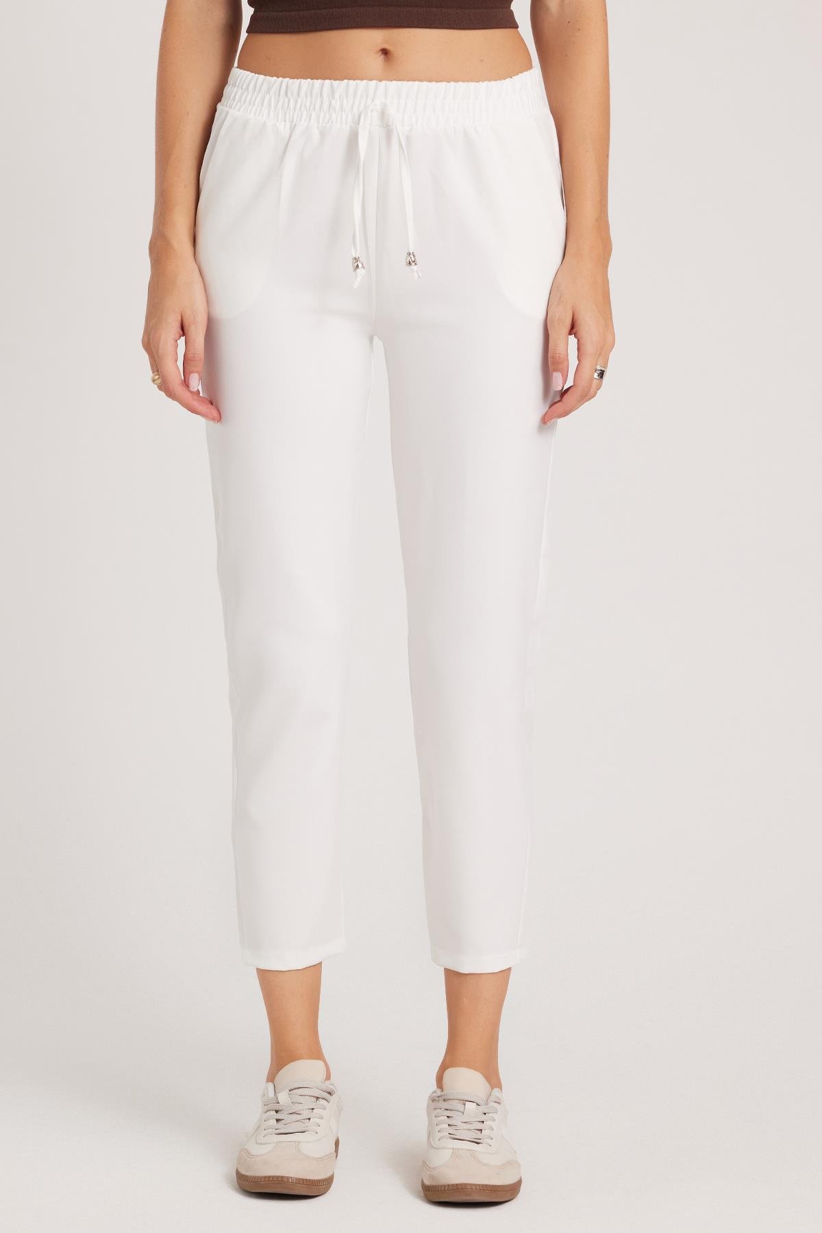 Kadın Relax Fit Rahat Kesim Yüksel Bel Dar Paça Beli Lastikli Bağcıklı Beyaz Pantolon (PN250046-01)