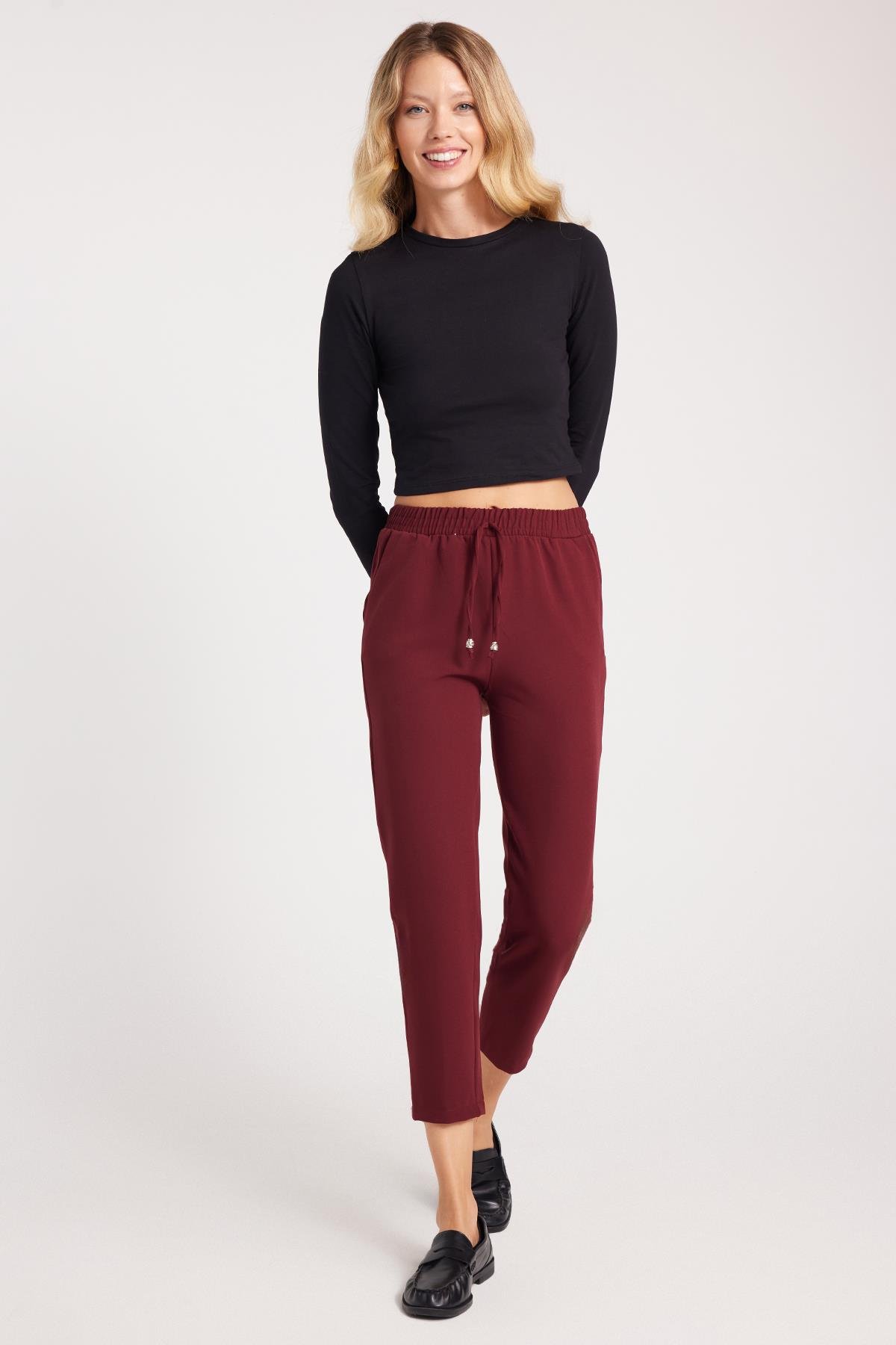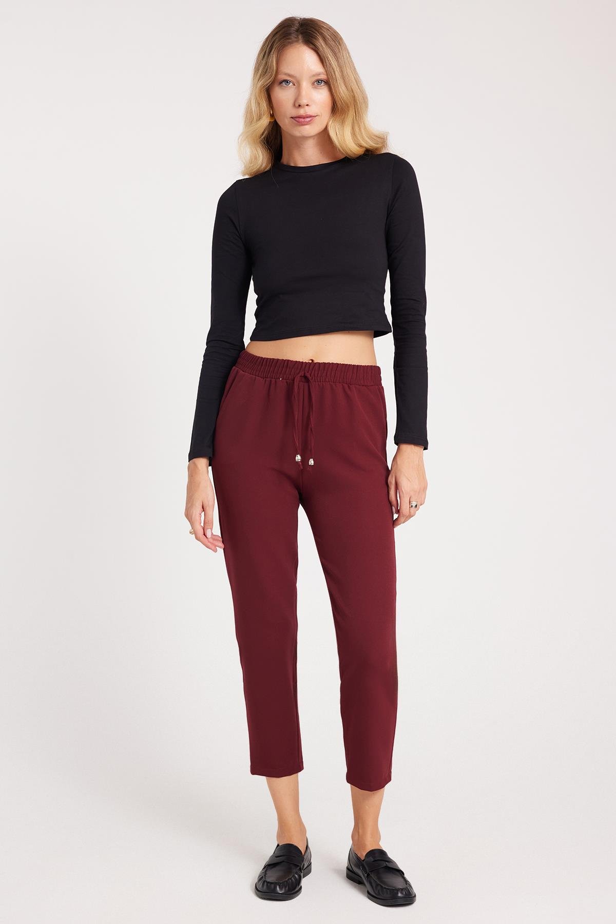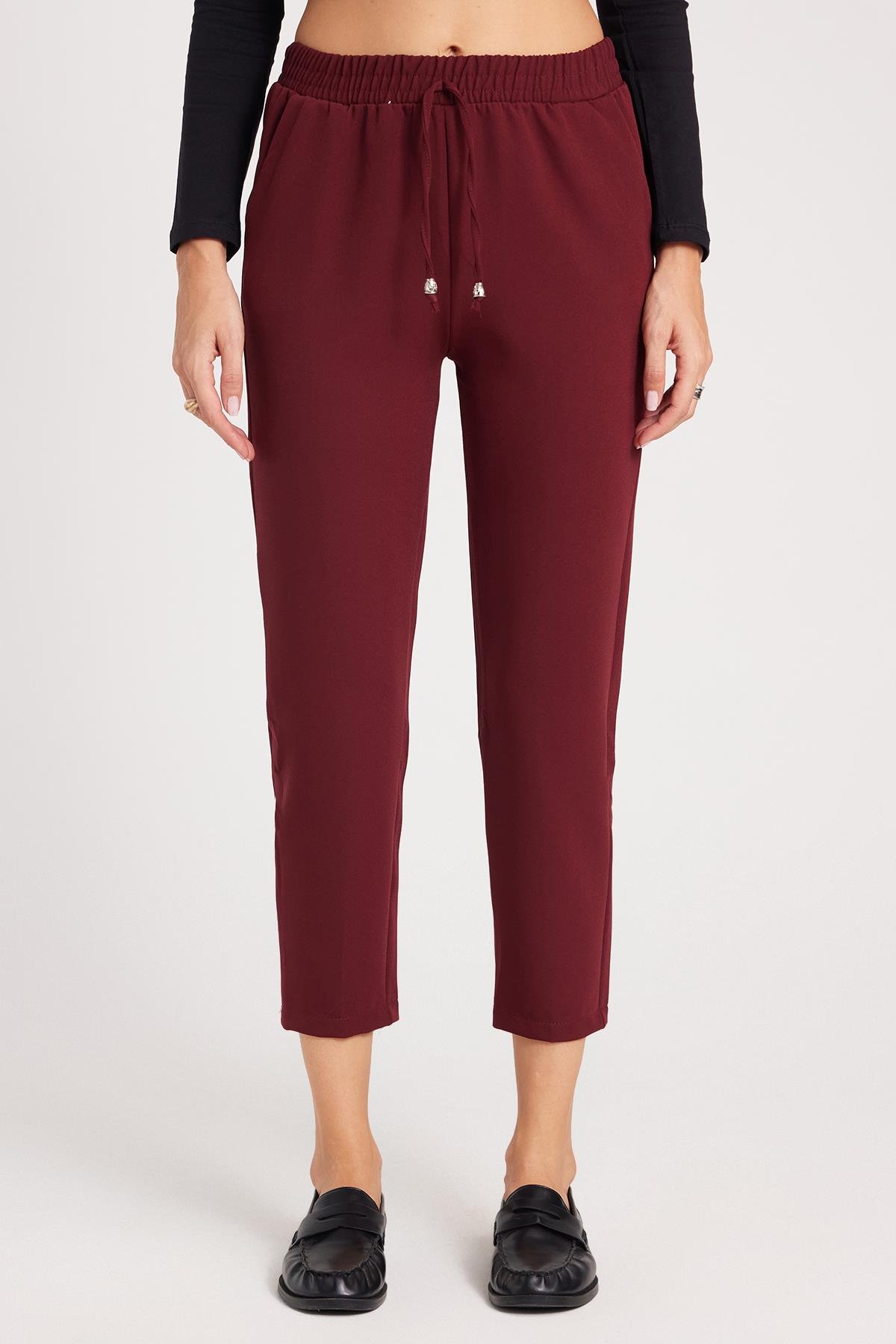 Kadın Relax Fit Rahat Kesim Yüksel Bel Dar Paça Beli Lastikli Bağcıklı Bordo Pantolon (PN250046-08)
